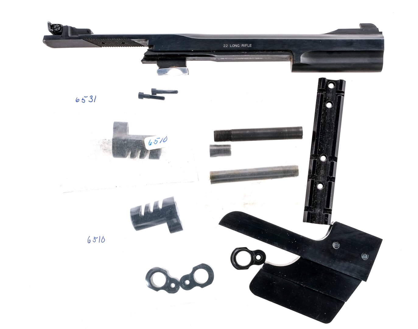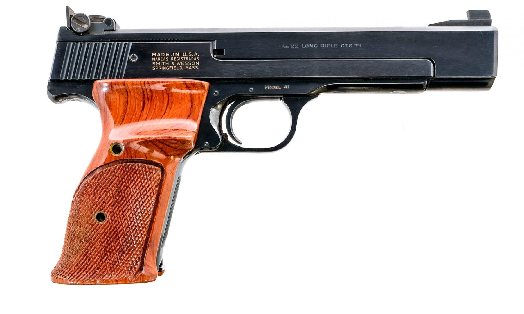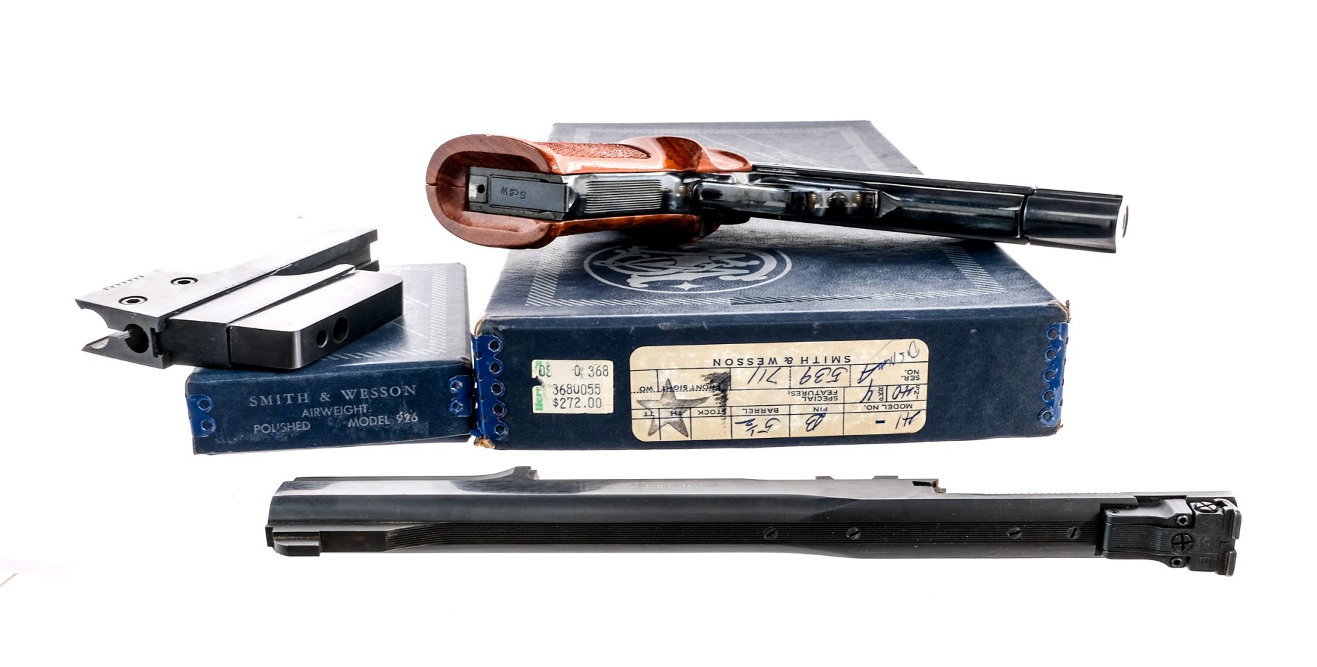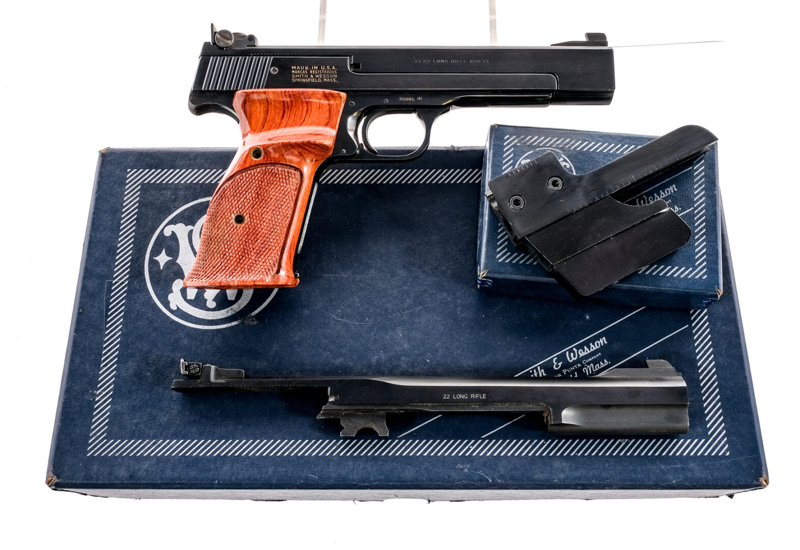 Description Smith & Wesson Model 41 in .22 Long Rifle with one, ten round removable magazine and a 5.5″ barrel. Checkered wood grip plates with finger contour. Blued trigger guard, serrated trigger, serrated slide and barrel. Lower left side of frame located checkered magazine release button. Left side of frame slide release and slide stop safety. Rear adjustable and front fixed blade sight. Comes in its factory box with written serial number, extra box with 7″ S&W barrel, weights and muzzle breaks. Must ship to a FFL holder. Condition: Good with light scratches, touches of rust and handling wear. Touch of rust on the extra barrel. Both barrels have clean rifled bores. Barrel Length: 5.5″ Serial: A539711 Manufacturer: Smith & Wesson Caliber: .22 LR Model: 41 Year-Range 1978-1979 Book# 02004