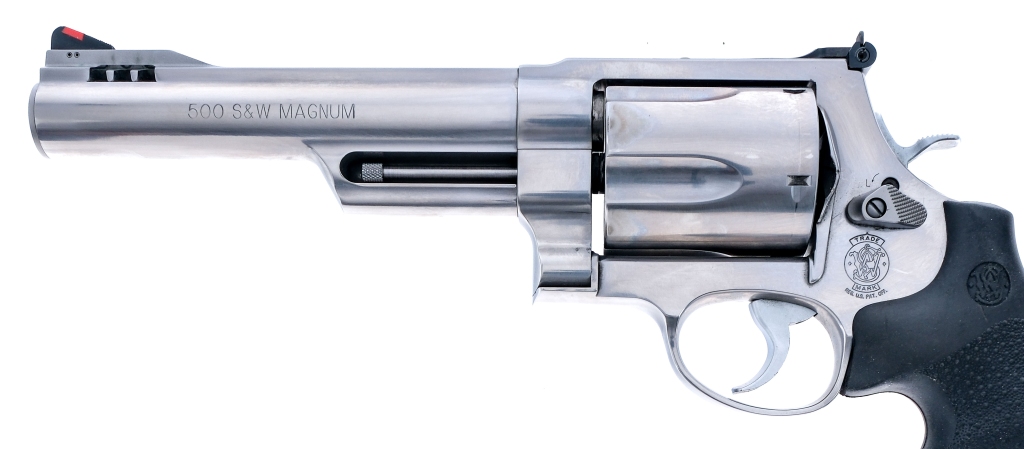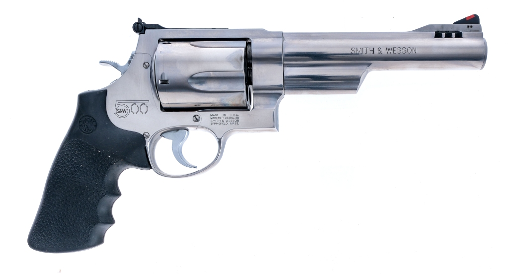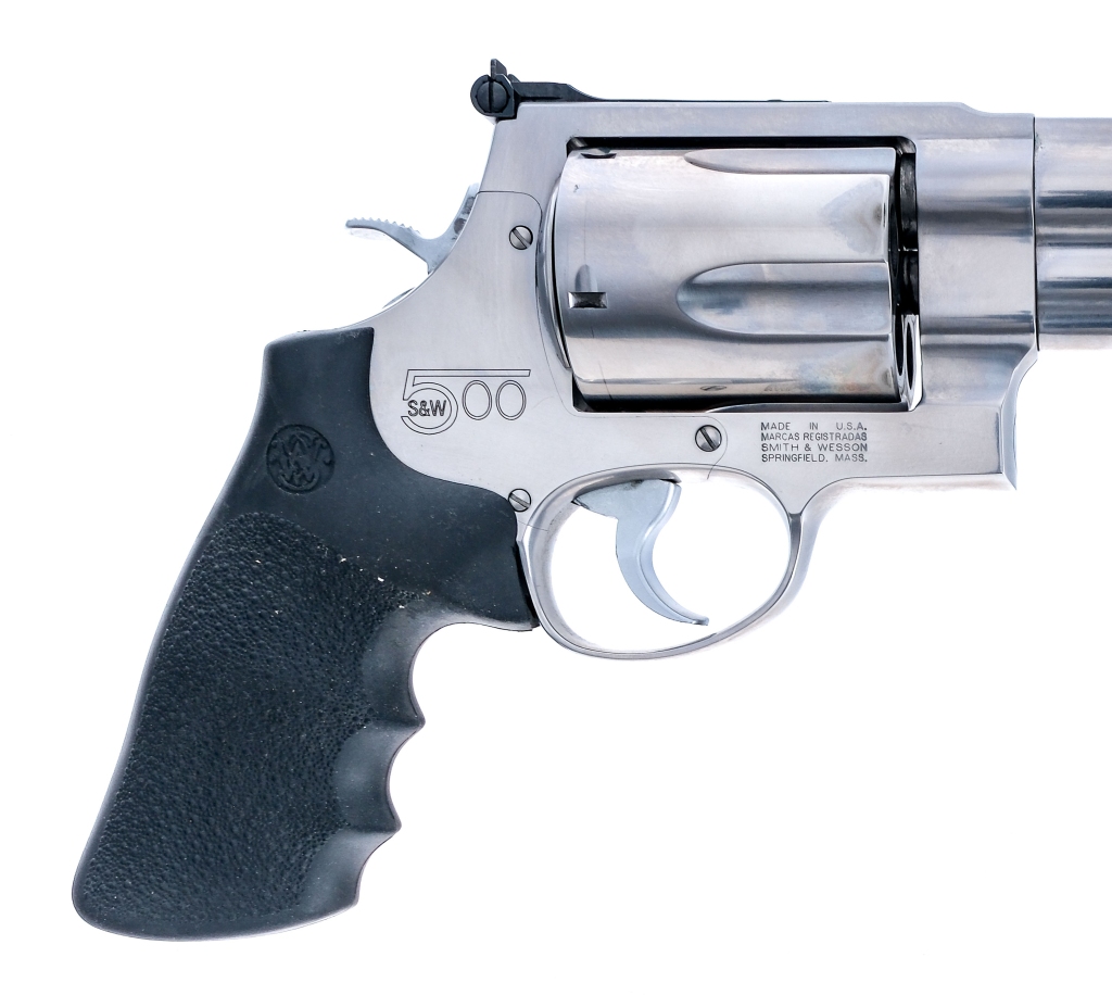 Description Smith & Wesson 500 chambered in .500 S&W Magnum with a five-shot cylinder and a 6.5″ ported barrel. Stainless steel barrel, frame, fluted cylinder, double action trigger, and hammer. Pebble textured rubber Hogue grips. Adjustable rear U-notch and fixed front blade. Comes in its factory box with paperwork. Must ship to a FFL holder. Condition: Very Good with light scratches, contact marks, and handling wear. Light cylinder turn line and operational wear. Bright and clean rifled bore. Barrel Length: 6.5″ Serial: DLB0336 Manufacturer: SMITH & WESSON Caliber: .500 S&W Magnum Model: 500 Book# 08377