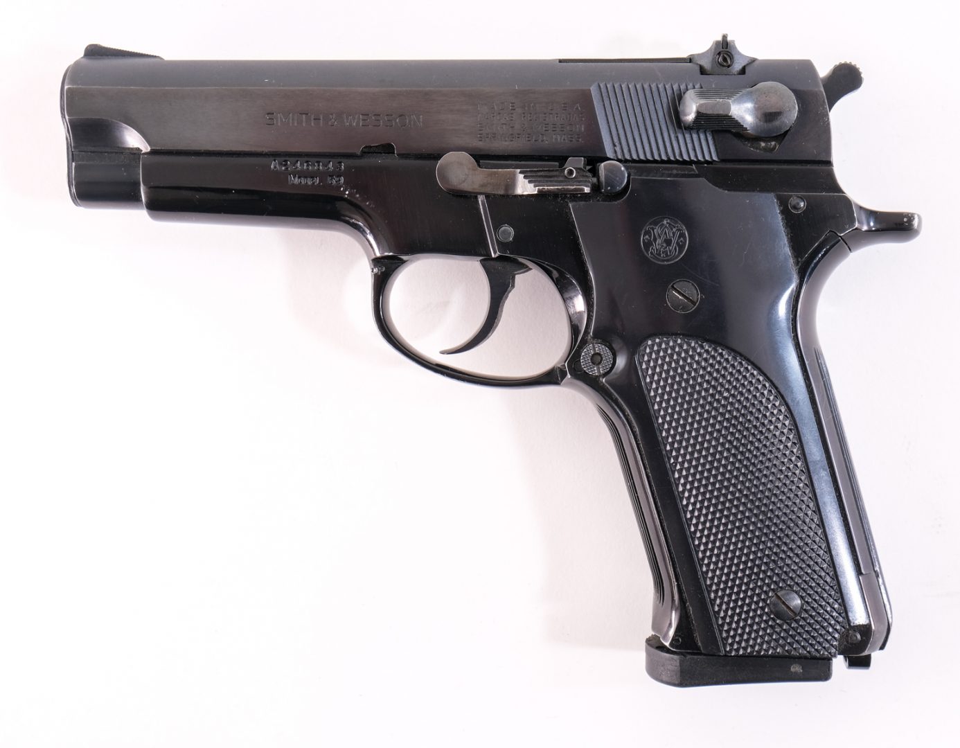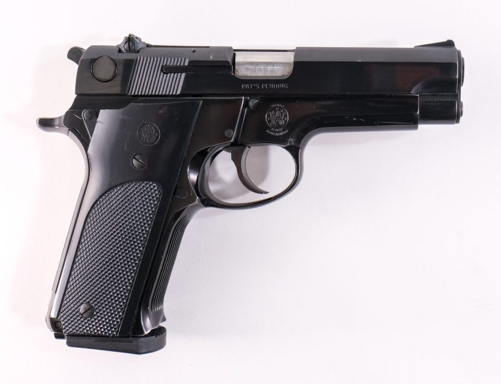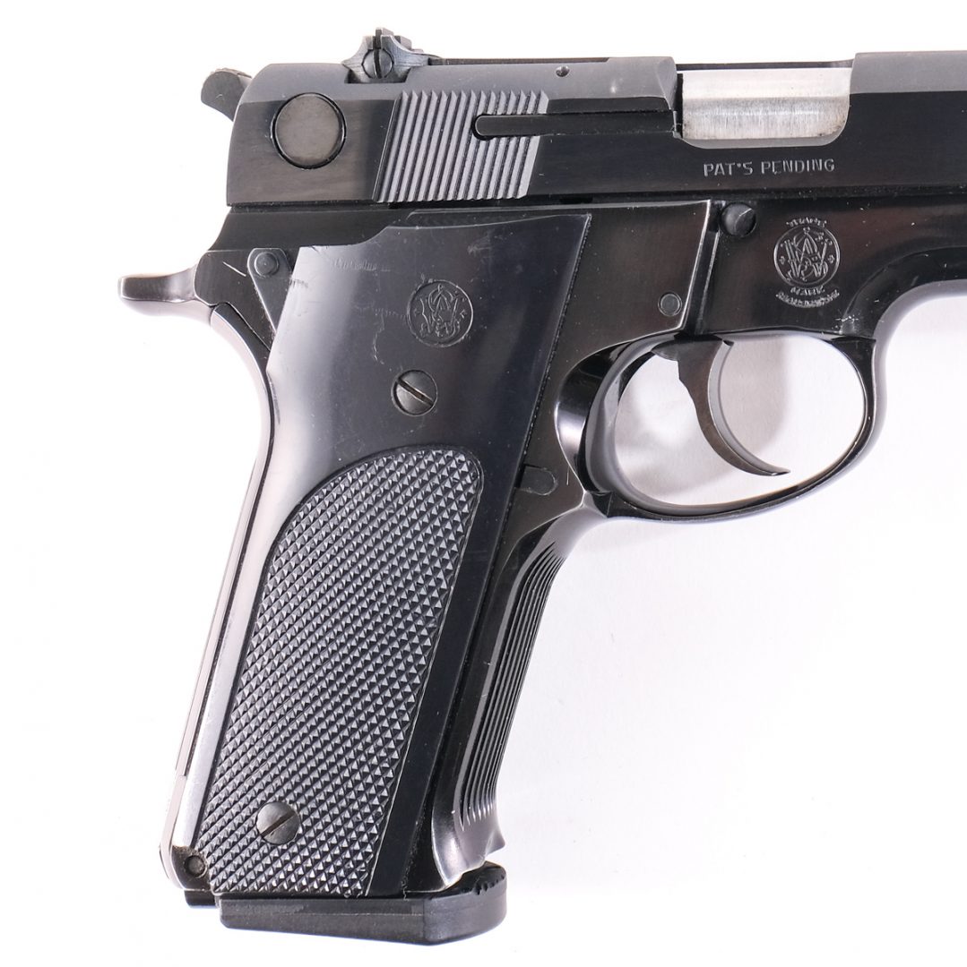 Smith & Wesson model 59 in 9mm with one, fifteen round “HIGH CAPACITY” removable magazine and a 4″ barrel. Plastic checkered grip plates. Black finished frame. Blued slide, serrated hammer and trigger. Left side of frame checkered magazine release. Left side of slide serrated safety switch. Left side of frame serrated slide release. Adjustable rear sight and front fixed blade. Lanyard loop on the magwell. Check local/State laws on High Capacity Magazines before biddin Must ship to a FFL holder.