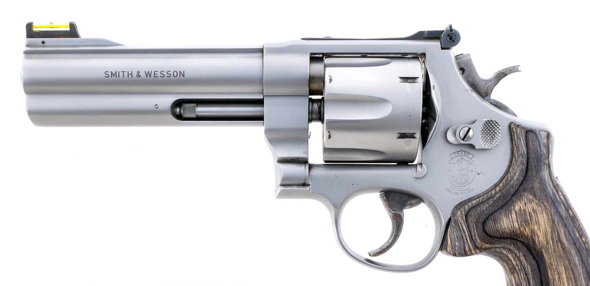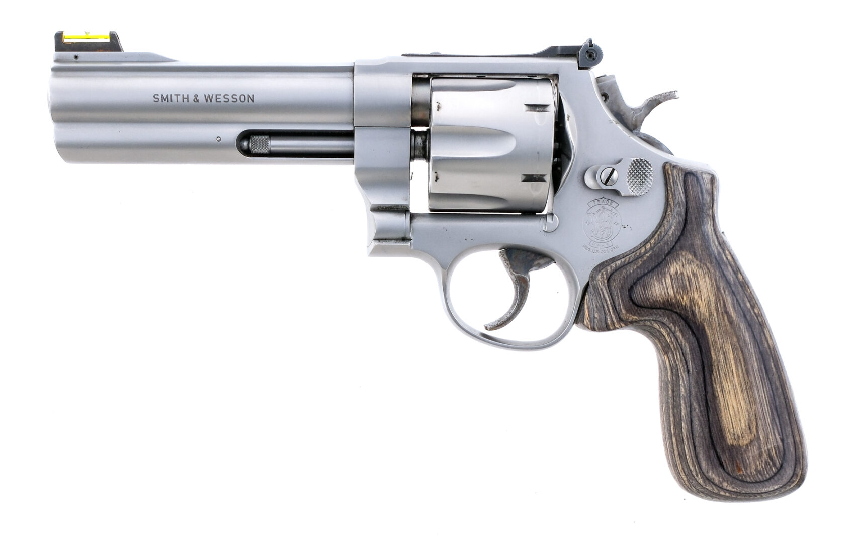 Description Smith & Wesson 625-4 chambered in .45 ACP with a six-shot cylinder and a 5″ barrel. Matte stainless steel barrel, frame, fluted cylinder, and checkered cylinder release. Case colored trigger and hammer. Laminate grips. Adjustable rear sight and green fiber optic front sight. Must ship to a FFL holder. Condition: Good/Very Good with light scratches and handling wear. Cylinder turn line and light operational wear. Spots of metal oxidation on the trigger, hammer, frame and front sight base. Bright and clean rifled bore. Barrel Length: 5″ Serial: BUA2936 Manufacturer: SMITH & WESSON Caliber: .45 ACP Model: 625-4 Book# 06375