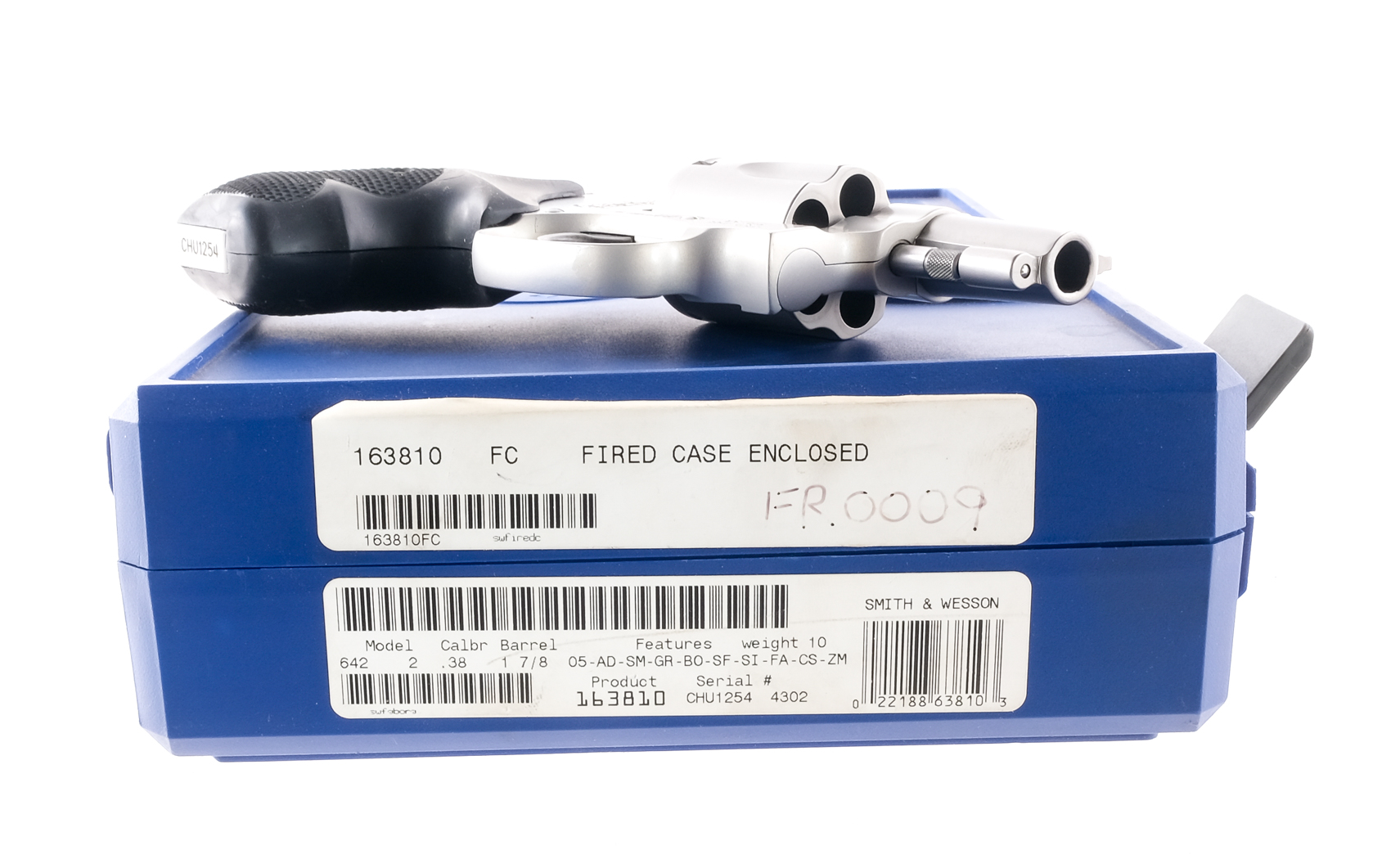 Description Smith & Wesson Model 642-2 Airweight in .38 Special +P with a five round capacity and a 1 7/8″ barrel. Checkered rubber grip plates. Matte finished alloy frame. Matte finished steel cylinder and barrel. Case colored untextured trigger. Left side of frame checkered cylinder release. Above cylinder internal mechanism lock with turn of key revolver cannot function. Front fixed sight. Comes in its factory box with matching serial number, instruction manual, gun lock and first factory round fired. Must ship to a FFL holder. Condition: Good/Very Good with light rear frame finish wear and a light turn line. Clean rifled bore. Barrel Length: 1 7/8″ Serial: CHU1254 Manufacturer: Smith & Wesson Caliber: .38 Spl +P Model: 642-2 Airweight Book# 9-321