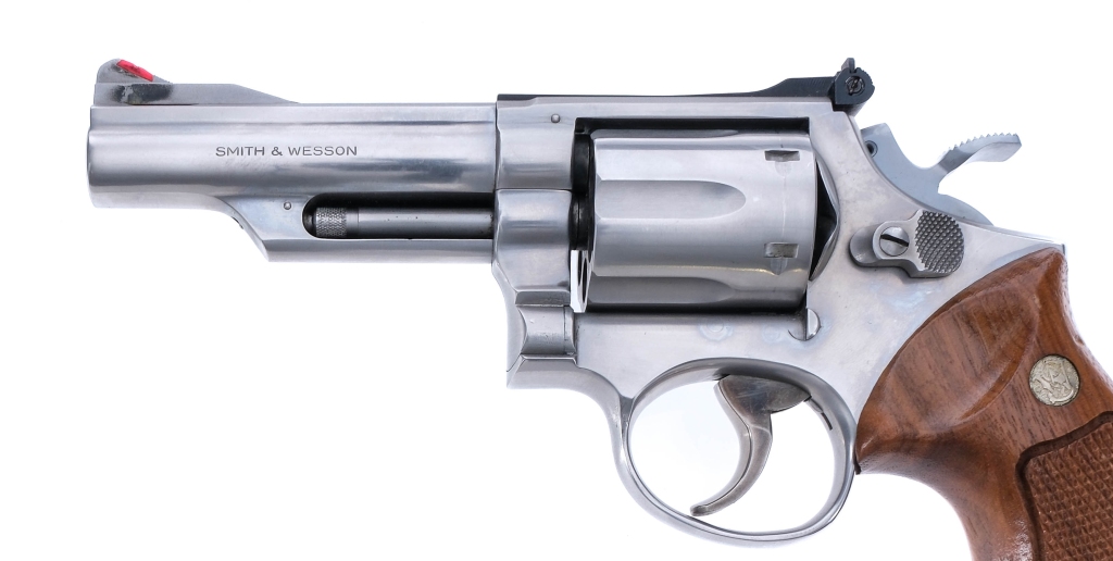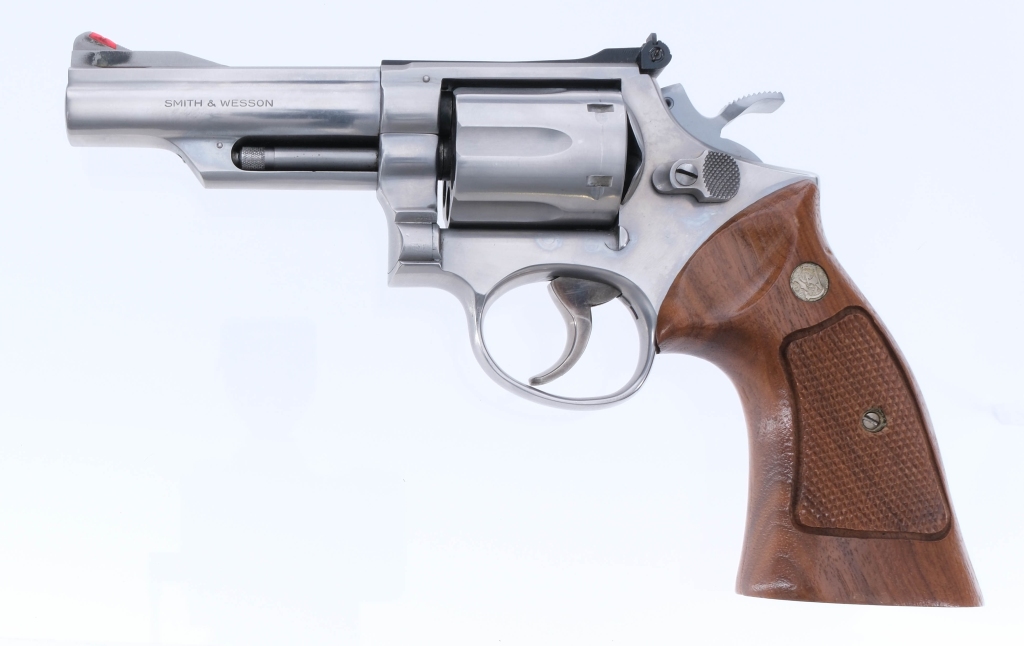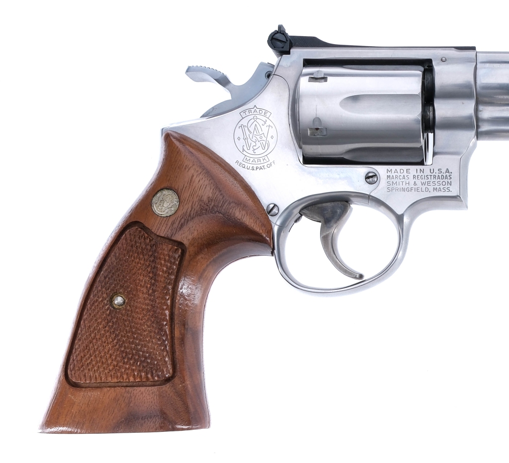 Description Smith & Wesson model 66 chambered in .357 Magnum with a 4″ ported barrel. Stainless steel barrel, frame, fluted cylinder, and checkered cylinder release. Case colored double action trigger with polished front. Matte stainless steel hammer. Checkered Goncalo Alves grips with S&W monograms. Adjustable rear white U-notch and red ramp front blade iron sights. The frame serial number is 2K98803, the crane serial number matches but has a misprint with a 2 and 3 prefix stamped on top of each other. Must ship to a FFL holder. Condition: Very Good with light scratches, scuffs, and general handling wear. Light cylinder turn line and normal operational wear. Light wear on the grips. Bright and clean rifled bore. Barrel Length: 4″ Serial: 2K99803 Manufacturer: SMITH & WESSON Caliber: .357 Magnum Model: 66 Book# 07756