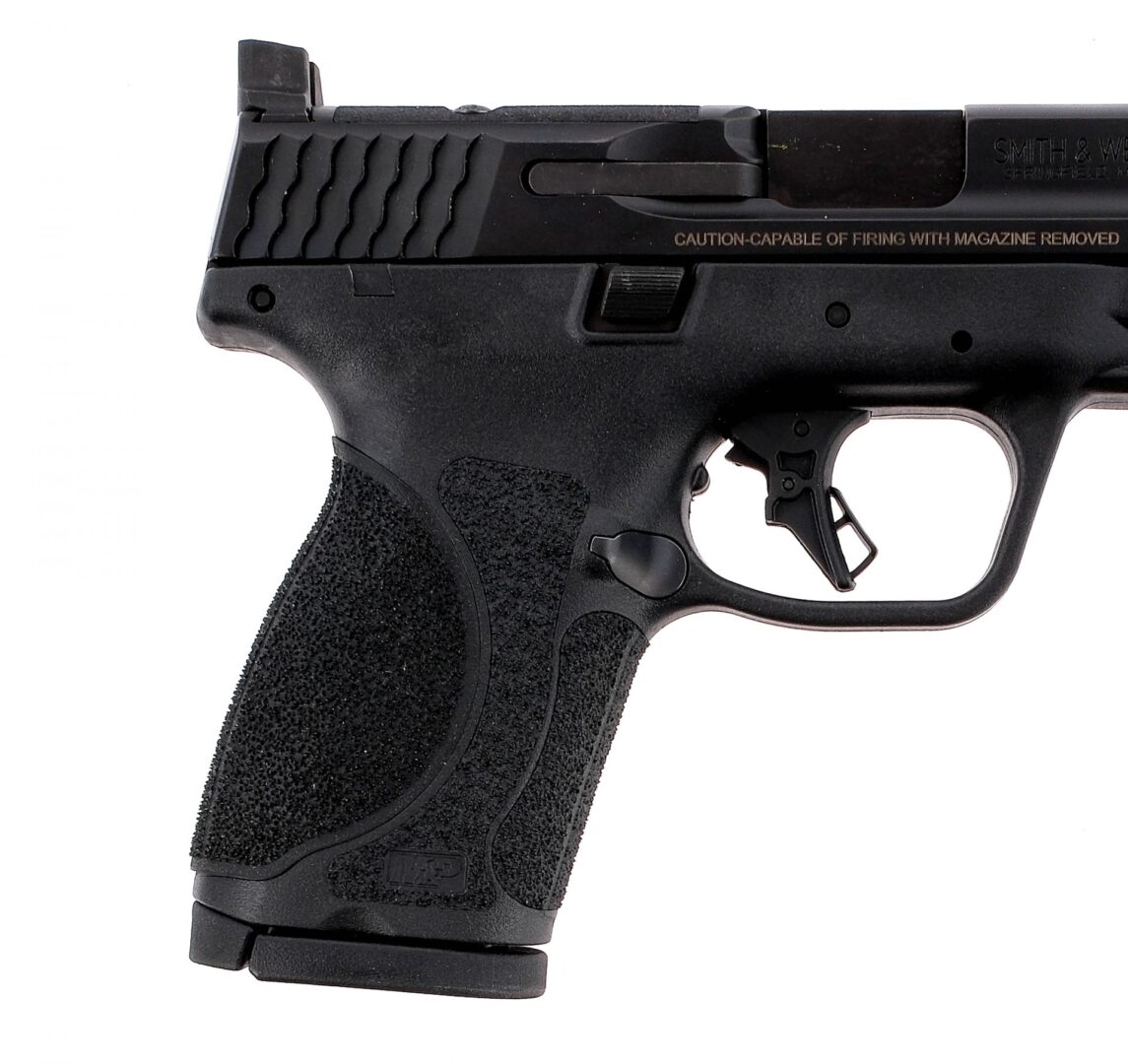 Description Smith & Wesson M&P9 2.0 chambered in 9mm with two, fifteen round removable magazines and a 3.6″ barrel. Compact polymer frame with aggressively textured grips and interchangeable back strap. Under barrel picatinny accessories rail. Polymer striker fired trigger with shoe safety. Push button magazine release and ambidextrous slide release. Black finished slide with front/rear slide serrated and optics cut. Front and rear white three-dot iron sights. Comes in its factory box with screw/plate kit, cable lock, four back straps, two mag wells, factory paperwork, and two magazines. Must ship to a FFL holder. Check local laws regarding “High Capacity” magazines BEFORE bidding. Condition: Very good/Excellent with very light handling/operational wear. Clean rifled bore. Barrel Length: 3.6″ Serial: NLP5857 Manufacturer: SMITH & WESSON Caliber: 9x19mm Parabellum Model: M&P9 2.0 Book# 04590