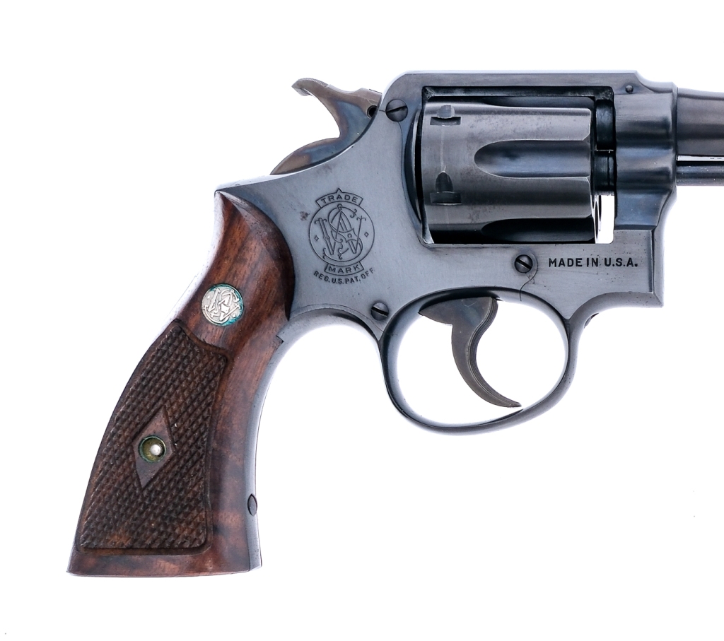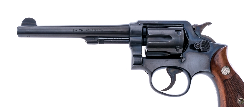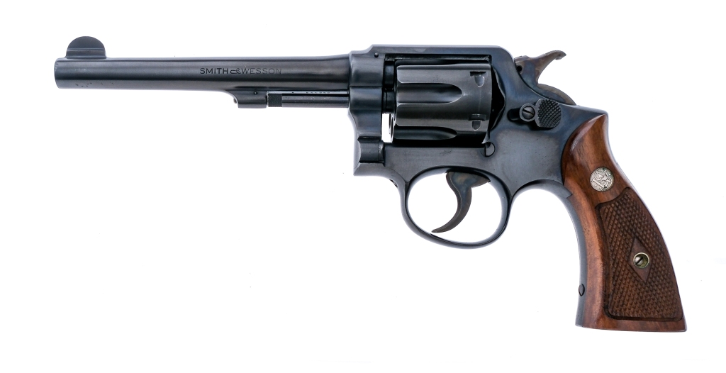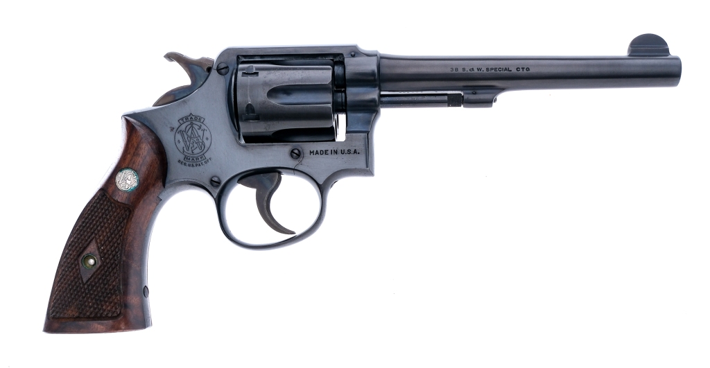 Description Smith & Wesson 38 Military & Police Pre Model 10 in .38 S&W Special with a six round capacity and a 6″ barrel. Made in Springfield Massachusetts between 1945 and 1948. Checkered factory monogram wood grip plates. Blued frame, cylinder and barrel. Serrated case colored trigger and knurled hammer. Left side of frame knurled cylinder release. Rear notch and front fixed blade sight. Serial number matching on frame, cylinder face, underside of barrel and reverse side of right grip plate. Must ship to a C&R or FFL holder. Condition: Good/Very Good with light scuffs, handling wear and very tiny touches of rust on the underside front of barrel and right side of frame. Clean rifled bore. Barrel Length: 6″ Serial: S944648 Manufacturer: Smith & Wesson Caliber: .38 S&W Spl Model: 38 Military Police Pre Model 10 Year-Range 1945-1948 Book# 06959