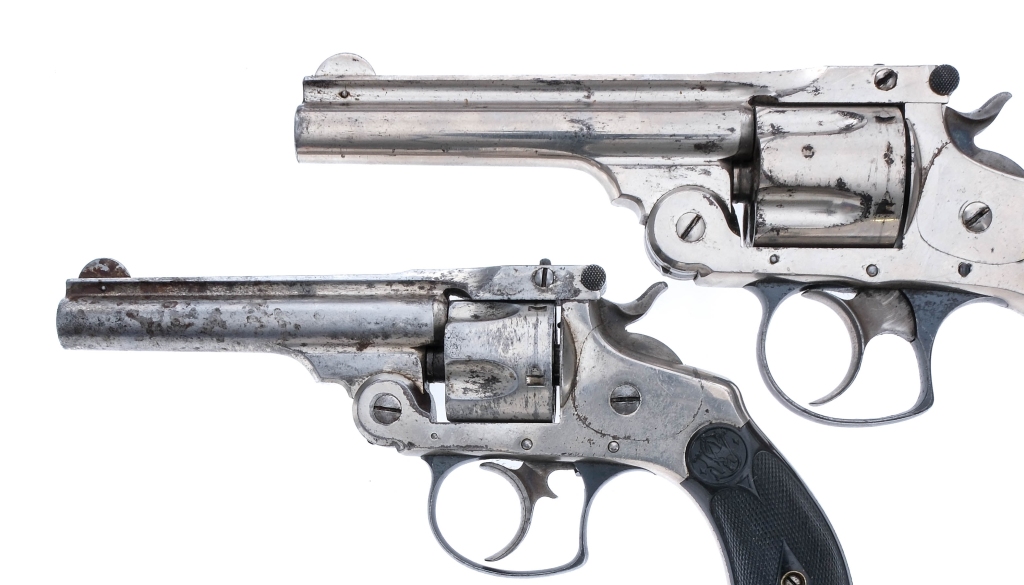 Description This lot is for two Smith & Wesson Top Break revolvers. S&W Double Action 3rd Model in .32 S&W with a five round capacity and a 3.5″ barrel. Checkered composite grip plates. Nickel finished frame, cylinder and barrel. Rear notch and front fixed blade sight. S&W Double Action 2nd Model in .38 S&W with a five round capacity and a 4″ barrel. Checkered composite grip plates. Nickel finished frame, cylinder and barrel. Rear notch and front fixed blade sight. Antique, No FFL required and ships to MOST buyers home. Condition: Antique, Good with scratches, finish wear/loss, rust and handling wear. Both have spots of rust and pitting to the rifled bores. Barrel Length: 3.5″ Serial: 169754 34966 Manufacturer: Smith & Wesson Caliber: .38 .32 S&W Model: DA 3rd DA 2nd Year-Range 1880-1884