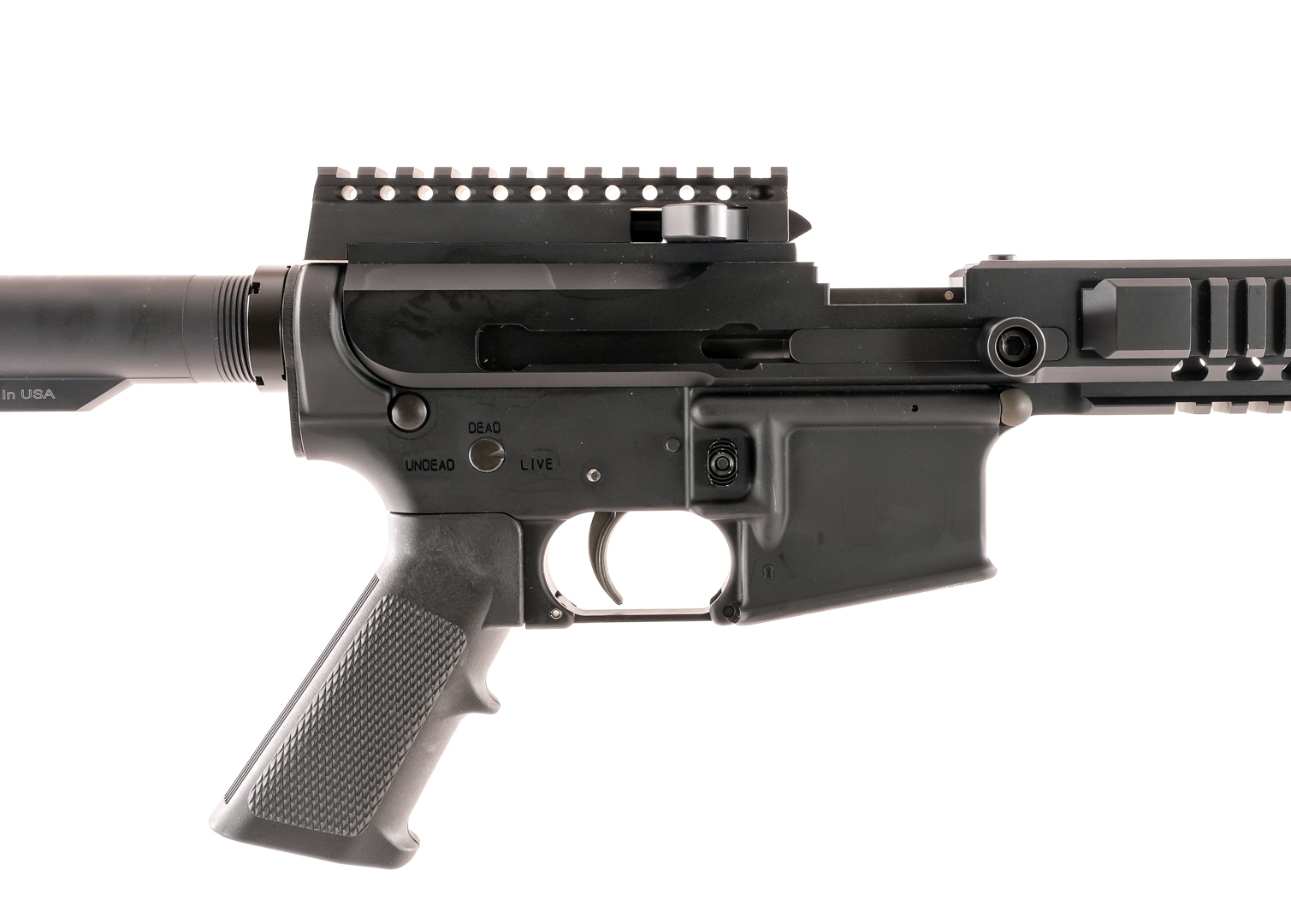 Description Spikes Tactical ST-15 Zombie Lower in 5.7×28 multi caliber missing its magazine with a 17.5′ barrel with muzzle device. Telescopic checkered composite butt plate and stock. Checkered composite pistol grip. AR Seven upper with optics/accessories rails. Left side of receiver located serrated safety switch and action release. Right side of receiver located serrated magazine release and charging handle. Missing the top mounted PSG style magazine and the AR style magazine. Must ship to a FFL holder.