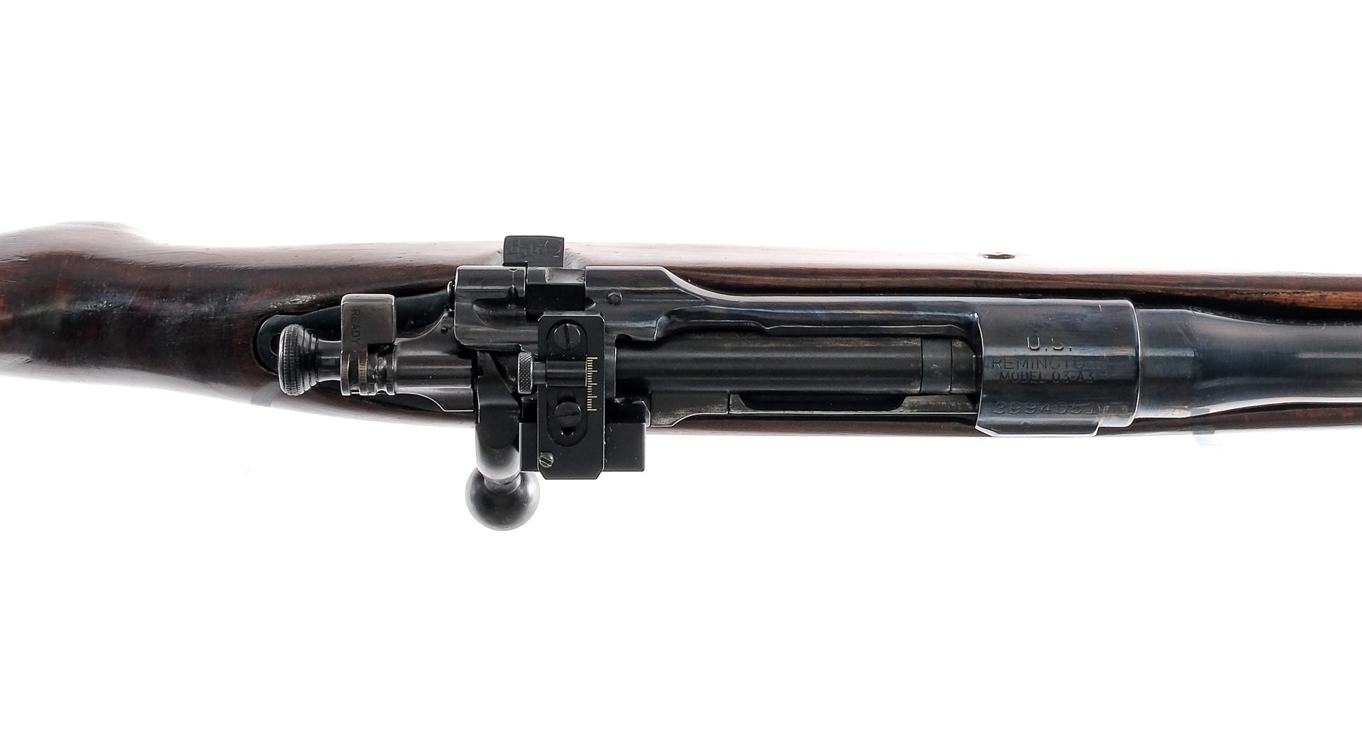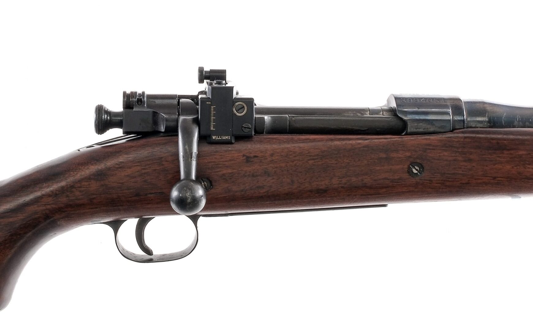 Description Sporterized Remington U.S. Model 03-A3 bolt action rifle chambered in .308 Winchester with a 18″ barrel and a five round integral magazine. Completely refinished bolt, frame, barrel, magazine plate, trigger, and guard. Features aftermarket barrel rechambered in .308 with hand engraved “.308 Winchester (7.62 m/m NATO)” on the left side of breach. Aftermarket Lyman front post iron sight and fully adjustable Williams rear peep sight. Hardwood furniture with a wooden plug where the rear sling point was once installed and Red Head branded rubber butt pad. Must ship to an FFL holder. Condition: Good, with some aftermarket modifications, some handling and operational wear, some light scratches along barrel, receiver, and wooden stock. Bore is frost with strong visible rifling. Barrel Length: 18″ Serial: 3994051 Manufacturer: Remington Caliber: .308 Win Model: 03-A3 Book# 03080