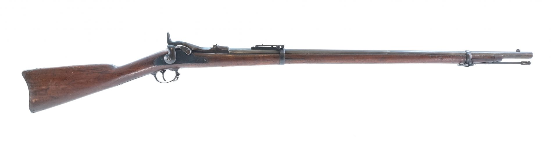 Springfield model 1873 trapdoor rifle chambered in .45-70. This rifle dating to 1874 features a 32-1/2″ barrel “V” / “P” / Eagle / “P” proof with fixed bead front and flip-up trapdoor rear sight. The barrel is also marked “N.J.” with adjacent “R”. The trapdoor is marked “MODEL” / “1873” / Eagle / “US”, “US” marked butt plate with added “H” / “22”. The lockplate has been refinished with only a faint part of the wing of the Eagle remaining. The stock has been refinished and sanitized of any markings. Antique, Ships direct to buyers home
