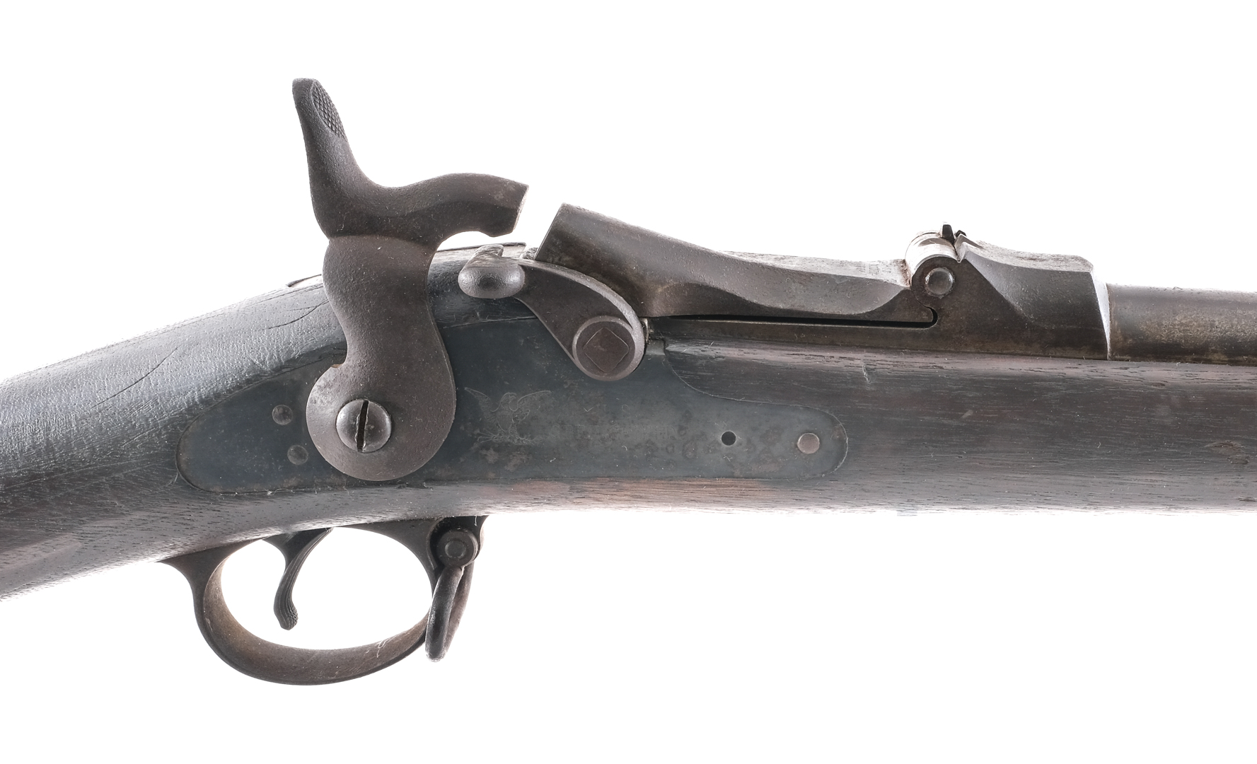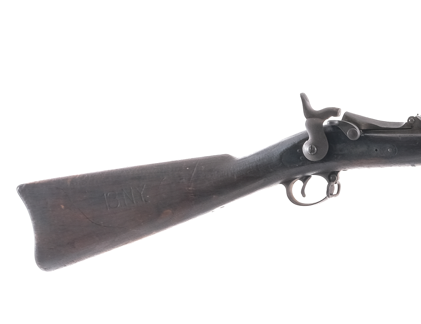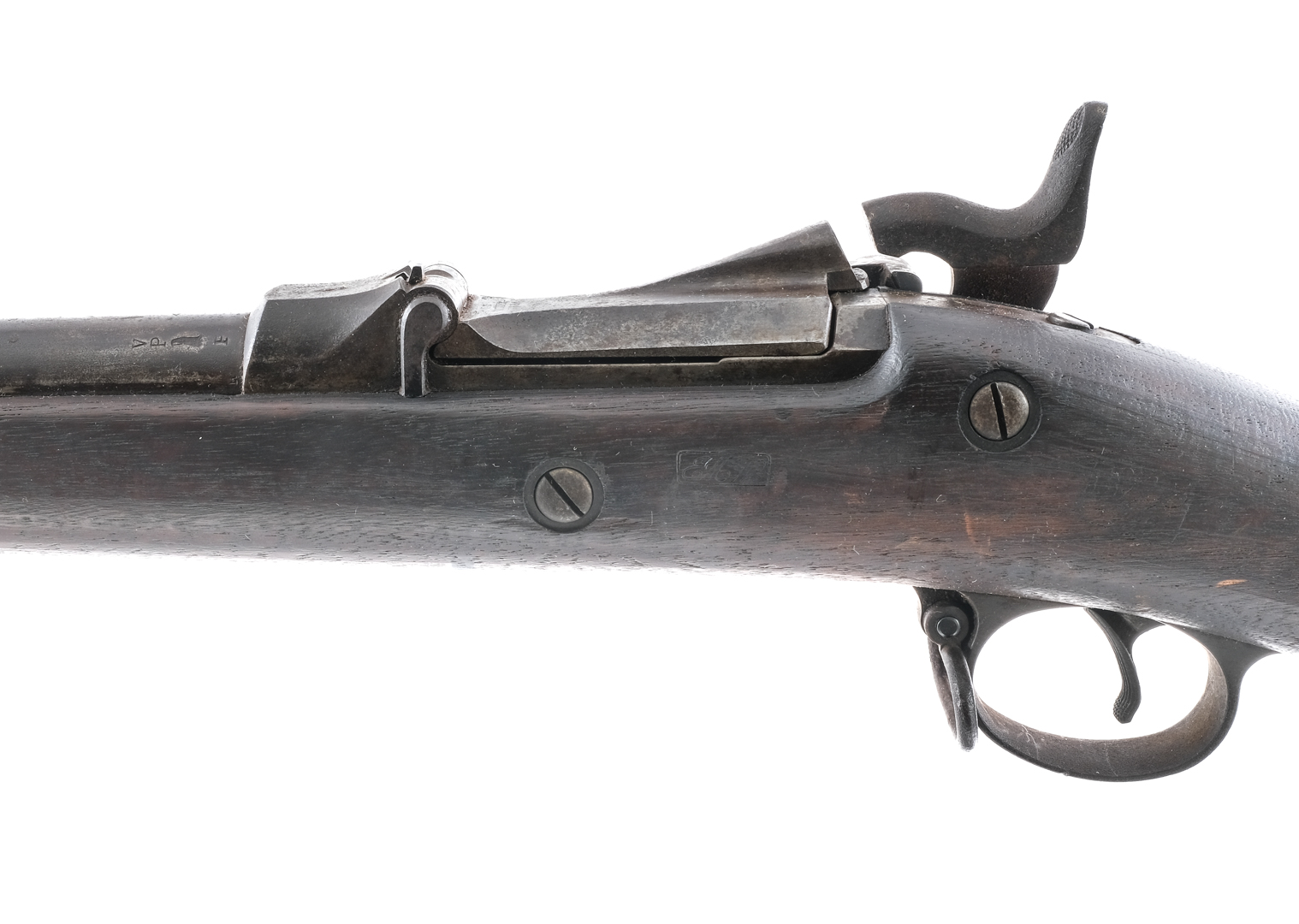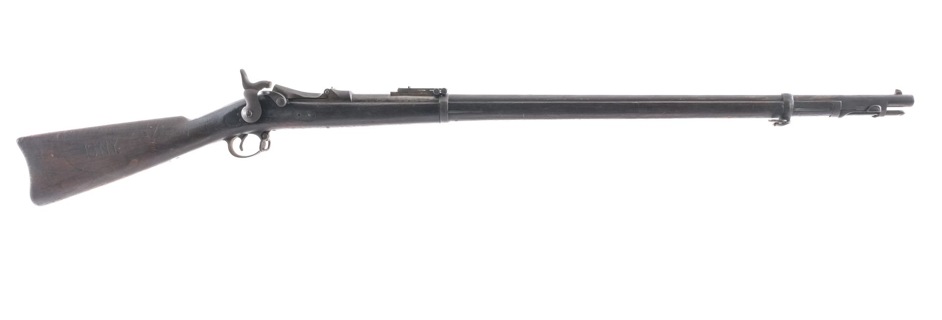 Description U.S. Springfield 1884 Trapdoor in .45-70 with a single round capacity and a 32.5″ barrel. Metal butt plate. Smooth wood stock and front forend. Blued trigger guard, serrated trigger, trapdoor, breech block, checkered hammer, and barrel. Rear flip up Buffington sight and front fixed blade. Under barrel pull out bayonet. Metal loops for mounting a shoulder sling. Left side of barrel marked: V P P. Right side of stock marked: 13. N.Y. Top of heel marked: 386. Antique, No FFL required and ships to buyers home. Condition: Good/Very Good with scratches, wood dings, finish wear/loss and rust. The rifled bore has rust. Barrel Length: 32.5″ Serial: 539701 Manufacturer: Springfield Armory Caliber: .45-70 Model: 1884 Trapdoor