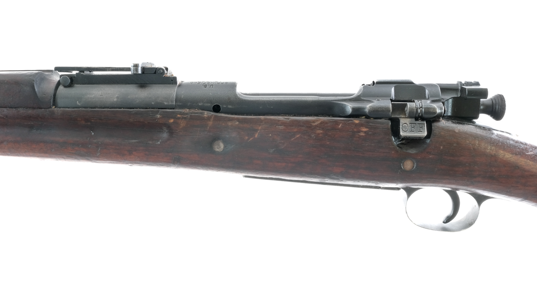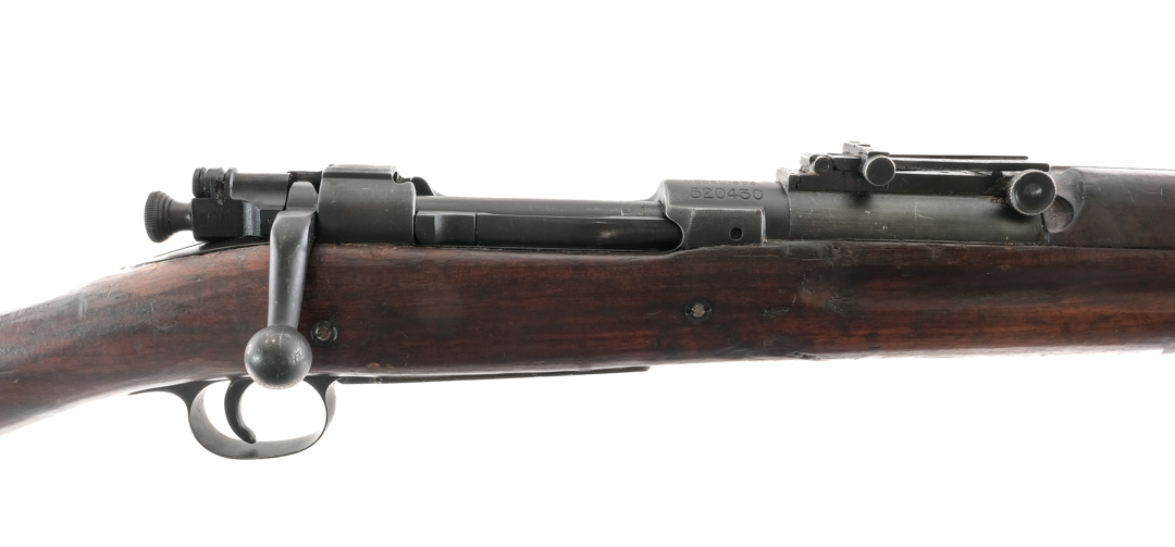Description U.S. Springfield Armory Model 1903 in .30-06 with a five round capacity and a a 24″ barrel. Metal butt plate with accessories door with oiler tube intact inside. Smooth wood stock and front forend. Blued trigger, guard, trigger, receiver, bolt and barrel. Rear bolt safety switch. Rear left side of receiver located bolt release. Under barrel fixed bayonet lug. Metal loops for mounting a shoulder sling. Muzzle end of barrel marked H.S. 5-44 with bomb proof. Right side of muzzle marked: H. Underside of bayonet lug marked: H. Must ship to a C&R or FFL holder. Condition: Good with finish wear/loss, wood repairs/fills, small crack on the right side of wrist and handling wear. Larger wood fill on the underside of stock. Clean rifled bore. Barrel Length: 24″ Serial: 520430 Manufacturer: Springfield Armory Caliber: .30-06 Model: 1903 Book# 9-416