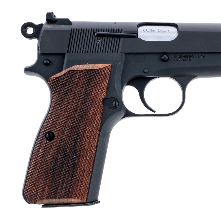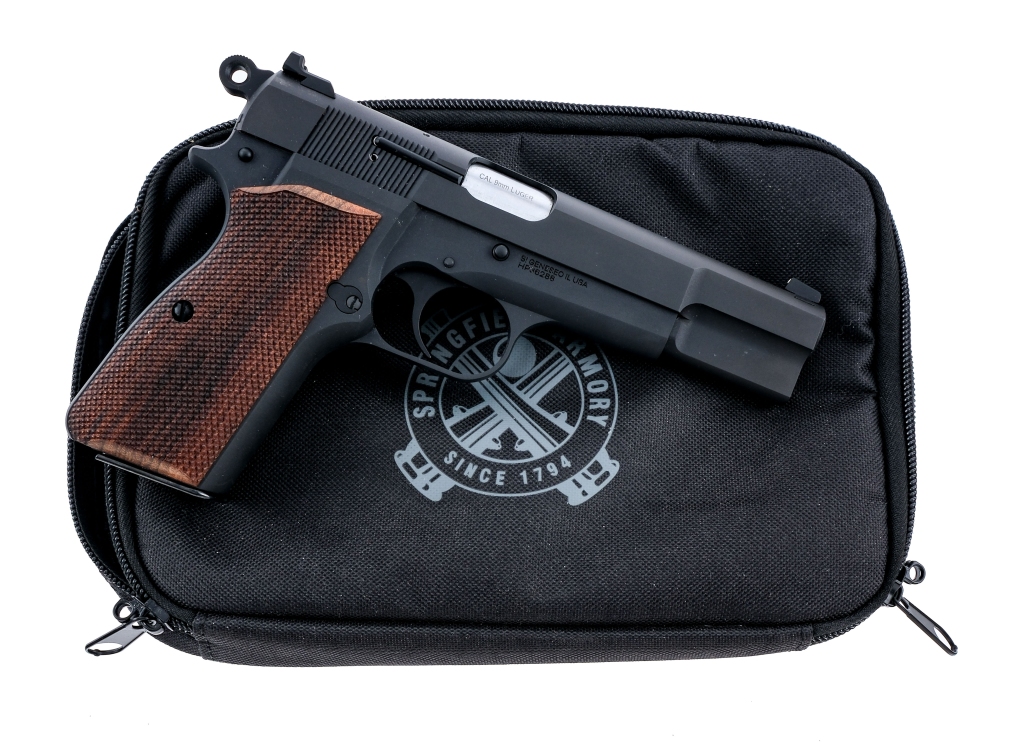 Description Springfield Armory SA-35, Hi Power clone chambered in 9mm with a fifteen round Mec-Gar magazine and a 4.7″ stainless cold hammer forged barrel. Matte finished carbon steel frame with checkered walnut grips. Single action trigger and hammer with frame mounted manual thumb safety. Push button magazine release and serrated slide catch. Matte finished carbon steel serrated slide with white dot front sight and serrated tactical rack rear sight. Comes in its Springfield Armory soft case. Must ship to a FFL holder. Check local laws regarding “High Capacity” magazines BEFORE bidding. Condition: Excellent appearing to have seen very little use with very light handling and operational wear. Clean rifled bore. Barrel Length: 4.7″ Serial: HP36288 Manufacturer: SPRINGFIELD ARMORY Caliber: 9x19mm Parabellum Model: SA-35 Book# 08090