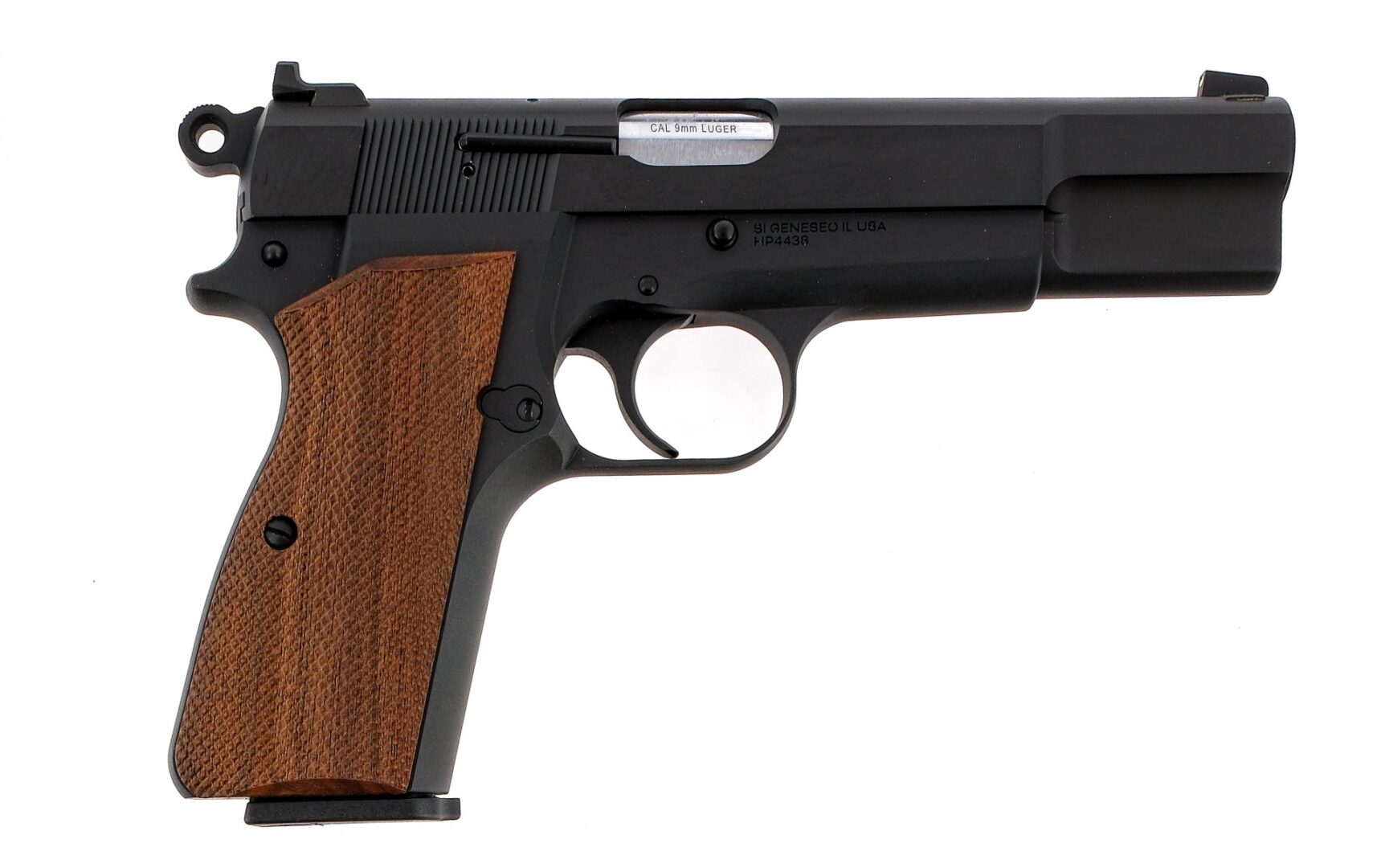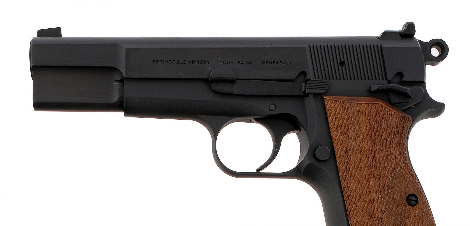 Description Springfield Armory SA-35, Hi Power clone chambered in 9mm with a ten round removable Mec-Gar magazine and a 4.7″ stainless cold hammer forged barrel. Matte finished carbon steel frame with checkered walnut grips. Single action trigger and hammer with frame mounted manual thumb safety. Push button magazine release and serrated slide catch. Matte finished carbon steel serrated slide with white dot front sight and serrated tactical rack rear sight. Comes in its factory box with factory paperwork, cable lock, and soft case. Must ship to a FFL holder. Condition: Like new appearing to have seen very little use with very light handling wear. Clean rifled bore. Barrel Length: 4.7″ Serial: HP4438 Manufacturer: SPRINGFIELD ARMORY Caliber: 9x19mm Parabellum Model: SA-35 Book# 04568