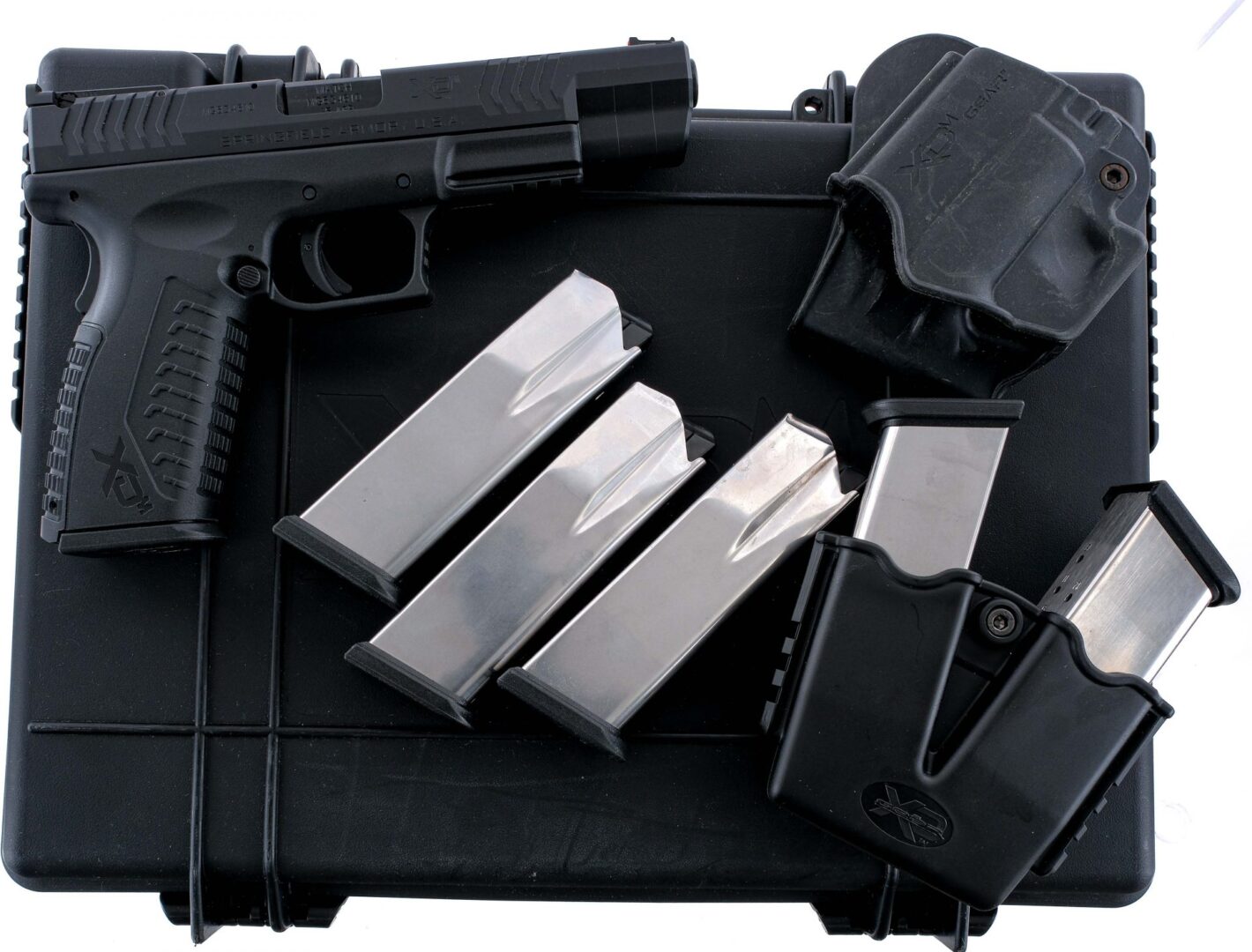 Description Springfield Armory XDM-45 chambered on .45 ACP with six, thirteen round removable magazines and a 5.25″ match barrel. Textured polymer frame with interchangeable backstrap and under barrel accessories rail. Polymer striker fired trigger with trigger safety and grip safety. Ambidextrious push button magazine release. Black finished slide with front and rear serrations and cocked striker indicator. Serrated blacked out rear sight and red fiber optic front sight. Comes in its factory case with manual, OWB holster, OWB magazine holster, two backstraps, and six magazines. Must ship to a FFL holder. Check local laws regarding “High Capacity” magazines BEFORE bidding. Condition: Very good with light scratches and cosmetic wear from handling. Light wear on the moving parts from operation. Clean rifled bore. Barrel Length: 5.25″ Serial: MG634610 Manufacturer: SPRINGFIELD ARMORY Caliber: .45 ACP Model: XDM-45 Book# 04799