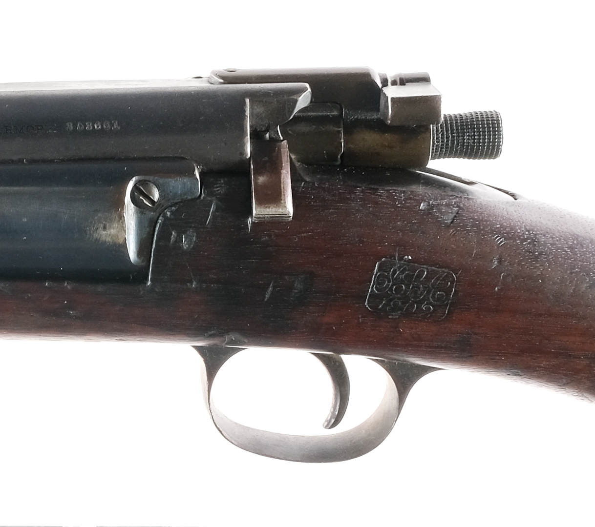 Description U.S. Springfield Armory Krag Jorgensen Model 1899 in .30-40 Krag with a five round capacity and a 22″ barrel. Metal butt plate with cleaning kit door, empty. Blued trigger guard, untextured trigger, receiver, bolt handle and barrel. Rear bolt safety switch. Left side of frame bolt release. Right side loading gate. Rear flip up adjustable and front fixed blade sight. Must ship to a C&R or FFL holder. Condition: Fair with scratches, wood dings, finish wear/loss and light rust. The stock has been cut down/modified. The rifled bore has light rust with strong visible rifling. Barrel Length: 22″ Serial: 353661 Manufacturer: Springfield Armory Caliber: .30-40 Krag Model: 1899 Book# X-156