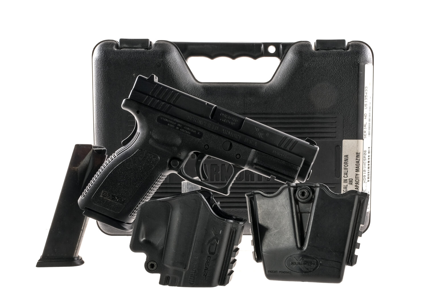 Description Springfield XD-9 in 9mm with two, fifteen round removable magazines and a 4″ barrel. Textured composite grip on frame. Serrated blued trigger, serrated slide and barrel. Lower left side of frame magazine release button. Left side of frame serrated take-down lever and slide release. Backstrap safety. Front and rear fixed white DOT sights. Comes in its factory hard case with matching serial number, fitted composite belt holster, double magazine holster, speed loading device, cleaning brush, instruction manual and two magazines. Check Local/State Laws on High Capacity Magazines BEFORE bidding. Must ship to a FFL holder. Condition: Very Good with light scuffs and handling wear. Clean rifled bore. Barrel Length: 4″ Serial: US135433 Manufacturer: Springfield Armory Caliber: 9mm Model: XD-9 Book# 533