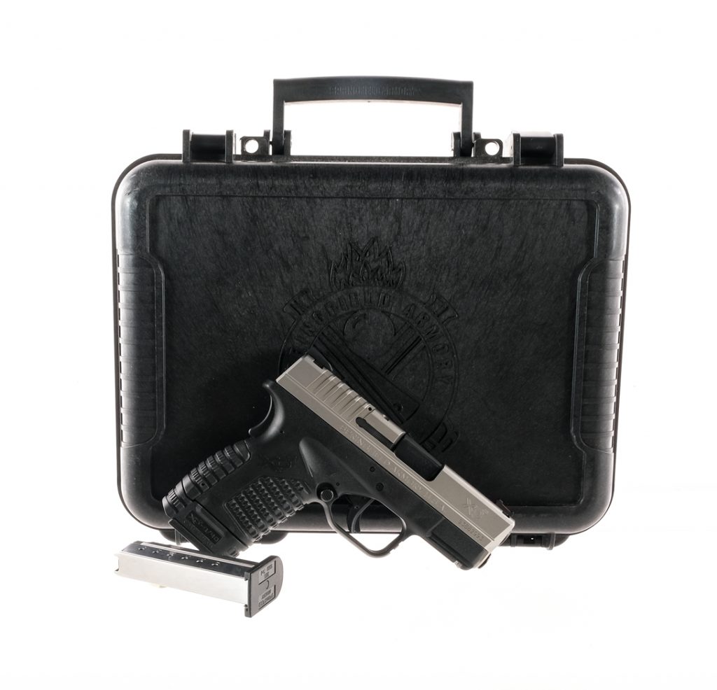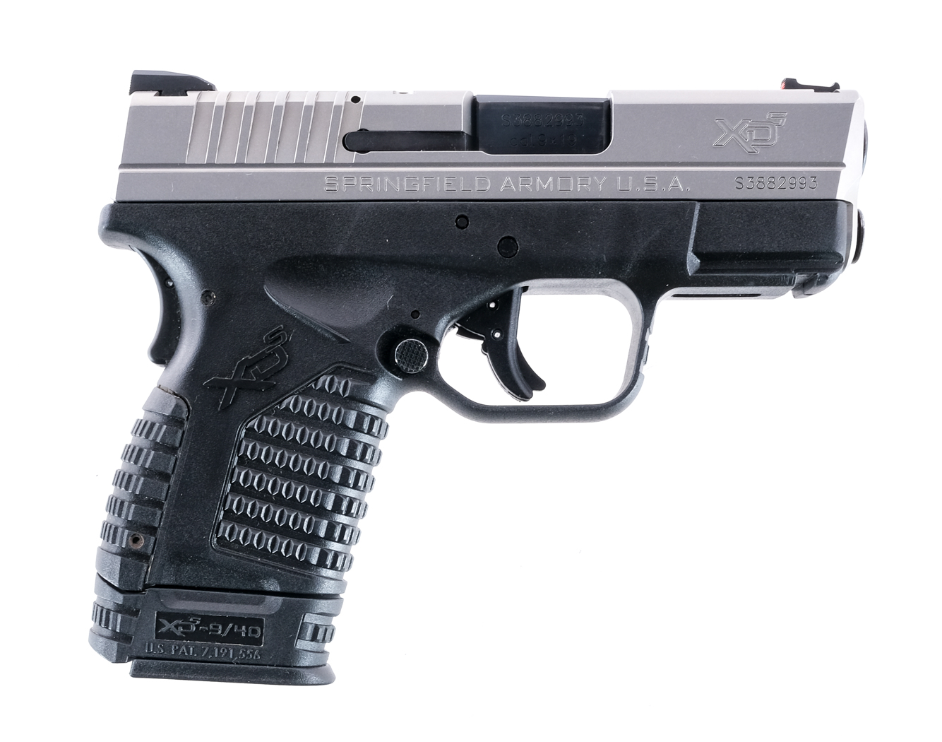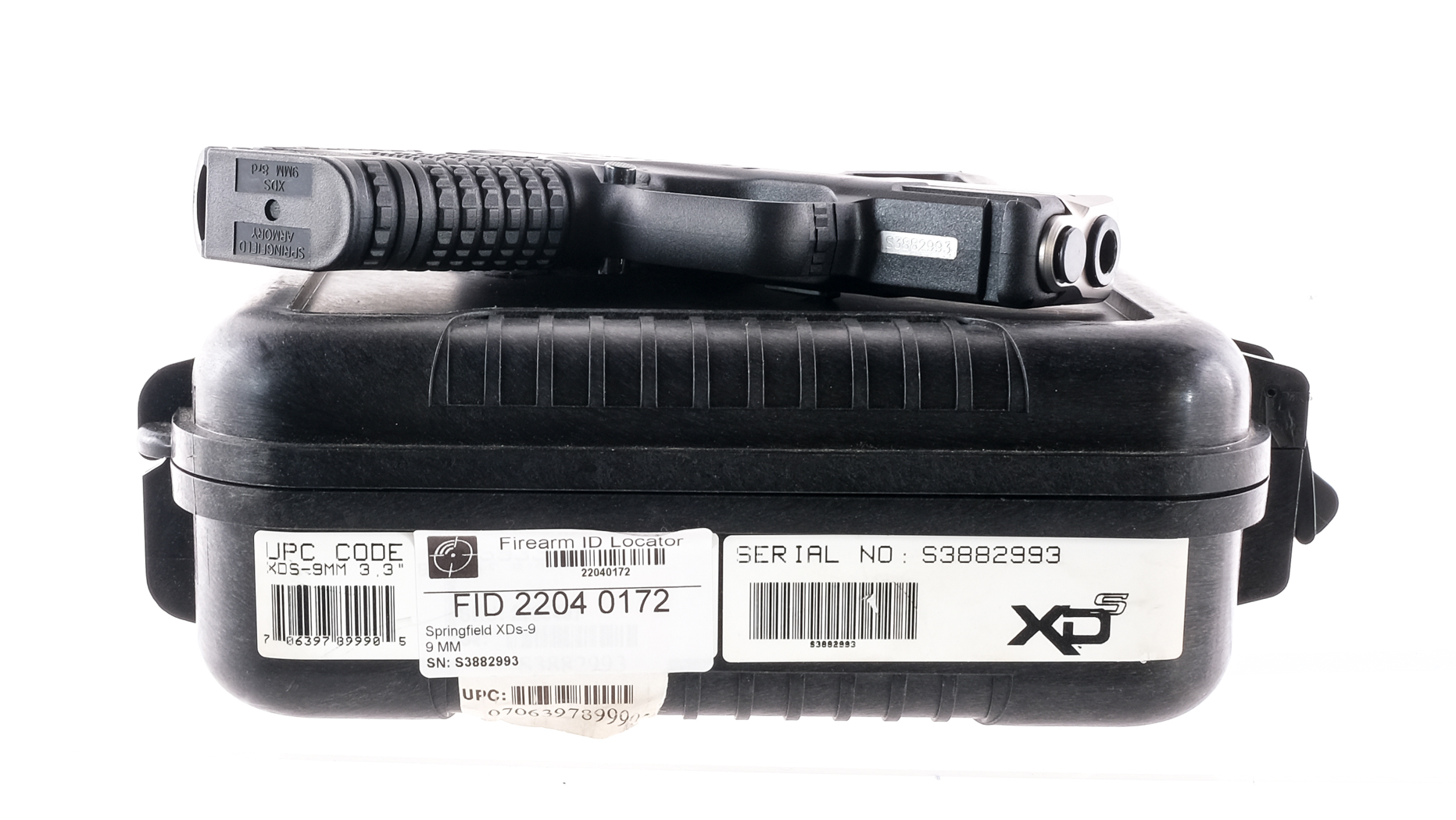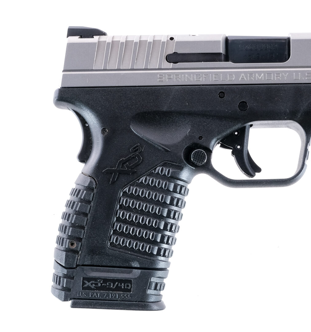 Description Springfield XDS-9 in 9mm with two removable magazines and a 3.3″ barrel. Textured black composite grip on frame. Serrated matte silver finished slide. Left side of frame serrated slide release and safety switch. Rear trigger guard located ambidextrous checkered magazine release button. Grip safety. Rear fixed white DOT and front fiber optic sight. Comes in its factory hard case with matching serial number, instruction manual, cleaning rod, backstrap plate, one, seven round and one, eight round magazine. Must ship to a FFL holder. Condition: Like New with light handling wear. Clean rifled bore. Barrel Length: 3.3″ Serial: S3882993 Manufacturer: Springfield Armory Caliber: 9mm Model: XDS-9 Book# 9-418