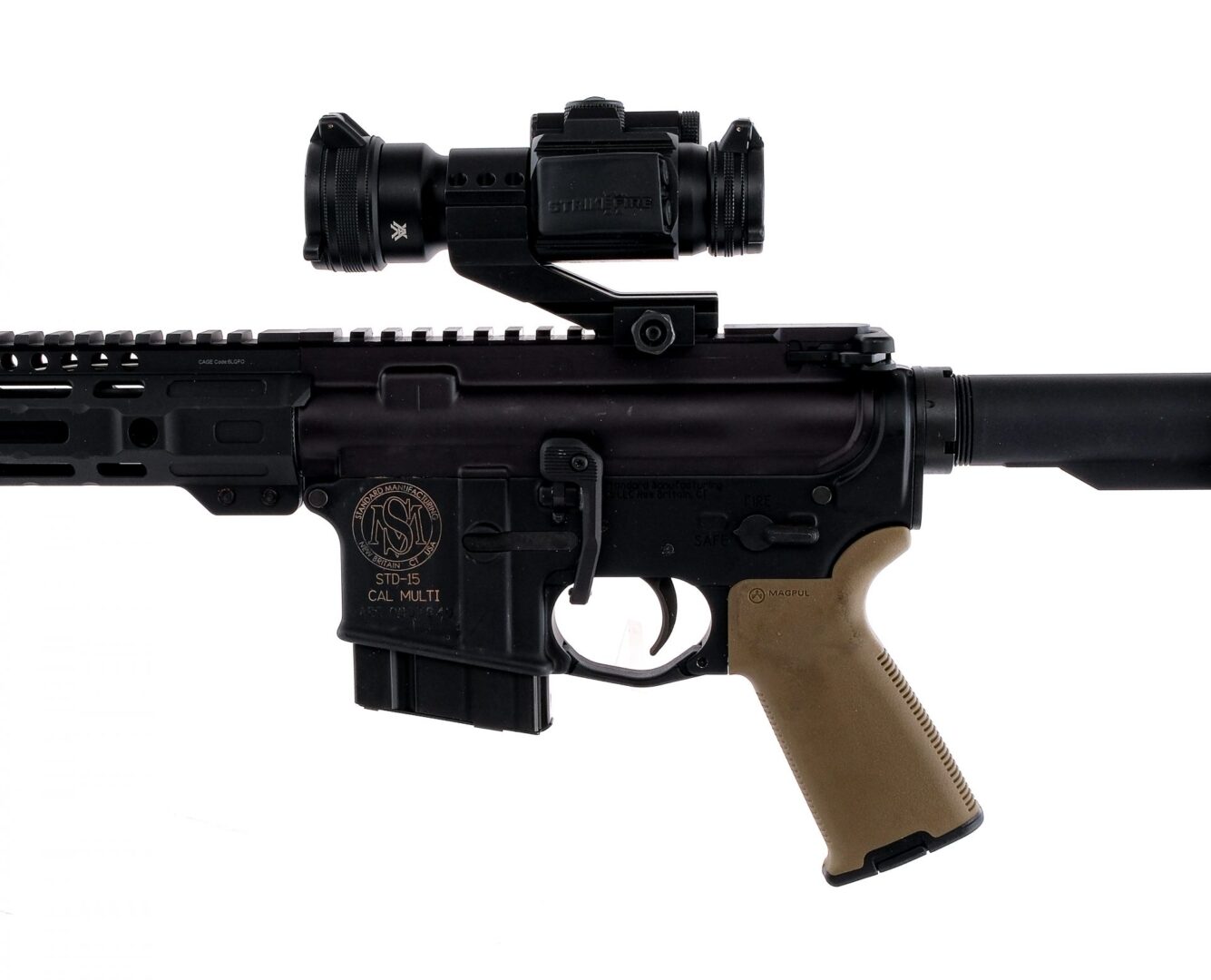 Description Standard Manufacturing STD-15 chambered in 7.62x39mm with one, ten round removable magazine and a 16″ barrel with muzzle break. Midwest Industries 12.5″ free float MLOK handguard with top picatinny rail and mounted MAGPUL vertical grip. Flat top upper receiver with mounted Vortex Strike Fire II red dot sight. STD-15 lower receiver with Magpul BAD lever bolt release and 90 degree throw safety. FDE Magpul polymer pistol grip and Magpul adjustable carbine stock. Must ship to a FFL holder. Check local laws regarding “Assault Weapons” BEFORE bidding. Condition: Good/Very good with some scratches, scuffs, and general wear from handling/operation. Clean bore with strong rifling. Barrel Length: 16″ Serial: 0007840 Manufacturer: STANDARD MANUFACTURING CO Caliber: 7.62x39mm Model: STD-15 Book# 04666