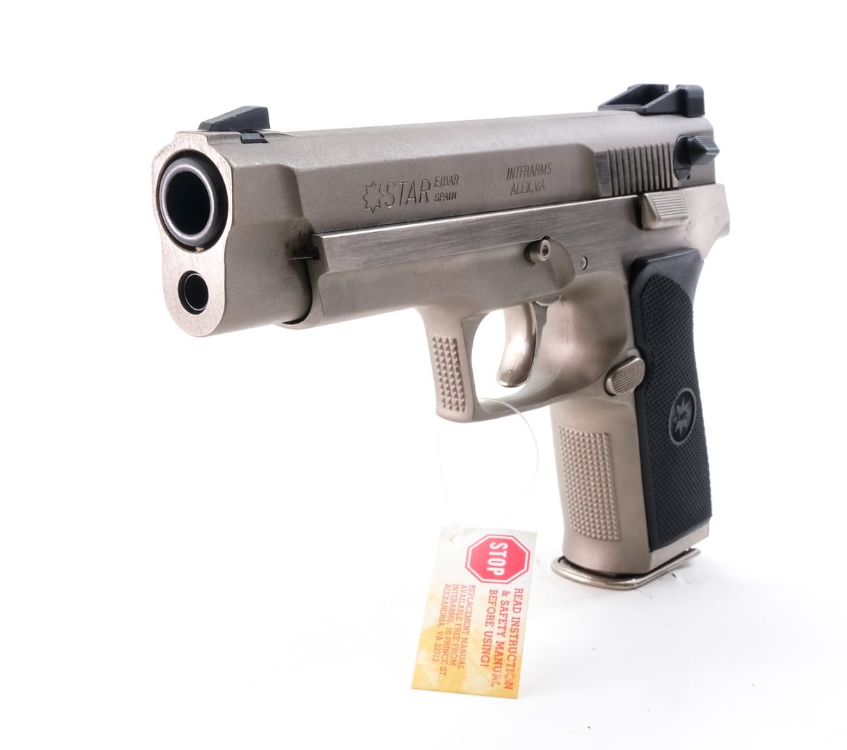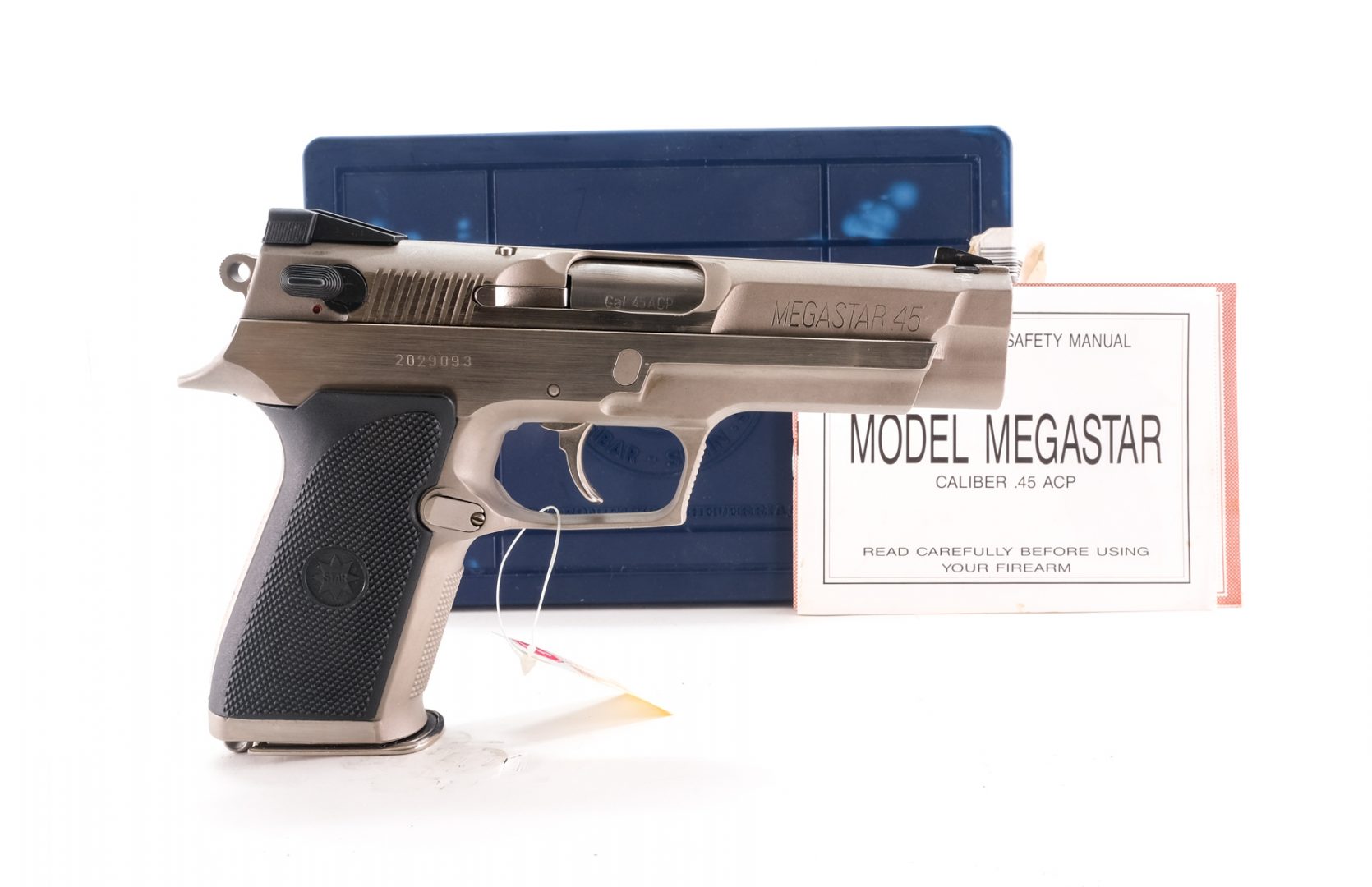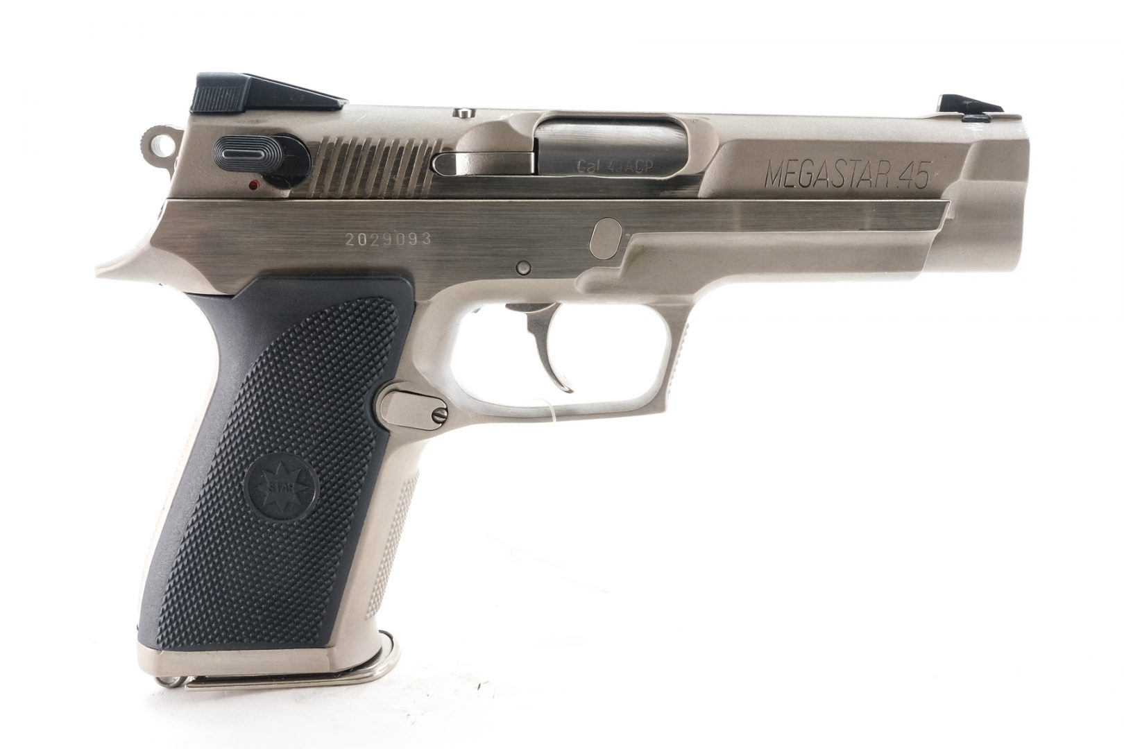 Description Star Arms model Megastar in .45 ACP with one, twelve round (High Capacity) magazine with a 4.5″ barrel. Checkered plastic Star grip plates. Polished stainless steel frame and serrated slide. Smooth trigger and serrated hammer. White dot fixed sights. Ambidextrous serrated safety switch on the rear of slide. Left side of frame serrated slide release. Left side of frame checkered magazine release button. Magwell located lanyard loop. Includes factory container with matching serial number, one magazine, instruction manual, cleaning brush, rod and take-down tool. Check local/State laws on (High Capacity) magazines BEFORE bidding. Must ship to a FFL holder.