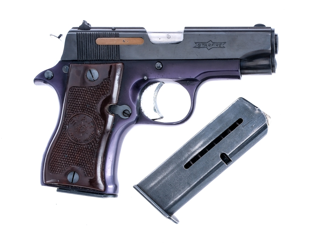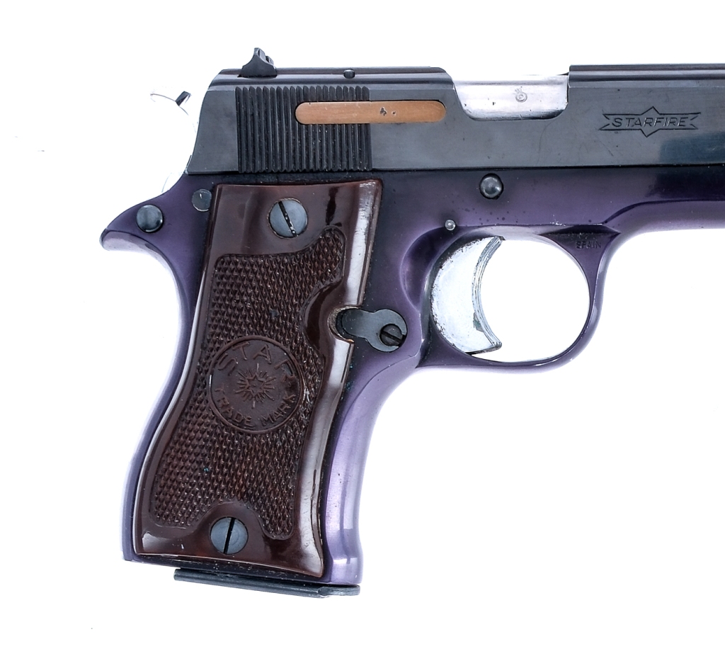 Description Star DK Starfire in .380 ACP with two, six round removable magazine and a 3.25″ barrel. Made in Spain in 1964. Checkered composite grip plates. Blued alloy frame. Serrated nickel trigger and knurled hammer. Blued serrated slide and controls. Lower left side of frame knurled magazine release button. Left side of frame knurled slide release and safety switch. Rear notch and front fixed blade sight. Must ship to a C&R or FFL holder. Condition: Good with light scuffs, finish wear and touches of rust. Clean rifled bore. Barrel Length: 3.25″ Serial: 810329 Manufacturer: Star Firearms Year: 1964 Caliber: .380 ACP Model: DK Starfire Book# 07513