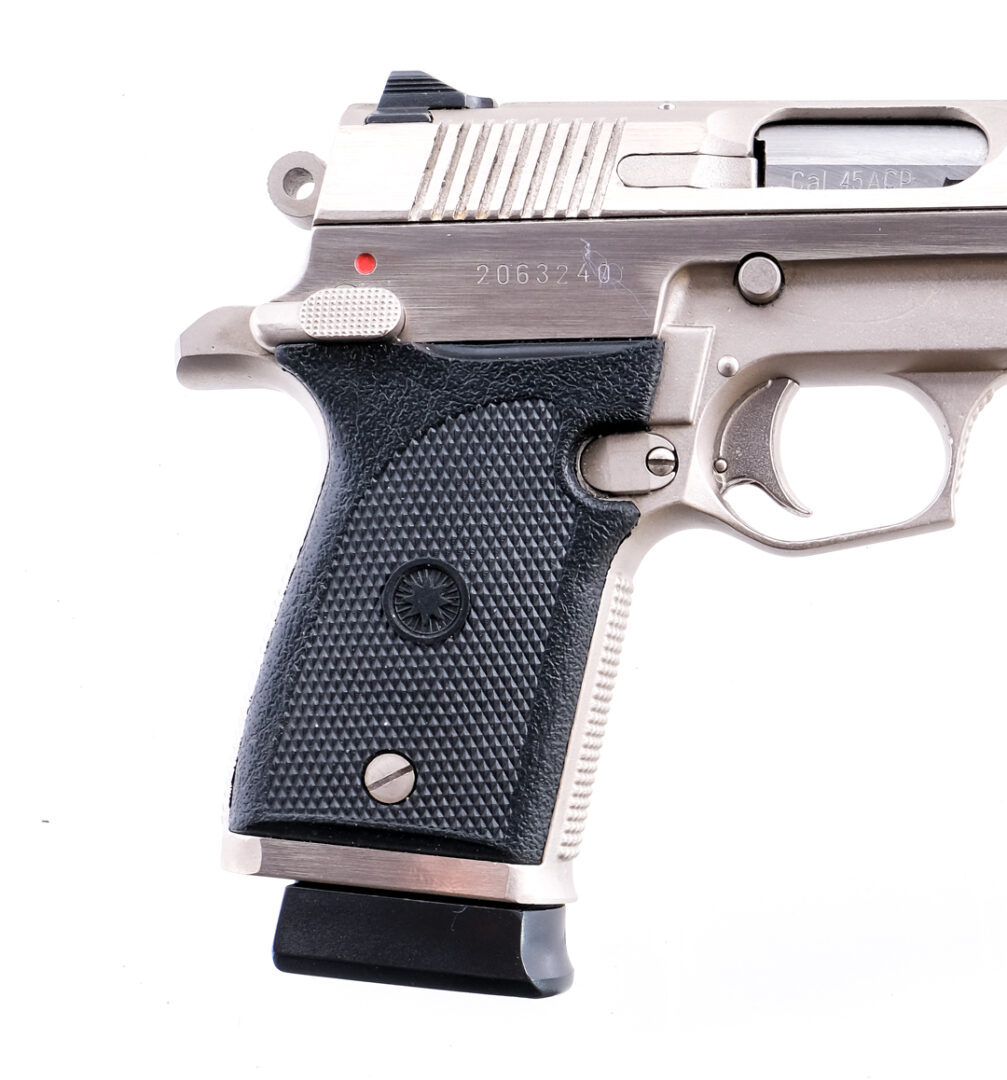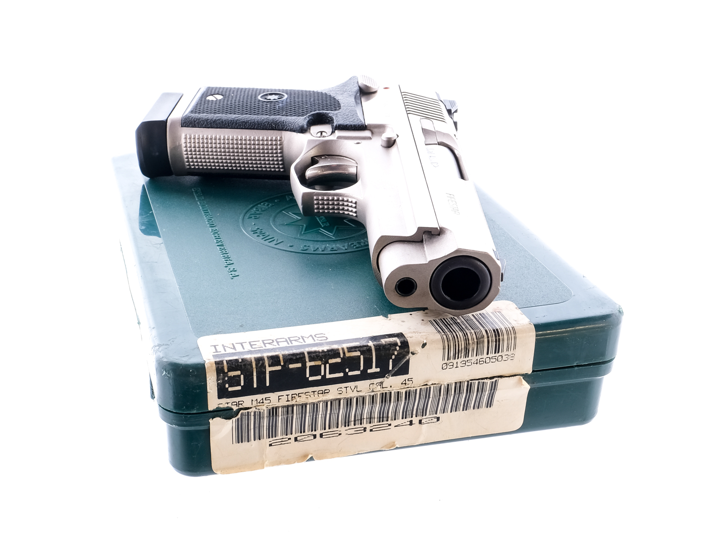Description Star M45 Firestar in .45 ACP with one, six round removable magazine and a 3.5″ barrel. Made in Spain and import marked by Interarms out of Virginia. Checkered hard rubber grip plates. Matte and polished steel frame and serrated slide. Solid untextured trigger and serrated hammer. Left lower side of frame checkered magazine release button. Left side of frame slide release and safety switch. Front and rear fixed white DOT sights. Comes in its factory hard case with matching serial number. Must ship to a FFL holder. Condition: Very Good/Excellent with light handling wear. Clean rifled bore. Barrel Length: 3.5″ Serial: 2063240 Manufacturer: Star Firearms Caliber: .45 ACP Model: M45 Firestar Book# X-146