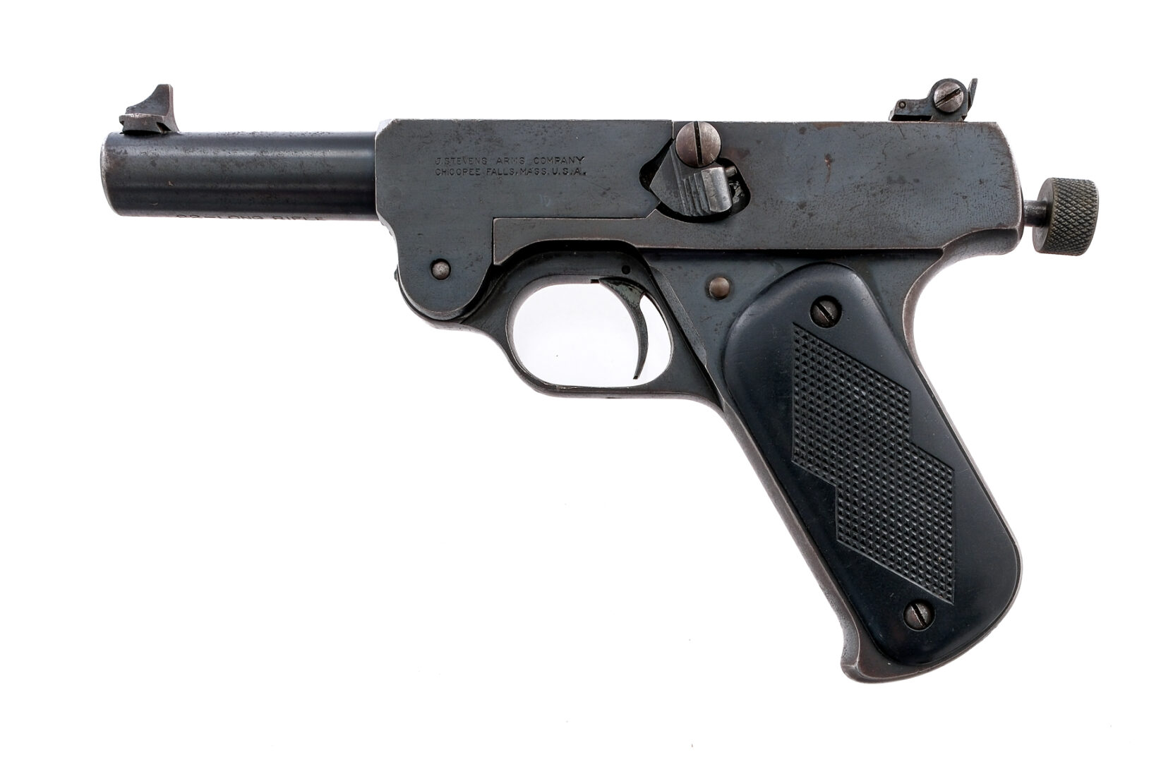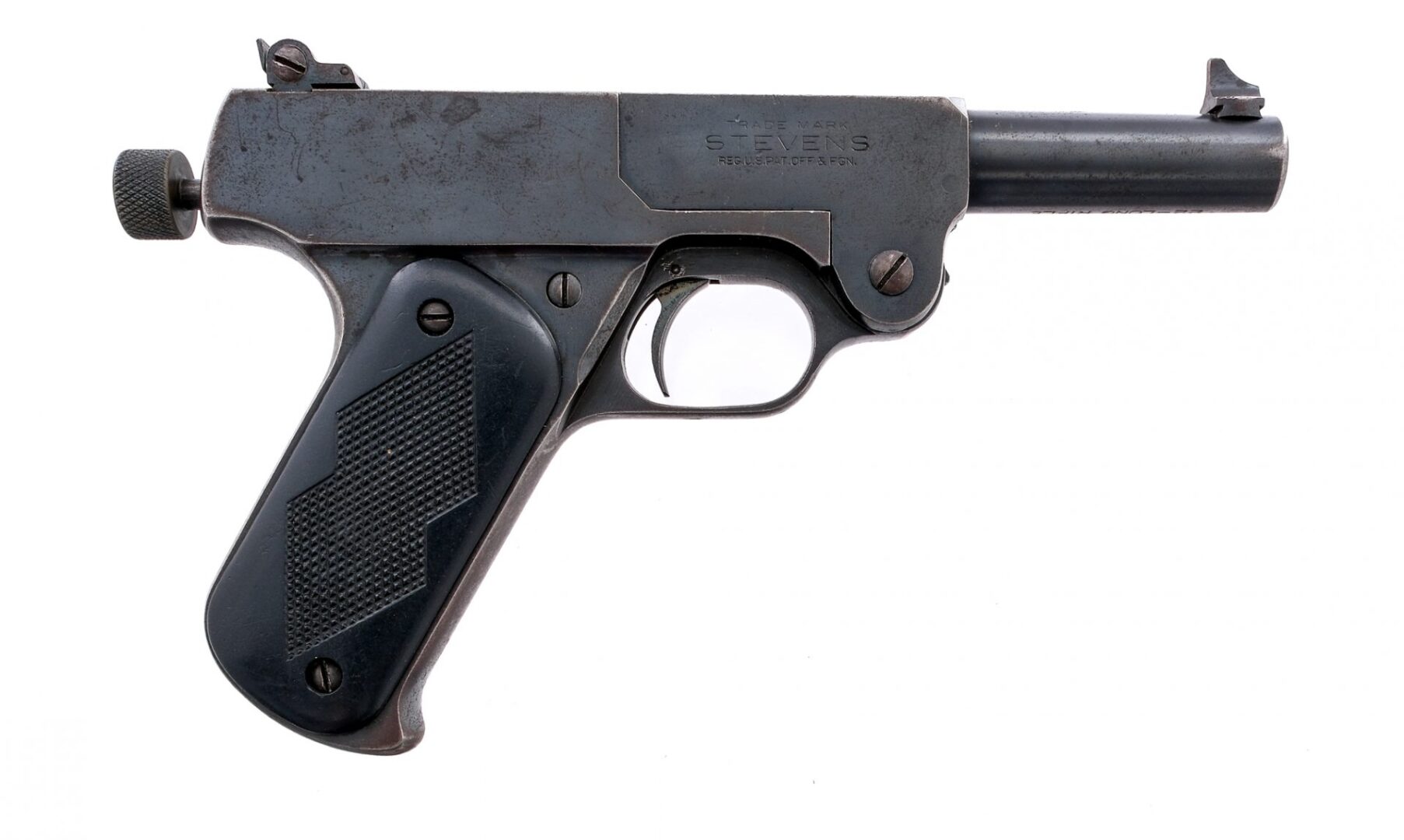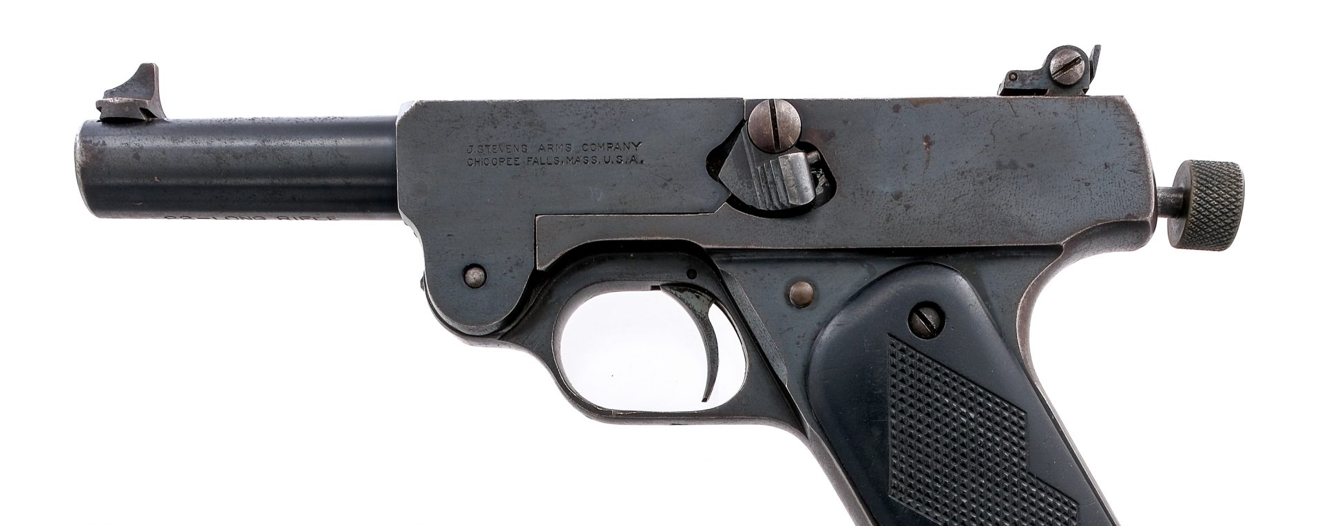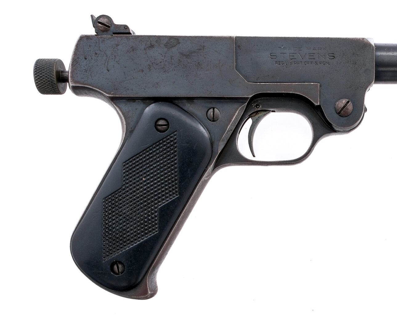 Description J. Stevens Model 10 in .22 Long Rifle with a single round capacity and a 5″ barrel. Checkered composite grip plate. Blued frame, trigger and barrel. Rear frame checkered charging handle. Left side of frame serrated barrel tip up lever. Rear adjustable and front fixed blade sight. Must ship to a C&R or FFL holder. Condition: Good with scratches, finish wear and touches of rust. The rifled bore has light touches of rust. Barrel Length: 5″ Serial: 7541 Manufacturer: J. Stevens Caliber: .22 LR Model: 10 Book# 01600