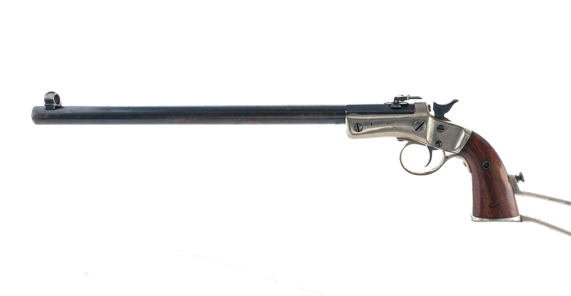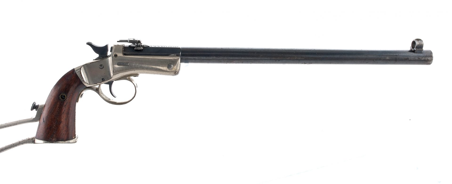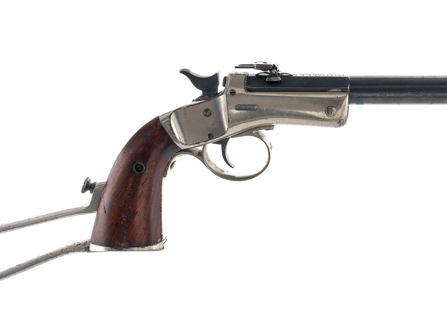 Description Stevens A&T Company New Pocket Rifle (Bicycle Rifle) in .22 caliber with a single round capacity and a 11.75″ barrel. Nickel finished wire shoulder stock. Smooth wood grip plates. Nickel finished trigger guard and frame. Blued trigger, hammer and barrel. Left side of frame barrel tip up button. Rear flip up and front fixed hooded sight. Must ship to a C&R or FFL holder. Condition: Good with scratches, finish wear/loss, missing extractor and spots of rust. The rifled bore has very light spots of rust with visible rifling. Barrel Length: 11.75″ Serial: 20376 Manufacturer: Stevens A&T Co Caliber: .22 Model: New Pocket Rifle Bicycle Rifle Book# 01170