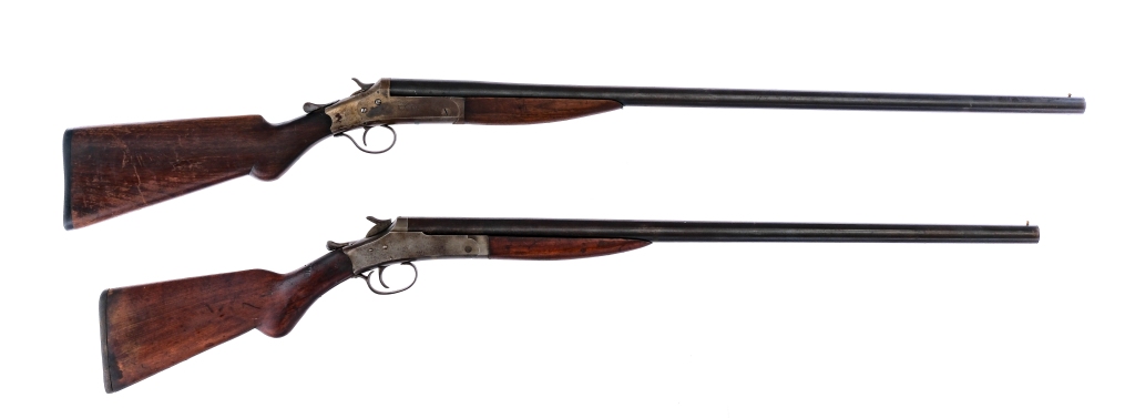 Description This lot is for two break action single-shot shotguns. The first is a Stevens chambered in 12 gauge for 2 3/4″ shells with a 32″ barrel. Has a fixed FULL choke. The second is a Crescent Firearms chambered in 16 gauge for 2 3/4″ shells with a 28″ Genuine Armory Steel barrel. Has a fixed cylinder choke. Both feature blued/case colored finishes. Smooth wood forend and pistol grip stocks with black butt plates. Brass bead front sights. Must ship to a FFL or C&R holder. Condition: Good with patinated and in the white parts. Spots of metal oxidation and pitting. Scratches, scuffs, and dings on the wood. Bright and clean smooth bores. Barrel Length: 32″ 28″ Serial: 342PZ, 152902 Manufacturer: J.Stevens, Crescent Firea Gauge: 12 Gauge, 16 Gauge Model: Single Shot Book# 06051 06050