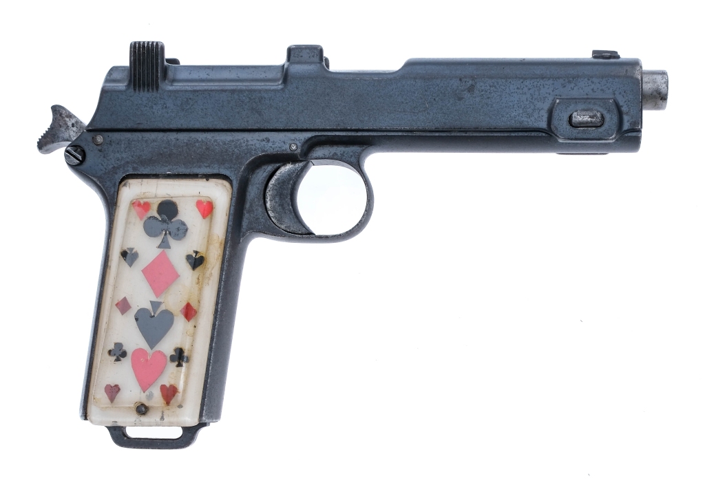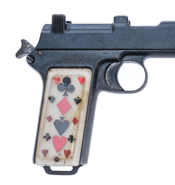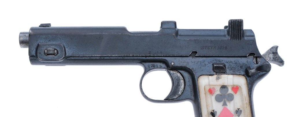 Description Steyr 1912 chambered in 9x23mm with a ten round integral magazine and a 5″ barrel. Manufactured in 1914 with serial number 2721e. Blued steel frame with lanyard loop and polymer card suit grips. Single action trigger and hammer. Frame mounted manual safety. The trigger appears to be dead, unknown cause. Blued serrated slide with stripper clip guide. Small “K” proofs on most of the metal parts. Matching serial number on the frame and slide. Fixed iron sights. Must ship to a FFL holder. Condition: Poor mainly due to the trigger not functioning. Spots and speckling of metal oxidation/patina throughout. Scratches, sharp edge wear, and general cosmetic handling wear. Internal wear from normal operation. Scratches and wear on the grips. Clean rifled bore. SOLD AS-IS. Barrel Length: 5″ Serial: 2721e Manufacturer: Steyr Caliber: 9x23mm Steyr Model: 1912 Book# 05638