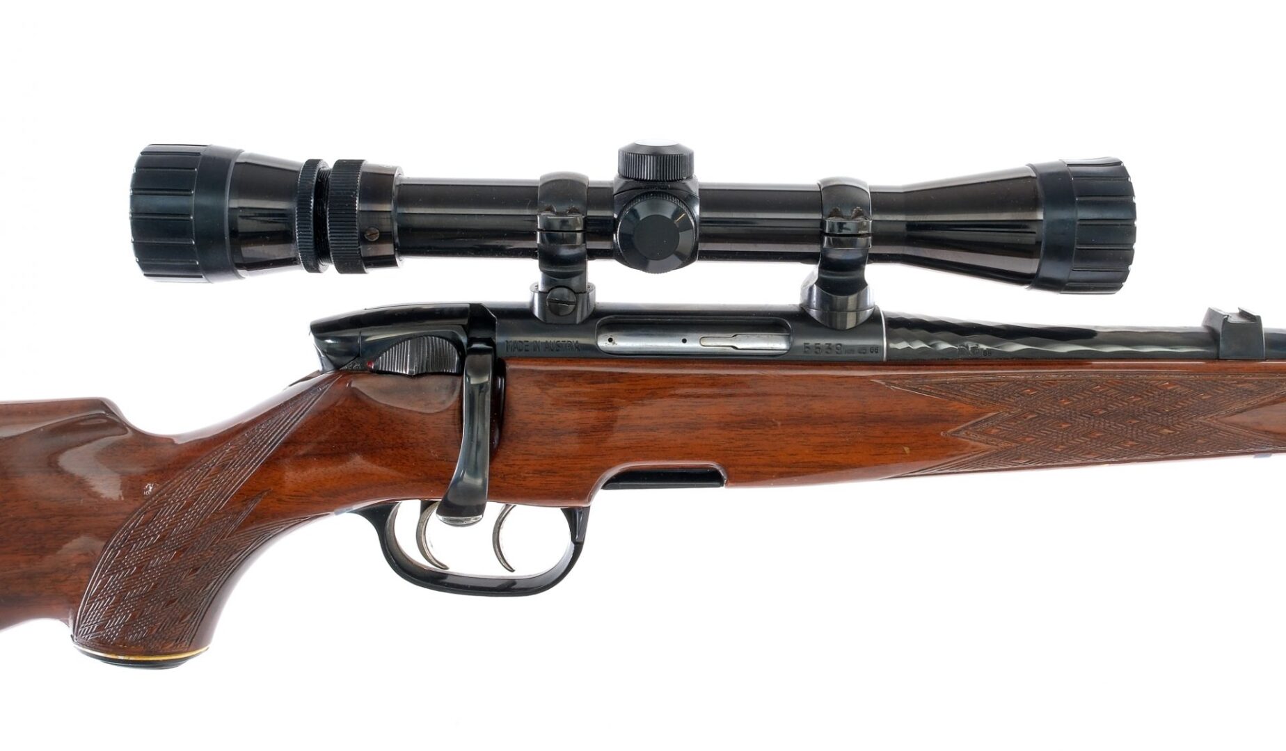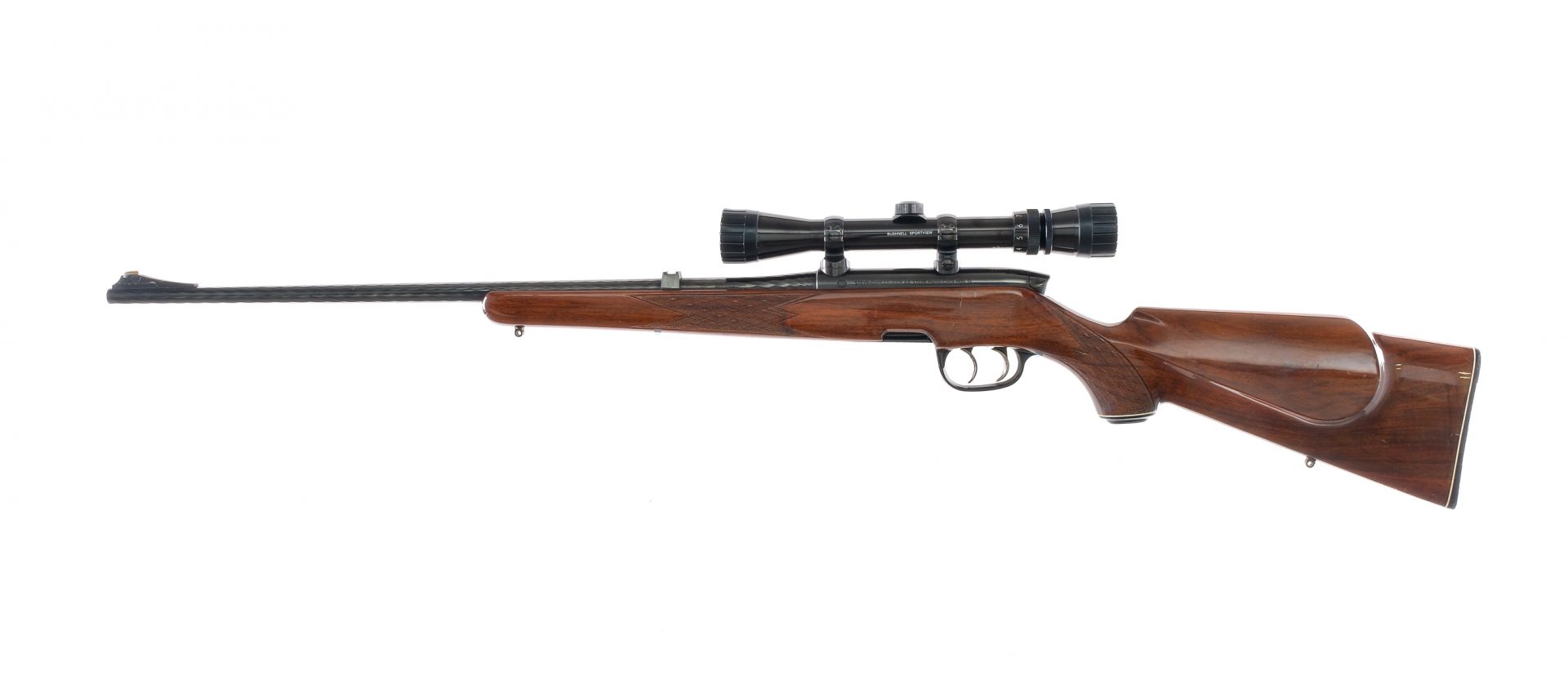 Description Steyr Mannlicher SL chambered in .222 Remington with one, five round rotary magazine and a 23.5″ diamond pattern spiral barrel. Blued barrel, receiver, and bolt handle. Stainless bolt body. Stainless trigger and set trigger with sub 1lb pull. Push to fire safety selector. Ambidextrious trigger guard magazine release. The receiver is drilled and tapped and mounted with a Bushnell 3x9x,32 scope with clear and intact glass. Fixed front blade iron sight. Laminated wood Monte Carlo stock with checkered forend, pistol grip, and ribbed Steyr butt plate. Front and rear sling eyelets. Must ship to FFL holder. Condition: Very Good with light scratches and handling wear. Light scratches, scuffs, and dings on the wood. Some touches on metal oxidation on the sling eyelets. Clean rifled bore. Barrel Length: 23.5″ Serial: 5539 Manufacturer: STEYR ARMS (STEYR MANNLIC Caliber: .222 Remington Model: Mannlicher SL Book# 02637