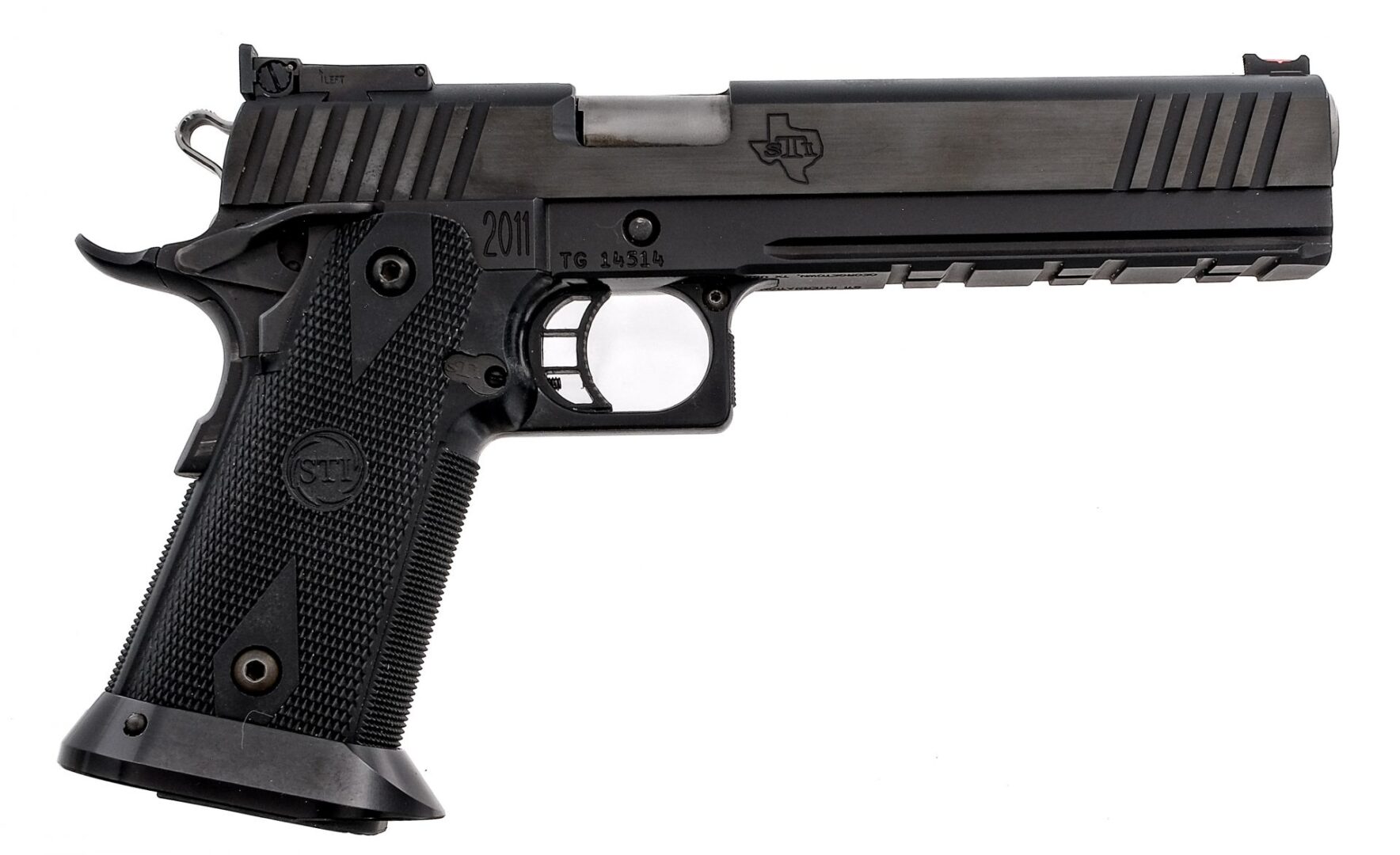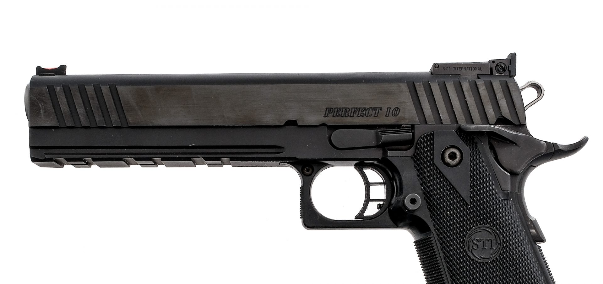 Description STI International Perfect 10 chambered in 10mm Auto with three, fourteen round removable magazines and a 6″ barrel. Fully textured polymer grip frame with flared magazine well. Steel frame with full length under barrel accessories rail. Ambidextrious manual thumb safety and beavertail grip safety. Skeletonized polymer trigger and metal hammer. Blued steel slide with front and rear slide serrations. Adjustable rear sight and fixed red fiber optic front. The rear sight is painted with white lines. Comes in its factory box with factory paperwork, lock, and spare parts. Must ship to a FFL holder. Check local laws regarding “High Capacity” magazines BEFORE bidding. Condition: Very Good with light scratches and wear from normal handling and operation. Clean rifled bore. Barrel Length: 6″ Serial: TG14514 Manufacturer: STI INTERNATIONAL Year: 2011 Caliber: 10mm Auto Model: Perfect 10 Book# 02170