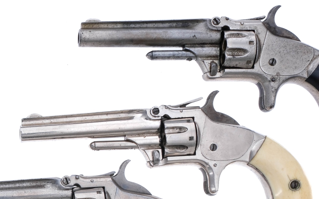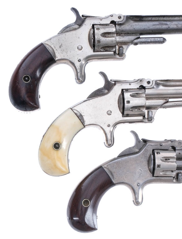 Description This lot is for three Smith & Wesson Model Number 1 3rd Issue revolvers in .22 Rimfire Short. Made in Springfield Massachusetts between 1868 and 1881. Two of them have smooth wood grip plates and the other has natural/bone plates. All three have nickel finished frames, cylinder and barrels. Case colored knurled triggers and hammers. Bottom of barrel located barrel tip up lever. Rear notch and front fixed blade sights. Antique, No FFL required and ships to MOST buyers home. Condition: Antique, Good with scratches, finish wear/loss and rust. All three rifled bores have spots of rust and pitting. Barrel Length: 3.25″ Serial: 119537 71871 56796 Manufacturer: Smith & Wesson Caliber: .22 RF Short Model: 1 3rd Issue Year-Range 1868-1881