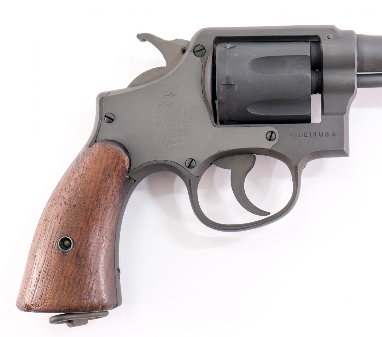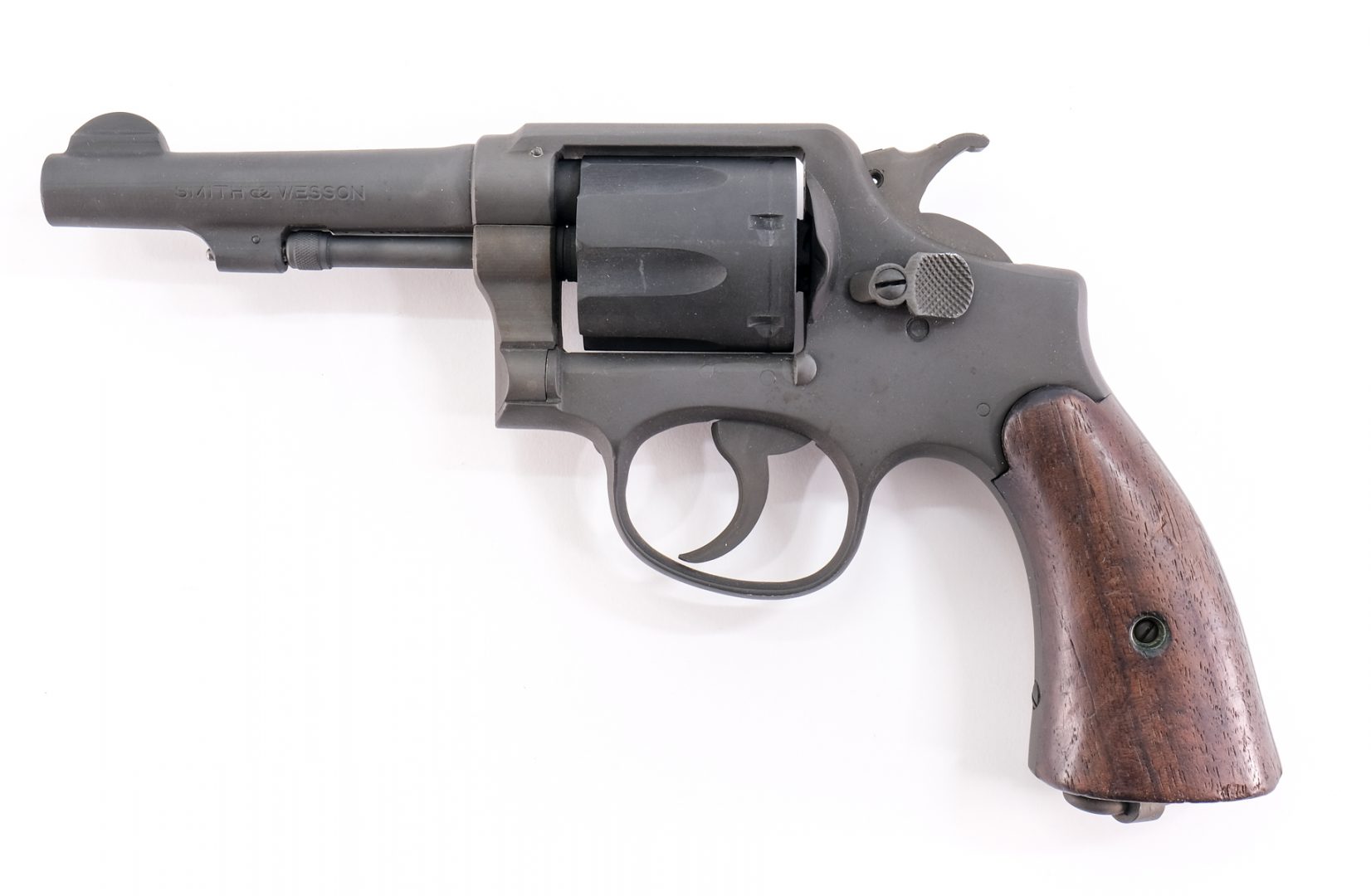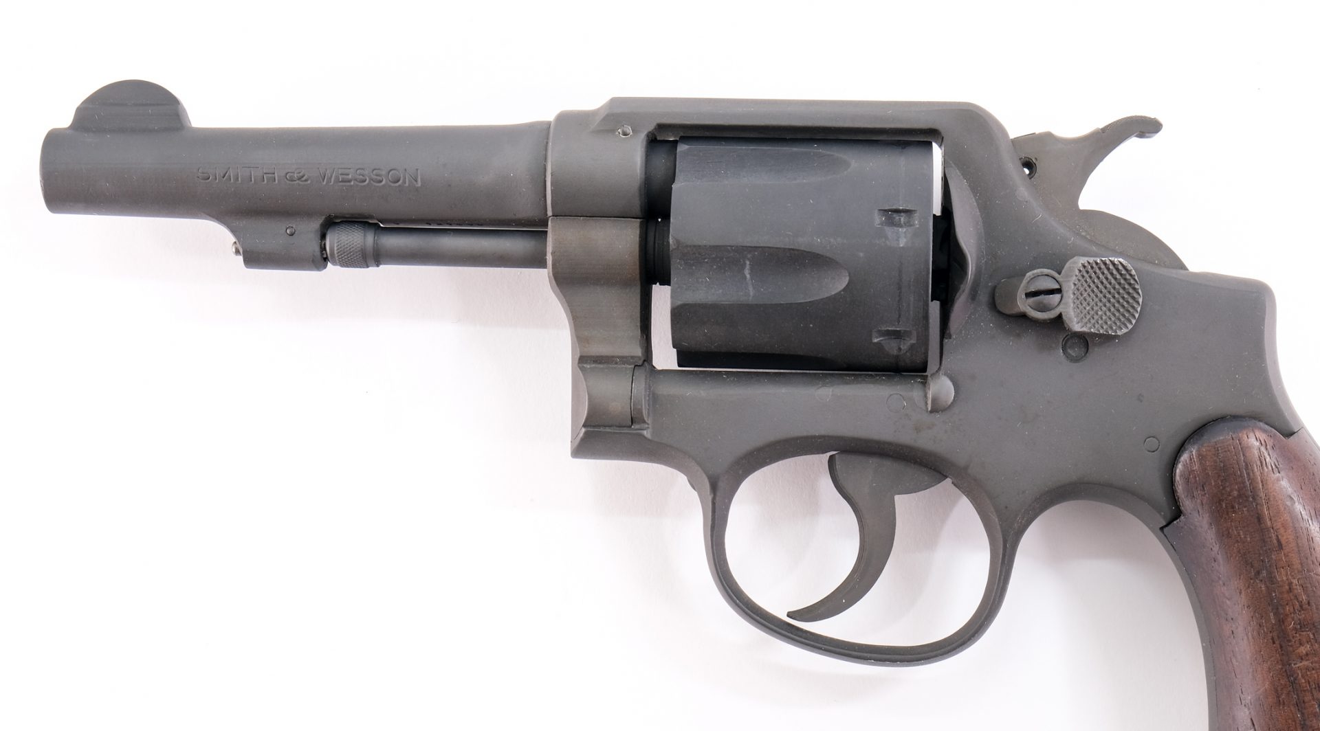 Condition: Good, this gun has various shades of parkerization consistent with other victory model smiths. Small scuffs and scratches to the finish. Very clean rifled bore. Serial numbers matching on all visible parts including the wood grip plates.