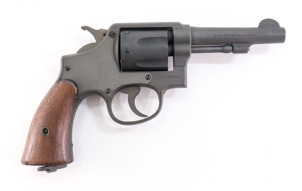 Smith & Wesson model 10 victory in .38 S&W SPL Smith & Wesson Special with a six round capacity and a 4″ barrel. Solid wood grip plates. Parkerized frame, cylinder and barrel. Left side of frame cylinder release. Checkered hammer and serrated trigger. Fixed front blade sight. Lanyard loop on the heel. Must ship to a C&R or FFL holder.