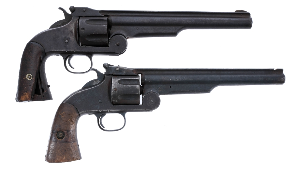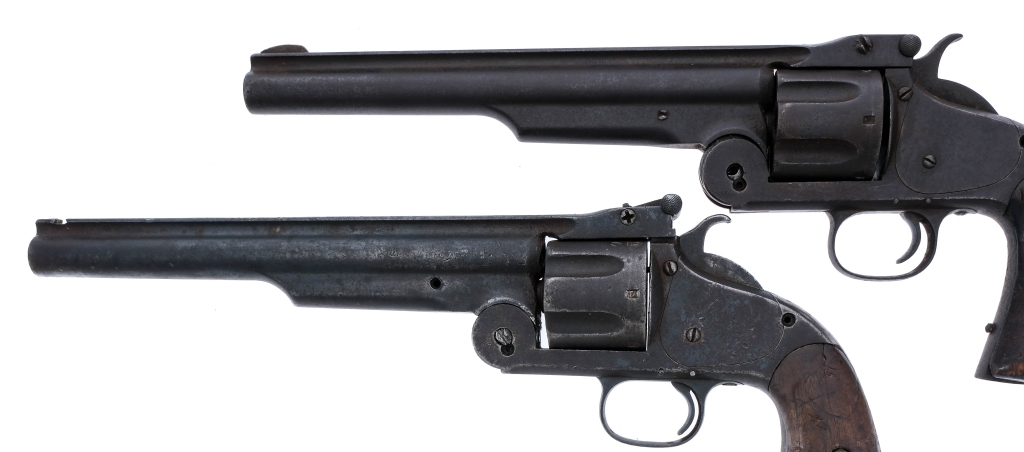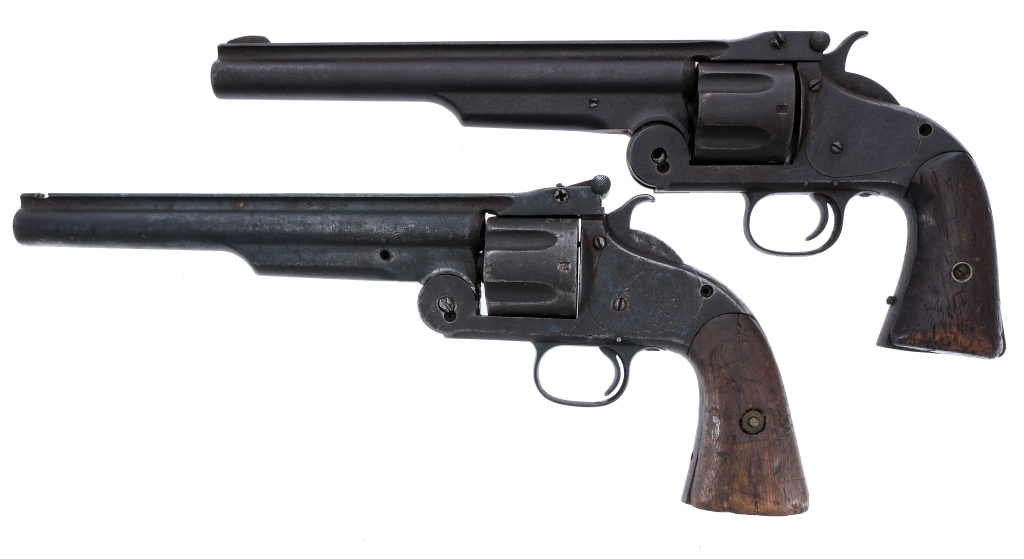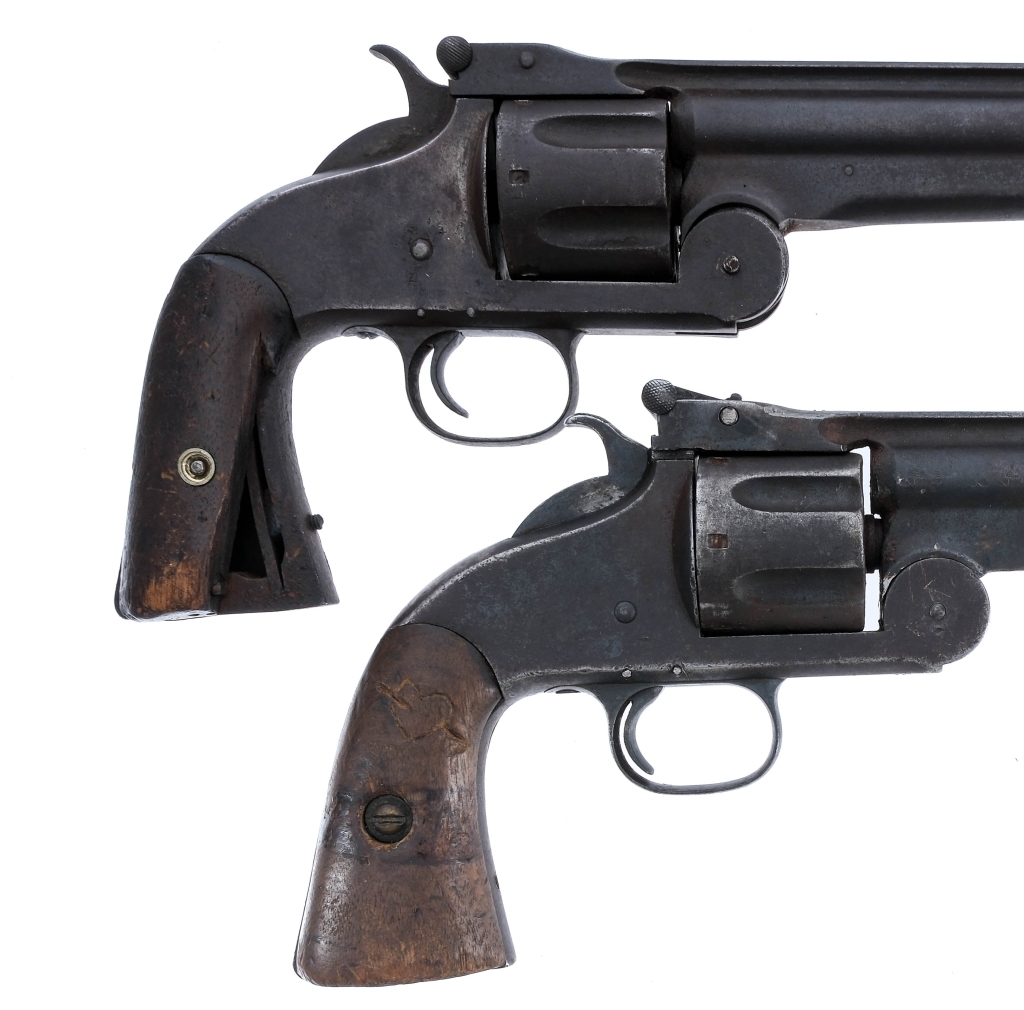 Description This lot is for two Smith & Wesson 1st Model American Revolvers in .44 S&W American with a six round capacity and a 8″ barrel. Made in Springfield Massachusetts between 1870 and 1872. Smooth wood grip plates. Finish worn blued trigger guards, triggers, hammers, cylinders, frames and barrels. Rear notch and front fixed blade sights. Top of barrel located knurled barrel tip up lever. Antique, No FFL required and ships to MOST buyers home. Condition: Antique, Poor with scratches, finish wear/loss, missing/broken parts, rust/pitting and broken grip plates. The rifled bores have rust. SOLD AS-IS. Barrel Length: 8″ 8″ Serial: 4375 2545 Manufacturer: Smith & Wesson Caliber: .44 S&W American Model: 1st Model American Year-Range 1870-1872