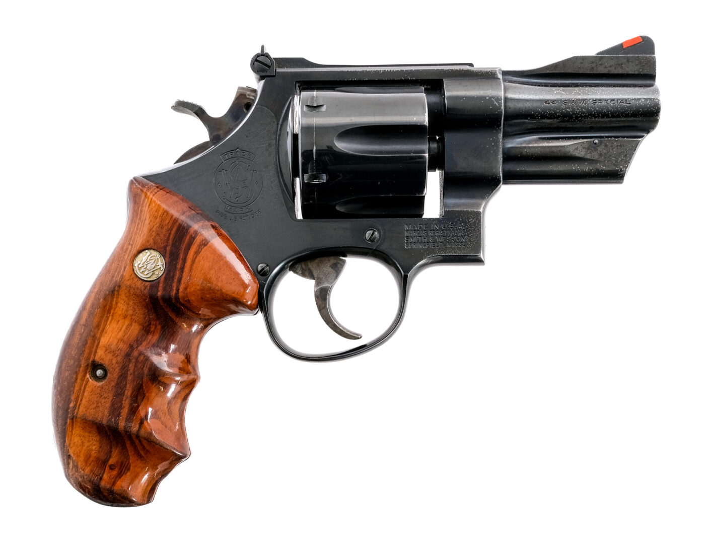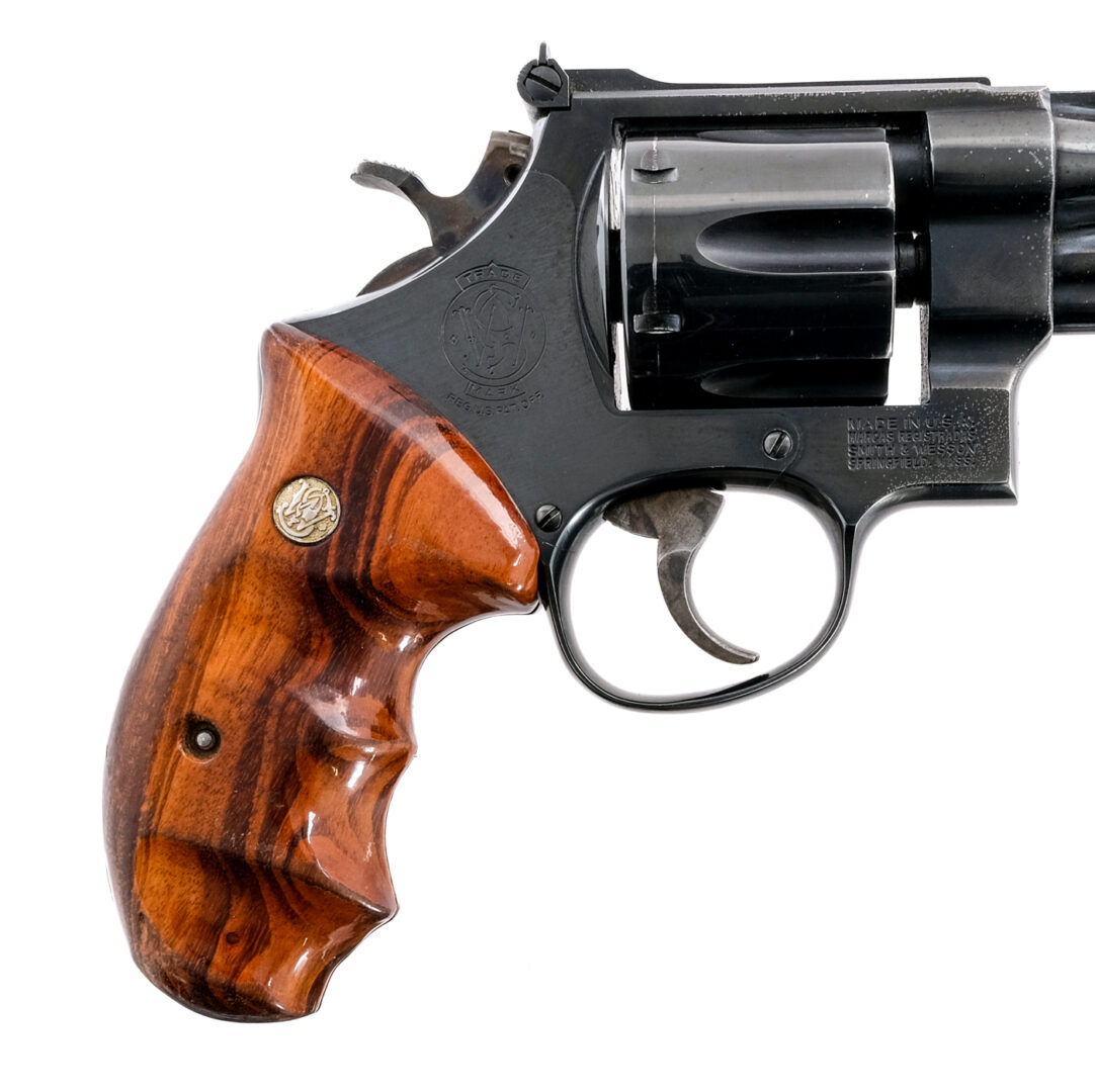 Description Smith & Wesson Model 24-3 in .44 S&W SPL with a six round cylinder capacity with a 3″ barrel. S&W smooth grooved hardwood grip plates. Blued frame, cylinder and barrel. Case colored target serrated trigger and checkered target hammer. Adjustable rear and front fixed blade sight. Left side of frame located checkered cylinder release button. Comes with its factory box with matching serial number, manual, and Pachmayr rubber grip. Made during 1983-84 with only 7,500 ever made. This revolver must ship to a FFL holder. Condition: Good, with extensive bluing wear on right side of firearm, not pitted just speckled finish loss. Visible turn line, with finish loss on high edges of frame and muzzle. Clean rifled bore. Barrel Length: 3″ Serial: AEL0941 Manufacturer: Smith and Wesson Model: 24-3 Year-Range 1983-84 Book# 01216