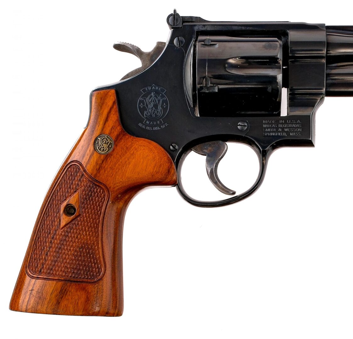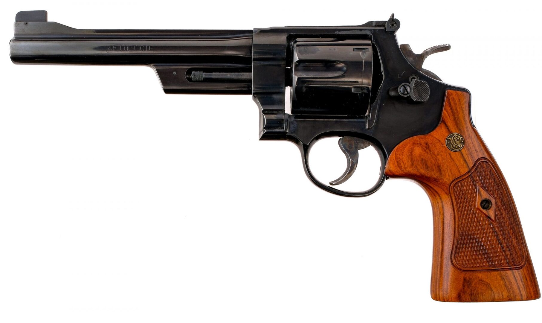 Description Smith & Wesson Model 25-15 in .45 Colt (Long Colt) with a six round capacity and a 6.5″ barrel. Checkered wood grip plates. Blued frame, cylinder and barrel. Case colored serrated Target trigger and checkered Target hammer. Left side of frame checkered cylinder release. Rear adjustable Target and front fixed blade sight. Must ship to a FFL holder. Condition: Good with light scuffs and touches of rust on the cylinder. Clean rifled bore. Barrel Length: 6.5″ Serial: DCF8093 Manufacturer: Smith & Wesson Caliber: .45 Colt Model: 25-15 Year-Range 2006-2007 Book# 04241