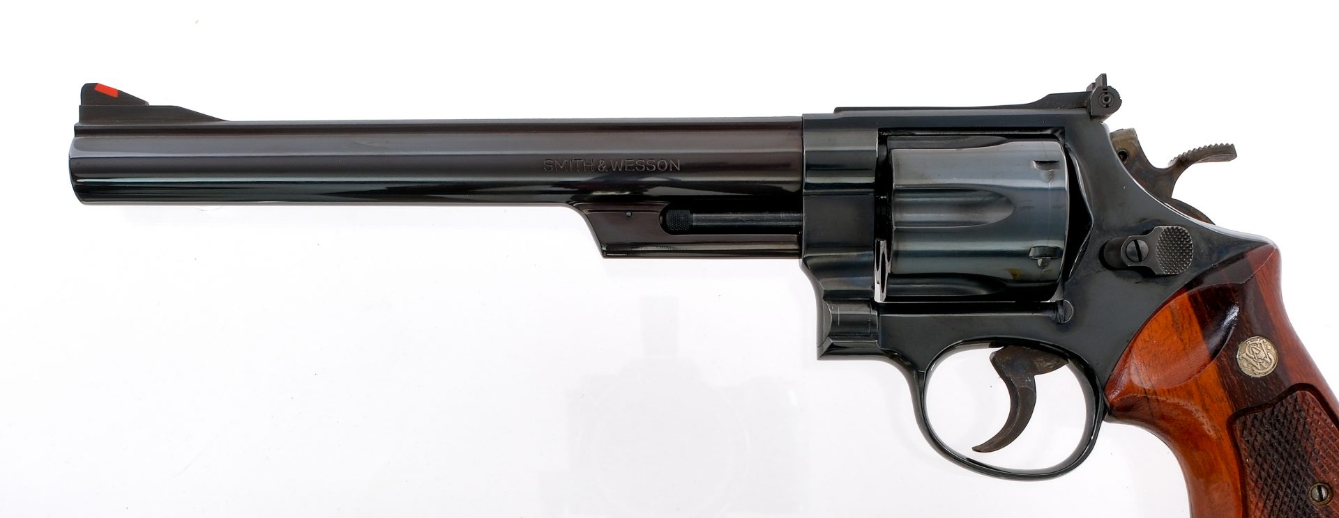 Description Smith & Wesson 29-3 chambered in .44 Remington Magnum with a six-shot cylinder and a 8 3/8″ barrel. Blued barrel, frame, fluted cylinder, and checkered cylinder release. Case colored hammer and trigger. Three Ts with target trigger, hammer, and checkered wood grips. Adjustable rear target sight and red front blade. Comes in its factory box with matching serial number. Must ship to FFL holder. Condition: Good/Very Good with light scratches and wear from normal handling and operation. Drag line on the cylinder. Some finish wear on the contact points and controls. The barrel finish has lightly plumed. Light patina on the case coloring. Very little wear on the grips. Clean rifled bore. Barrel Length: 8 3/8″ Serial: AAM5102 Manufacturer: SMITH & WESSON Caliber: .44 Remington Magnum Model: 29-3 Book# 02232