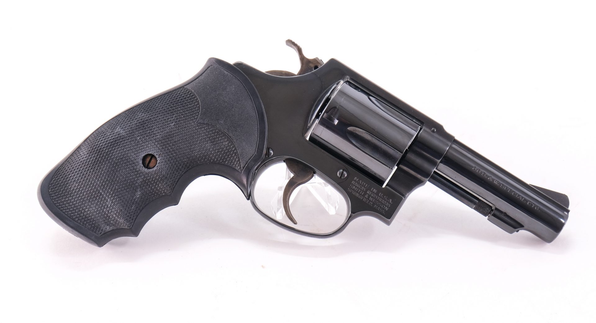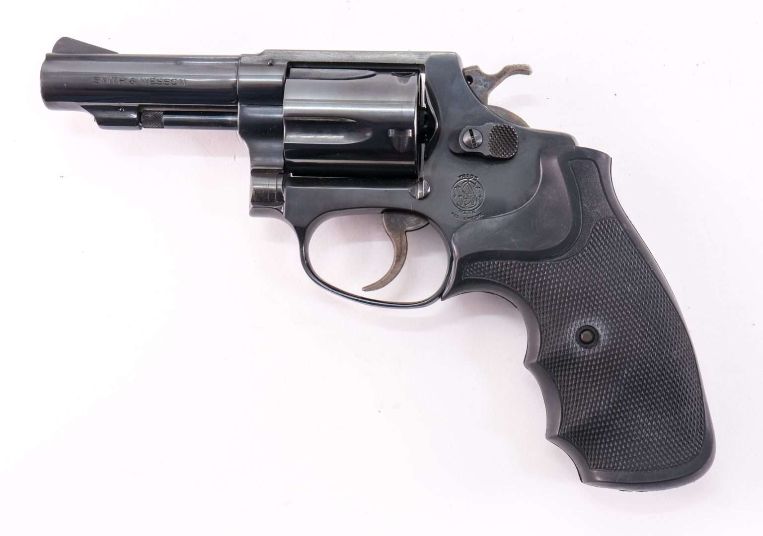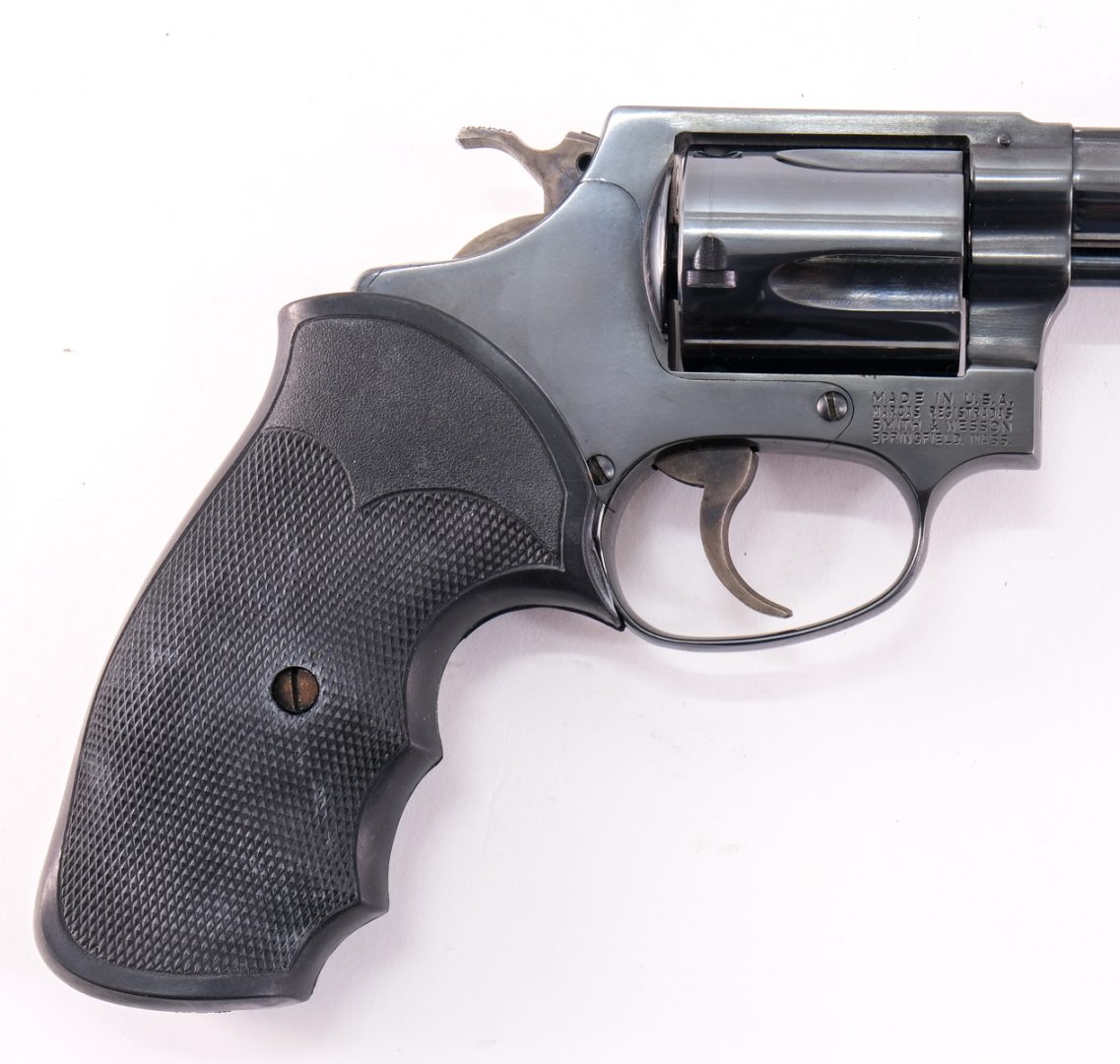 Smith & Wesson model 36-1 Chiefs Special in .38 Smith & Wesson Special with a five round capacity and a 3″ barrel. Checkered rubber “Pachmayr Gripper” grip. Blued frame, cylinder and barrel. Case colored checkered hammer and serrated trigger. Front fixed blade sight. Left side of frame checkered cylinder release. Comes with its original box, and instructions. Marked under the left side of grips on frame “11813” “B13” “B12” “B25”. Marked on the right side of frame under grips “U” in a circle and “H” in a triangle “5752”. Marked “B13” inside the cylinder gate. Must ship to a FFL holder.