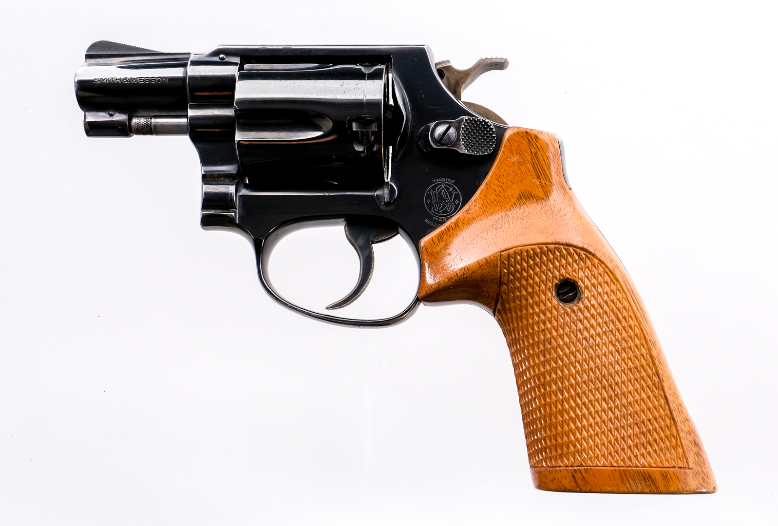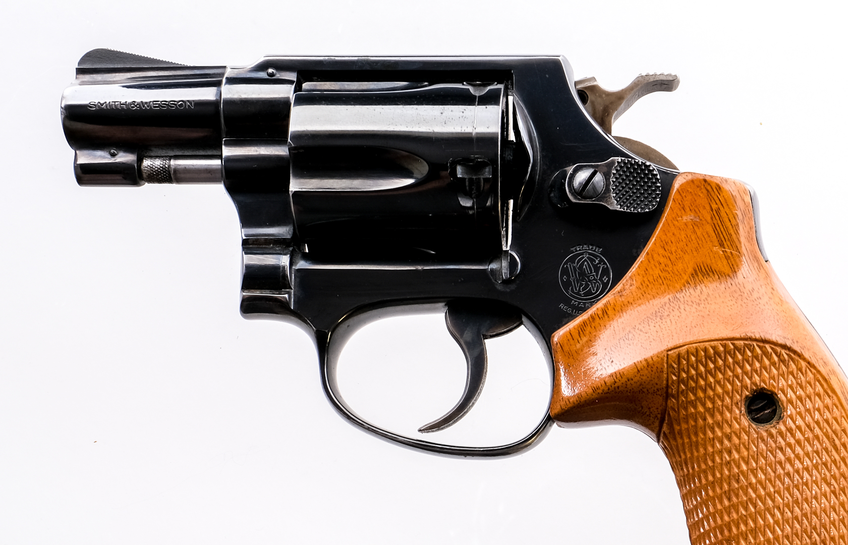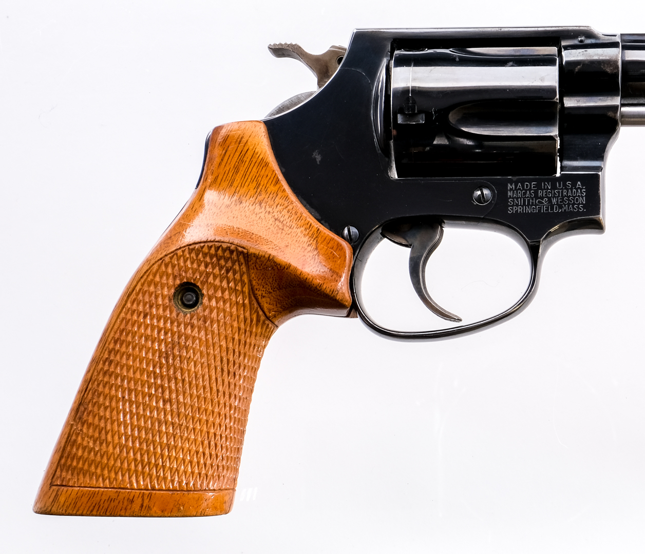 Description Smith & Wesson Model 36 in .38 Smith & Wesson Special with a five round capacity and a 2″ barrel. Checkered aftermarket grip plates. Blued frame, cylinder and barrel. Case colored serrated trigger and checkered hammer. Left side of frame checkered cylinder release. Front and rear fixed sights. Must ship to a C&R or FFL holder. Condition: Very Good with light scuffs and handling wear. Clean rifled bore. Barrel Length: 2″ Serial: 571J49 Manufacturer: Smith & Wesson Caliber: .38 S&W Spl Model: 36 Year-Range 1971-1972 Book# X-205