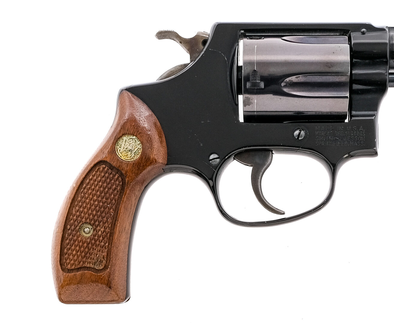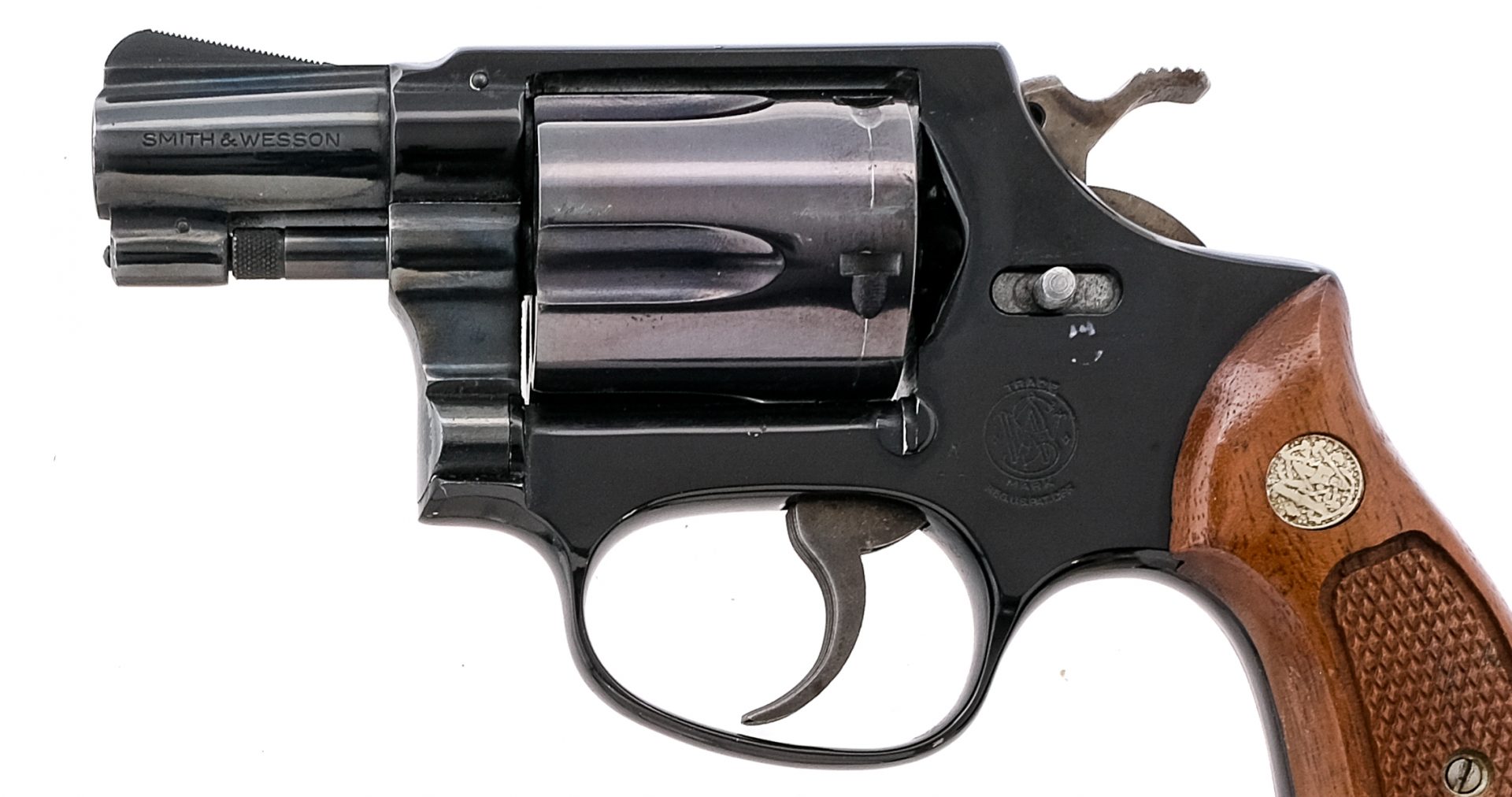 Description Smith & Wesson Airweight Model 37 in .38 Special with a five round capacity and a 2″ barrel. Checkered wood grip plates. Blued frame, cylinder and barrel. Case colored serrated trigger and checkered hammer. Left side of frame cylinder release. Front and rear fixed sights. Must ship to a C&R or FFL holder. Condition: Good, with operational wear and turn line on the cylinder. Possibly reblued frame. Missing cylinder release latch. Small scuff on top of the frame and small scuff under cylinder release latch. Clean rifled bore. Barrel Length: 2″ Serial: 4J4087 Manufacturer: Smith and Wesson Caliber: .38 Spl Model: 37 Airweight Year-Range 1971-72 Book# 01218