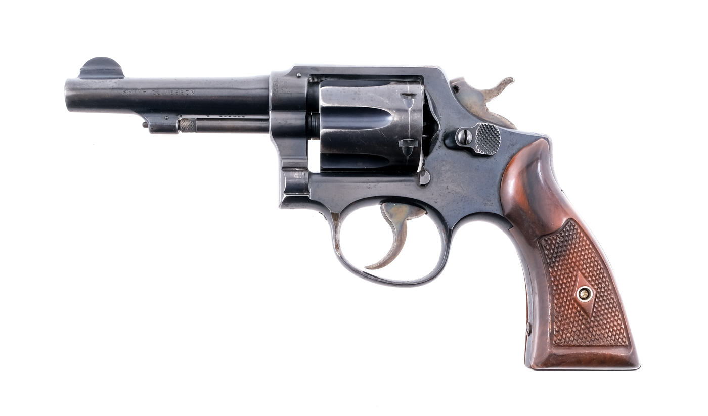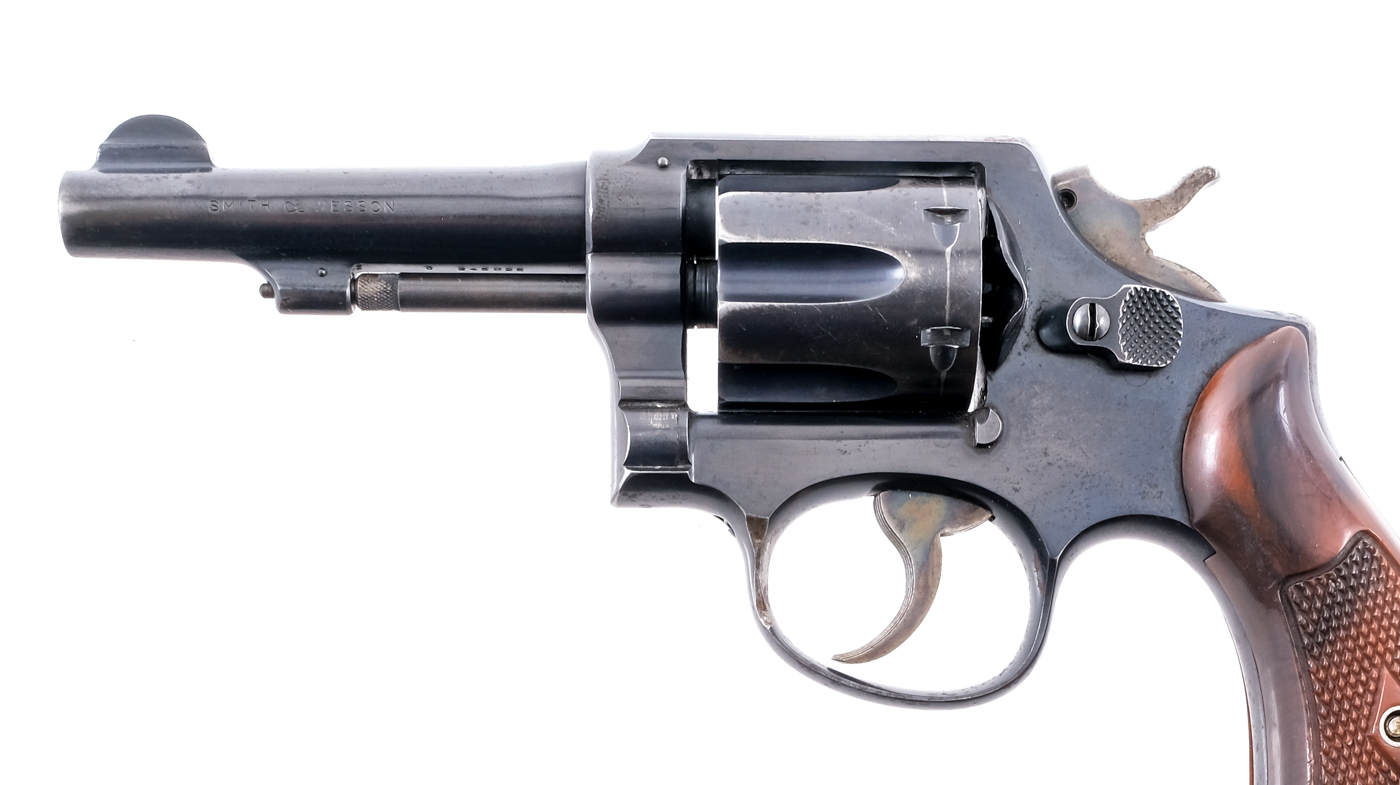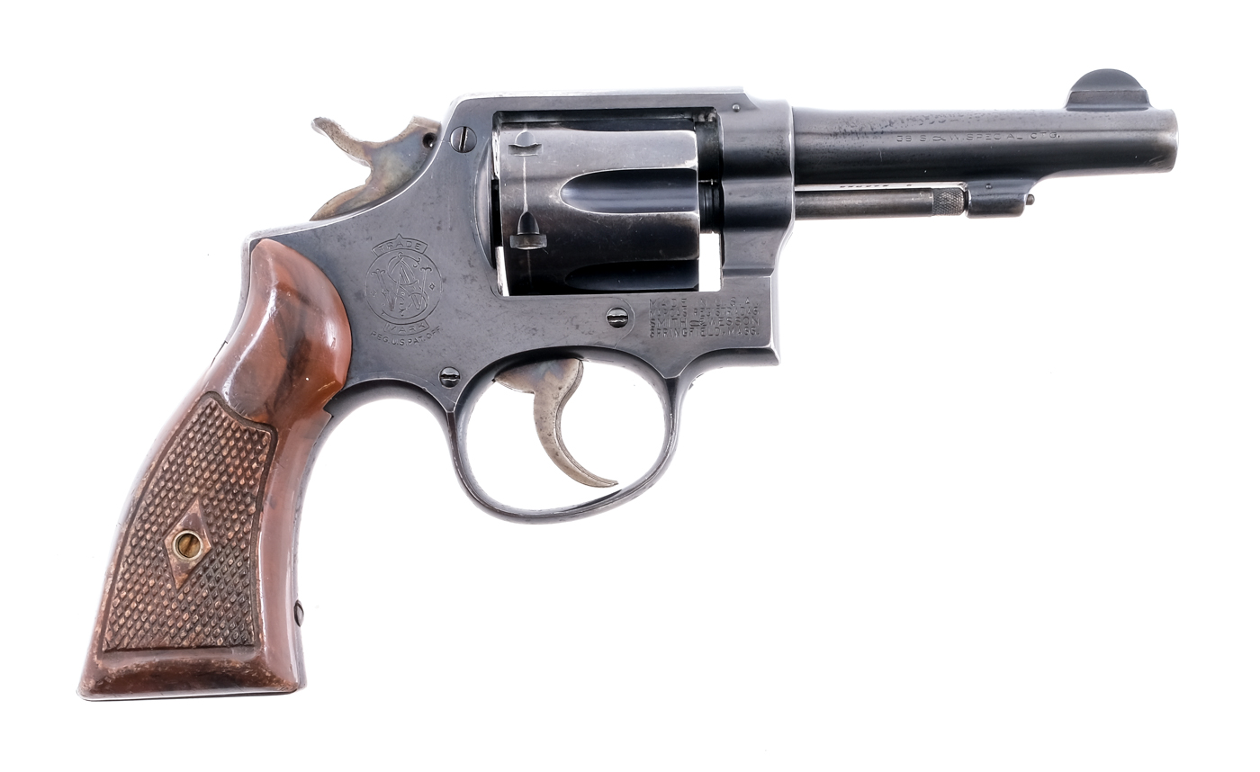 Description Smith & Wesson 38 Military Police “Pre Model 10″ in .38 Special with a six round capacity and a 4″ barrel. Checkered aftermarket composite Marwyn grip plates. Blued frame, cylinder and barrel. Case colored serrated trigger and checkered hammer. Left side of frame checkered cylinder release. Fixed front blade sight. Must ship to a C&R or FFL holder. Condition: Good with light scratches, finish wear/loss and touches of metal oxidation. The underside of the right grip plate has a crack in it. Clean rifled bore. Barrel Length: 3.75” Serial: C245825 Manufacturer: Smith & Wesson Caliber: .38 S&W Spl Model: 10 Book# 9-107
