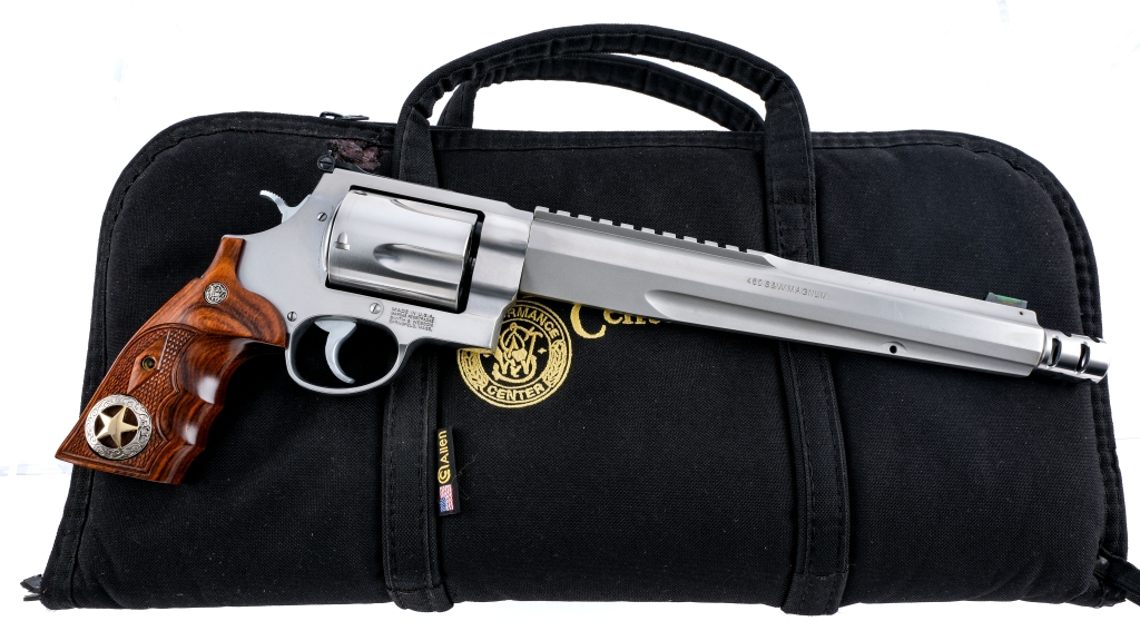 Description Smith & Wesson 460 XVR Performance Center chambered in .460 S&W Magnum with a five-shot cylinder and a 10.5″ barrel with muzzle break. Stainless steel barrel, frame, fluted cylinder, and checkered cylinder release. Picatinny railed barrel for mounting optics. Performance Center tuned action. Chrome hammer and trigger. Checkered wood grips with S&W medallions and inlayed badge. Included original rubber grips. Adjustable rear U-notch and green fiber optic front sight. Must ship to a FFL holder. Condition: Very Good/Excellent with light and operational wear. Light cylinder turn line. Bright and clean bore with strong rifling. Barrel Length: 10.5″ Serial: MMM2041 Manufacturer: SMITH & WESSON Caliber: .460 S&W Magnum Model: 460 XVR Performance Center Book# 07847
