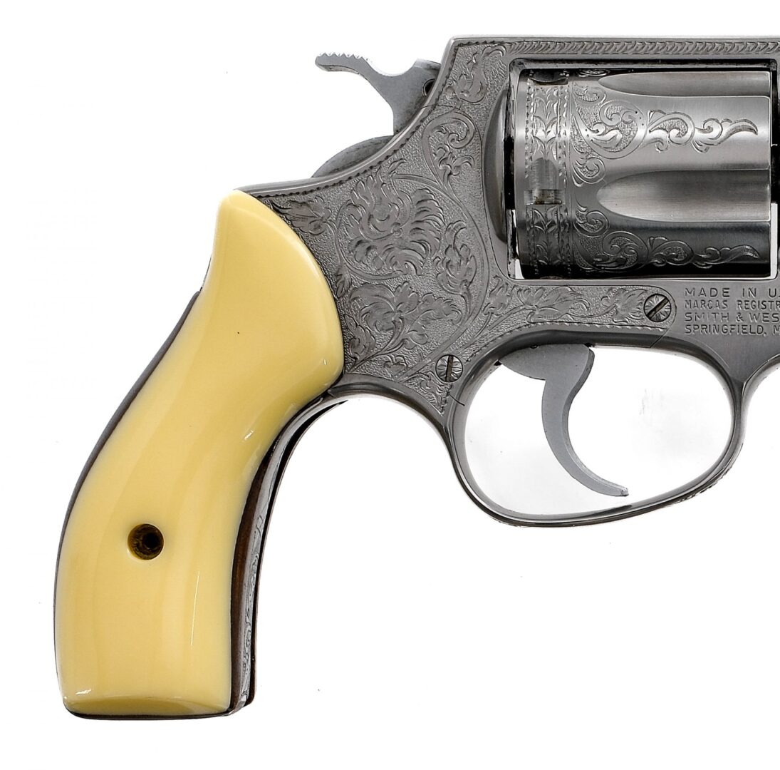 Description Smith & Wesson Model 60 in .38 Smith & Wesson Special with a five round capacity and a 2″ barrel. Aftermarket engraved by retired Winchester Master Engraver Jasper Salerno. His signature is behind the right grip plate on the frame. His initials the date: 80 and a Masonic symbol are his. He was known to use the Masonic symbol when a gun was being purchased by a fellow Masonic member. Stainless steel frame, cylinder and barrel. Serrated trigger and checkered hammer. Left side of frame checkered cylinder release. Front and rear fixed sights. Comes in its factory box with matching serial number, instruction manual, speed loader and receipt for Jasper Salerno’s engraving. Must ship to a FFL holder. Condition: Very Good/Excellent with light handling wear. Clean rifled bore. Barrel Length: 2″ Serial: R246429 Manufacturer: Smith & Wesson Caliber: .38 S&W Spl Model: 60 Year-Range 1969-1971 Book# 03284