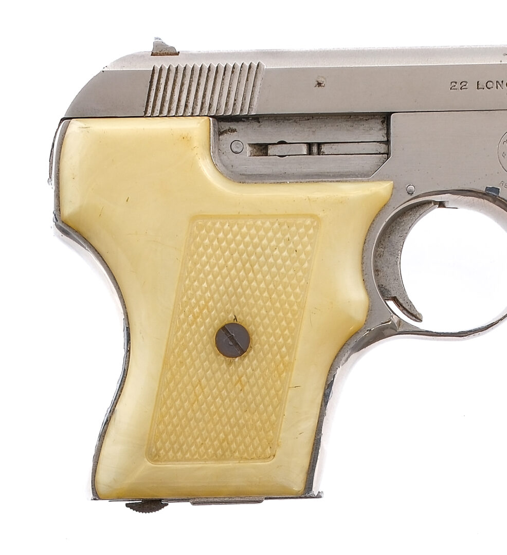 Description Smith & Wesson 61-2 chambered in .22 long rifle with one, five round removable magazine and a 2 1/8″ barrel. Nickel finished frame, serrated slide, and controls. Heel magazine release and magazine safety. Diamond checkered plastic grips. Fixed iron sights. Must ship to FFL or C&R holder. Condition: Good/Very Good with scratches, scuffs, and general finish wear from handling. Some spots of metal oxidation and finish loss. Scratches and scuffs on the grips with strong checkering. Clean rifled bore. Barrel Length: 2 1/8″ Serial: B16644 Manufacturer: SMITH & WESSON Year: 1970 Caliber: .22 Long Rifle Model: 61-2 Book# 01168