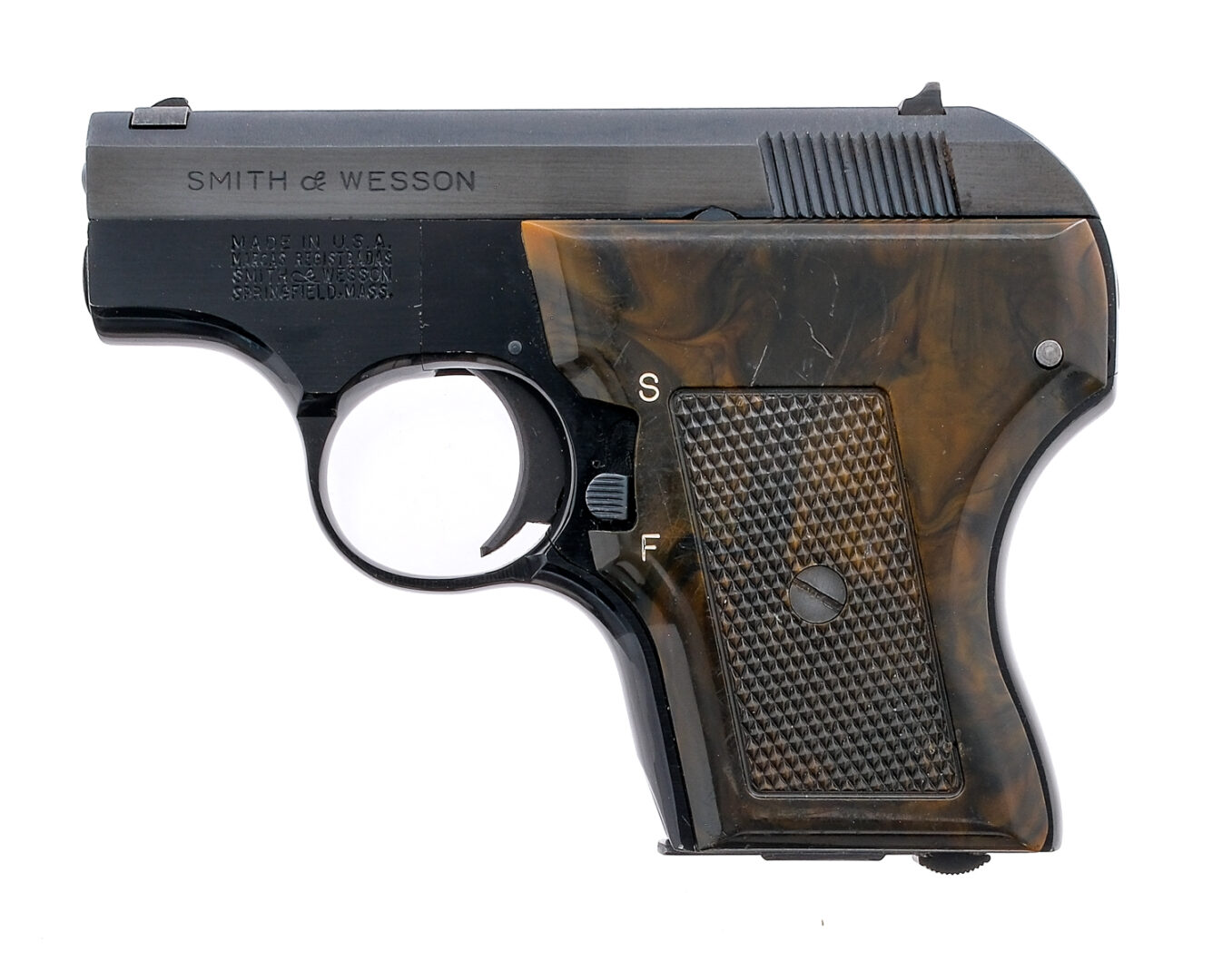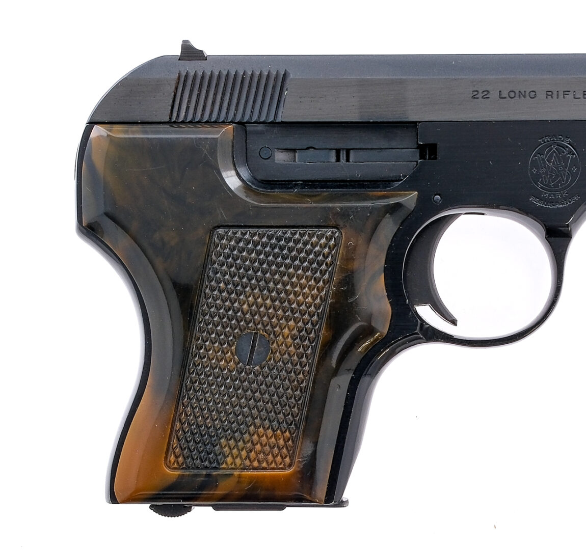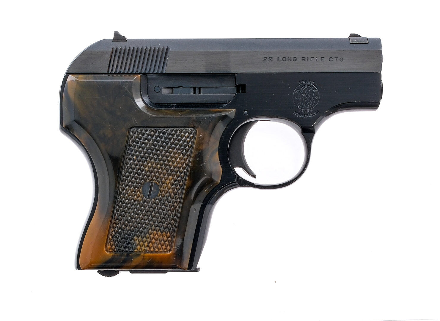 Description Smith & Wesson 61-3 chambered in .22 long rifle with one, five round removable magazine and a 2 1/8″ barrel. Black forged aluminum frame with diamond checkered plastic grips. Heel magazine release and magazine safety lever. Blued serrated slide with fixed iron sights. Must ship to FFL or C&R holder. Condition: Very Good+ with light scratches and handling wear on the finish and the grips. Clean rifled bore. Barrel Length: 2 1/8″ Serial: B56650 Manufacturer: SMITH & WESSON Year: 1971 Caliber: .22 Long Rifle Model: 61-3 Book# 02099