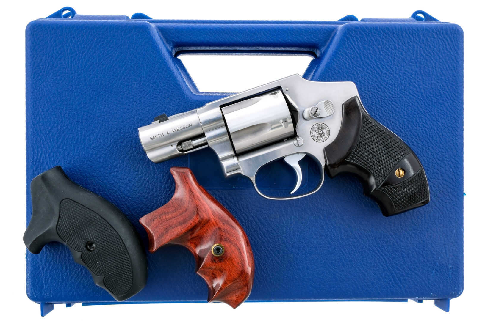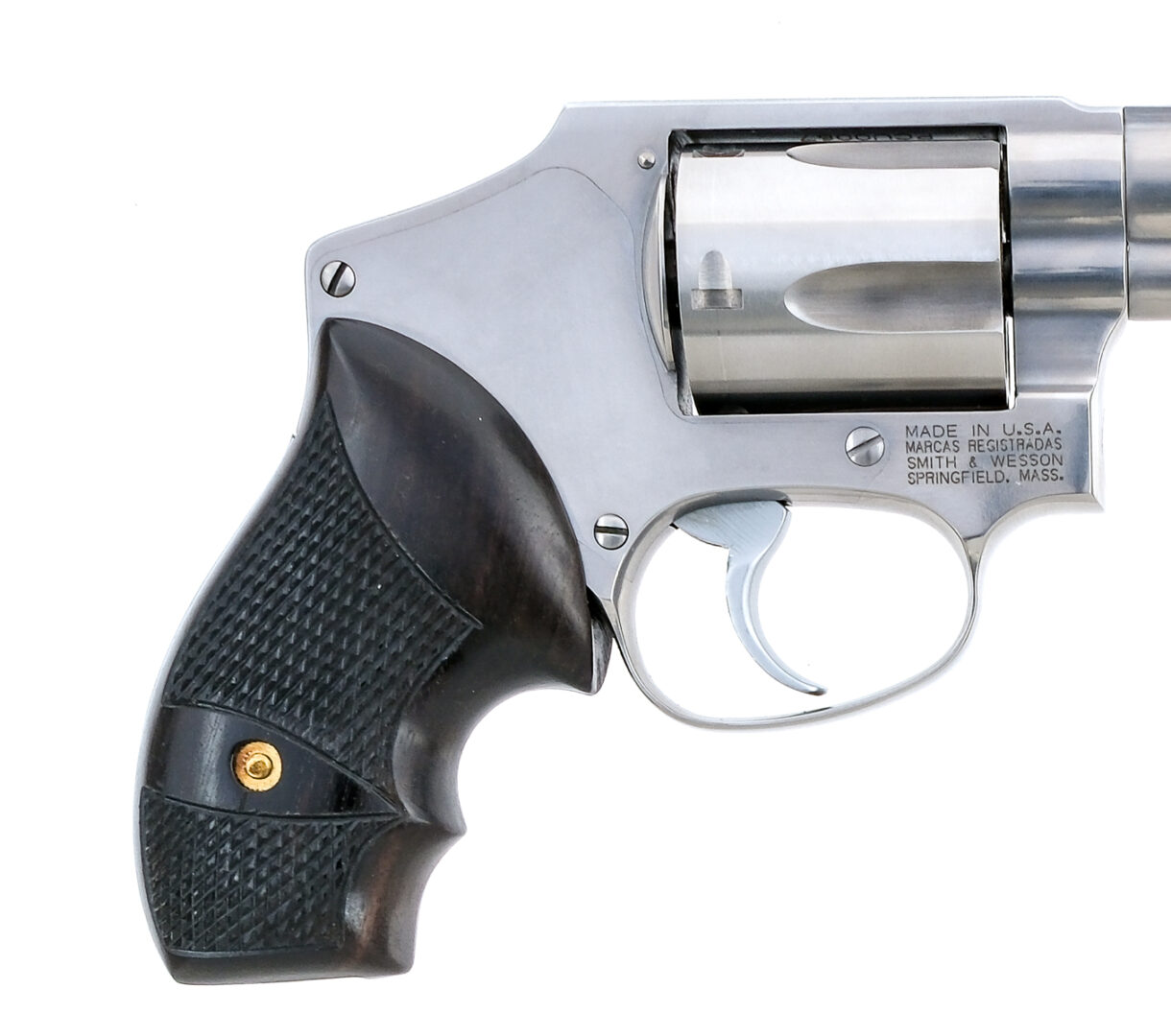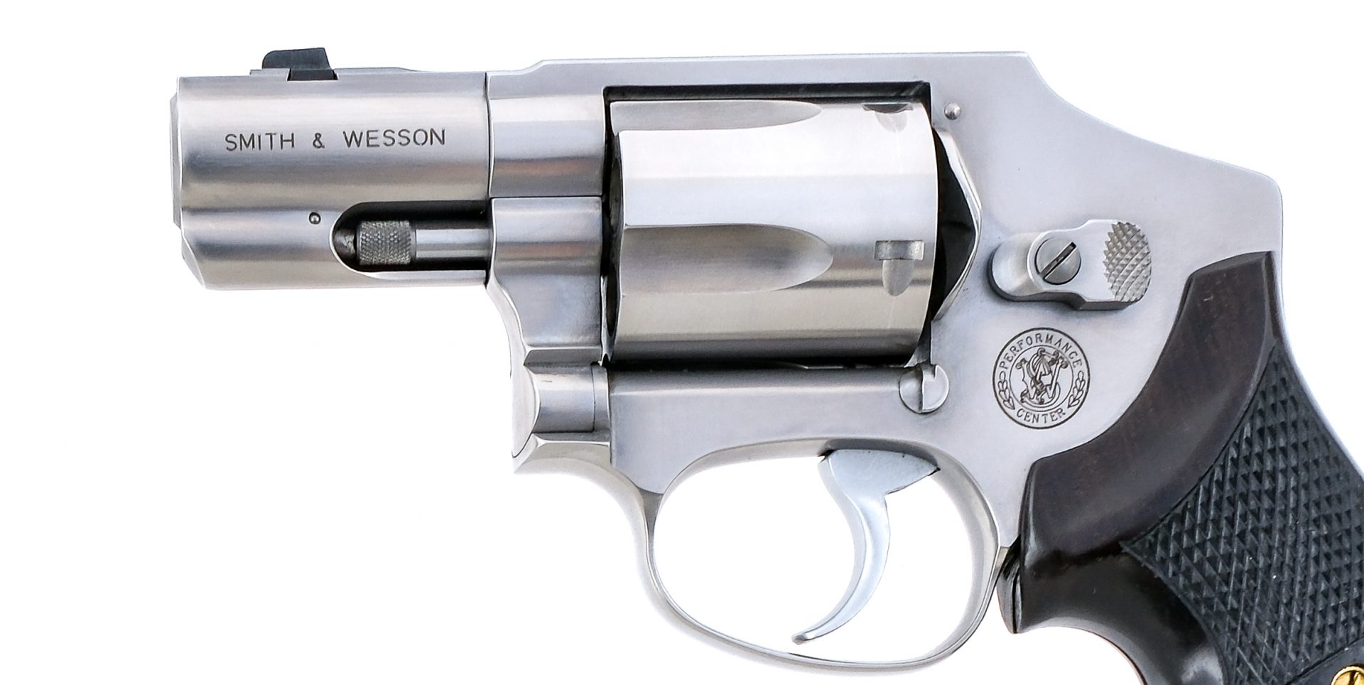 Description Smith & Wesson 640 Performance Center Product number 170043, chambered in .38 special with a five-shot cylinder and a 2″ ported snub nose barrel. Stainless steel barrel, frame, fluted cylinder and checkered cylinder release. Double action only trigger with bobbed internal hammer. Checkered wood grips. Rear notch and white dot front blade iron sights. Comes in its factory box with factory paperwork, extra wood grips, and checkered rubber grips, Must ship to a FFL holder. Condition: Very Good/Excellent with light scratches and cosmetic wear from normal handling. Light cylinder turn line and internal wear from operation/firing. Clean rifled bore. Barrel Length: 2″ Serial: PCU0067 Manufacturer: SMITH & WESSON Caliber: .38 Special Model: 640 Performance Center Book# 06117