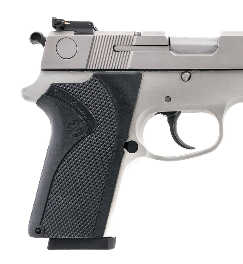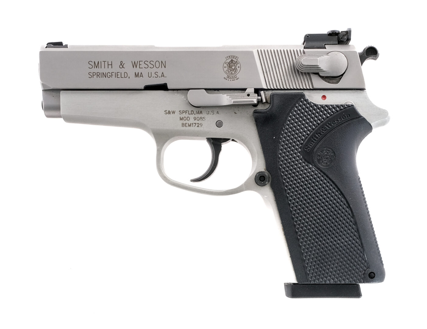 Description Smith & Wesson 908S chambered in 9mm with two, eight round removable magazines and a 3.5″ stainless barrel. Stainless aluminum alloy frame with checkered composite S&W wrap around grips. Textured push button magazine release and slide stop. Double/single action trigger with exposed hammer Stainless steel serrated slide with a manual thumb safety/de-cocking lever. White three dot sights with adjustable rear. Comes in its box with matching serial number, factory paperwork, extra bobbed hammer, and two magazines. Must ship to FFL holder. Condition: Good/Very Good with light scratches, scuffs, and general cosmetic wear from handling. Some touches of metal oxidation on the slide and the rear sight. Light operation wear on internal parts. Clean rifled bore. Barrel Length: 3.5″ Serial: BEM1729 Manufacturer: SMITH & WESSON Caliber: 9x19mm Parabellum Model: 908S Book# 01982