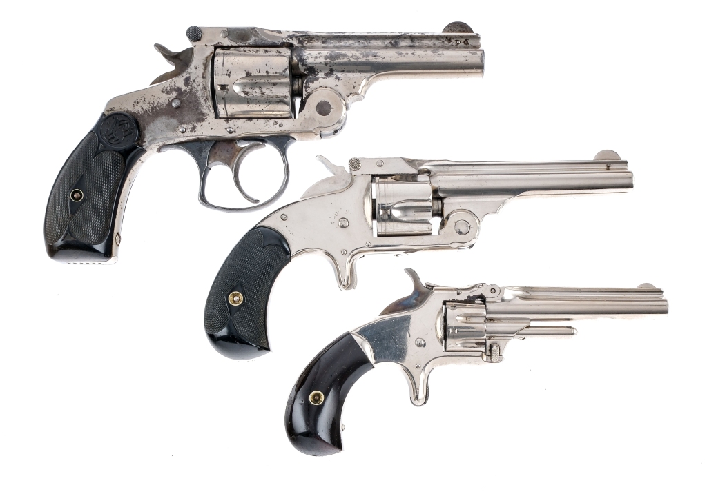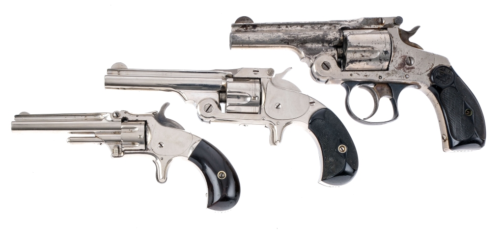 Description This lot is for three Antique revolvers manufactured by Smith & Wesson. First is a model .32 Single Action aka model 1 1/2 Centerfire. Chambered in .32 S&W CF with a five-shot cylinder and a 3.5″ barrel. Manufactured circa 1878-1892 with serial number 4150. Full Nickel finish including the trigger, hammer, and barrel latch. Checkered hard rubber grips. Single action spur trigger and checkered hammer. Fixed rear notch and round front blade. The second revolver is a Model 1 3rd Issue chambered in .22 Rimfire with a seven-shot cylinder and a 3 3/16″ rounded ribbed barrel. Manufactured circa 1868-1881 with serial number 108137. Nickel finished barrel, rod, frame, and fluted cylinder. Case colored single action trigger and hammer. Smooth Rosewood birds head grips. Rear notch and rounded front blade iron sights. The third and final revolver is a model .38 Double Action 3rd model chambered in .32 S&W with a five-shot cylinder and a 3 1/4″ barrel. Manufactured circa 1884-1895 with serial number 129958. Nickel finished barrel, frame, and fluted cylinder, Blued trigger guard and barrel latch. Case colored double action trigger and hammer. Checkered hard rubber grips with S&W monograms. Rear notch and round front blade iron sights. All three are antique and can directly to the buyers home in MOST states. Condition: The model 1 1/2 is antique very good with light scratches, contact marks, and handling wear. Cylinder turn lines and normal operational wear. Some speckling of metal oxidation. Bright and clean bore with strong rifling. The model No 1 3rd Issue is antique very good with scratches and cosmetic handling wear. Spots of finish loss/patina. Some speckling of metal oxidation. Cylinder turn line and light operational wear. Light scratches and wear on the grips. Bright and clean bore with strong rifling. The model .38 DA is antique good with spots of metal oxidation, patina, and tarnish throughout. Light scratches and handling wear. Cylinder turn line and operational wear. Light scratches on the grips. The bore is bright with some spots of rust, strong visible rifling. All three appear to function properly, without test firing. Barrel Length: 3.5″ Serial: 4150 Manufacturer: SMITH & WESSON Caliber: .32 S&W, .22 RF, .38 S&W Model: 11/2 CF, No.1 3rd Issue, .38 DA 3rd Year-Range 1868 – 1895