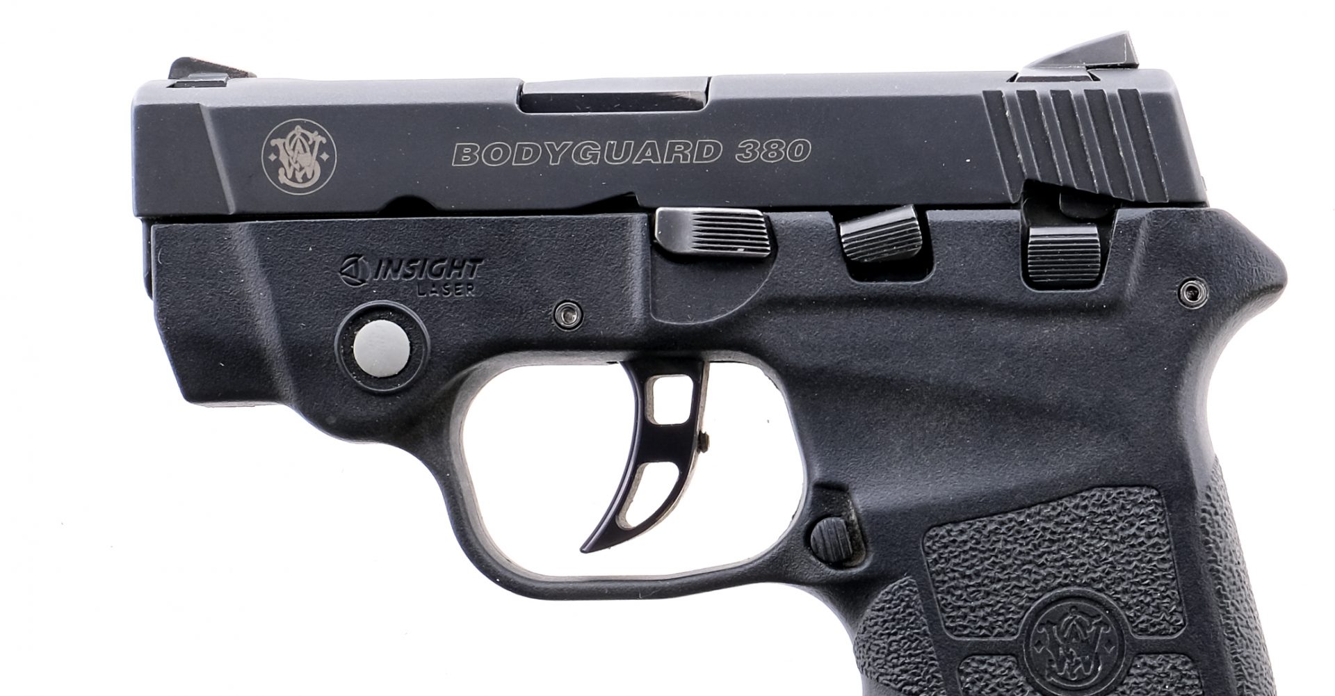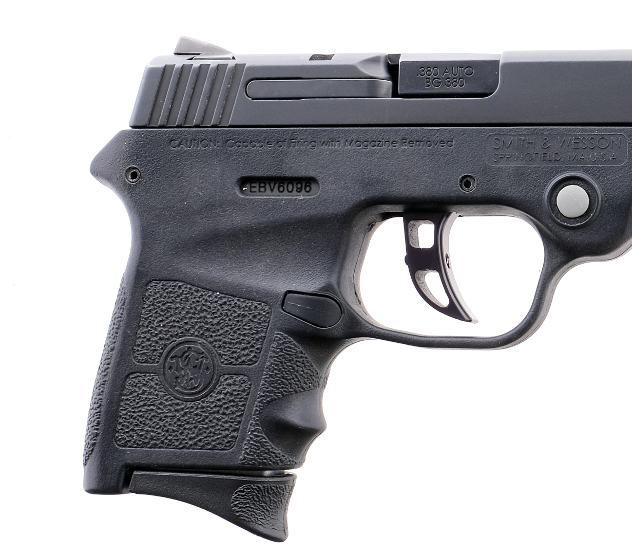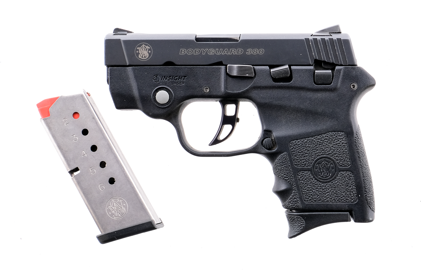 Description Smith & Wesson Bodyguard in .380 caliber with two, six round removable magazines and a 2.75″ barrel. Textured grip on composite frame. Blued skeletonized trigger, serrated slide and barrel. Lower left side of frame serrated magazine release button. Left side of frame serrated take-down lever, slide release and slide stop safety. Front and rear fixed sights. Under barrel built in Insight Laser, working but needs new battery. Comes in a soft zipper carry case with two magazines. Must ship to a FFL holder. Condition: Very Good/Excellent with light scuffs and handling wear. Clean rifled bore. Barrel Length: 2.75″ Serial: EBV6096 Manufacturer: Smith & Wesson Caliber: .380 Model: Bodyguard 380 Book# X-008