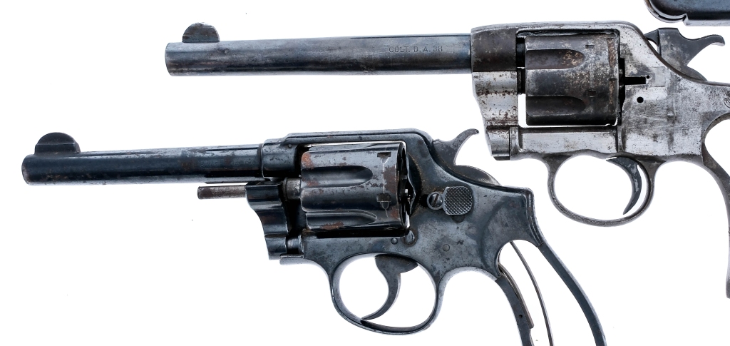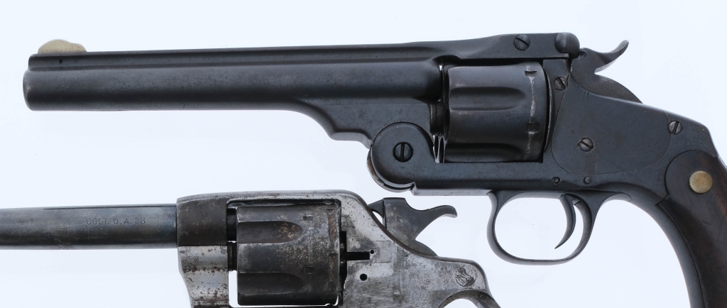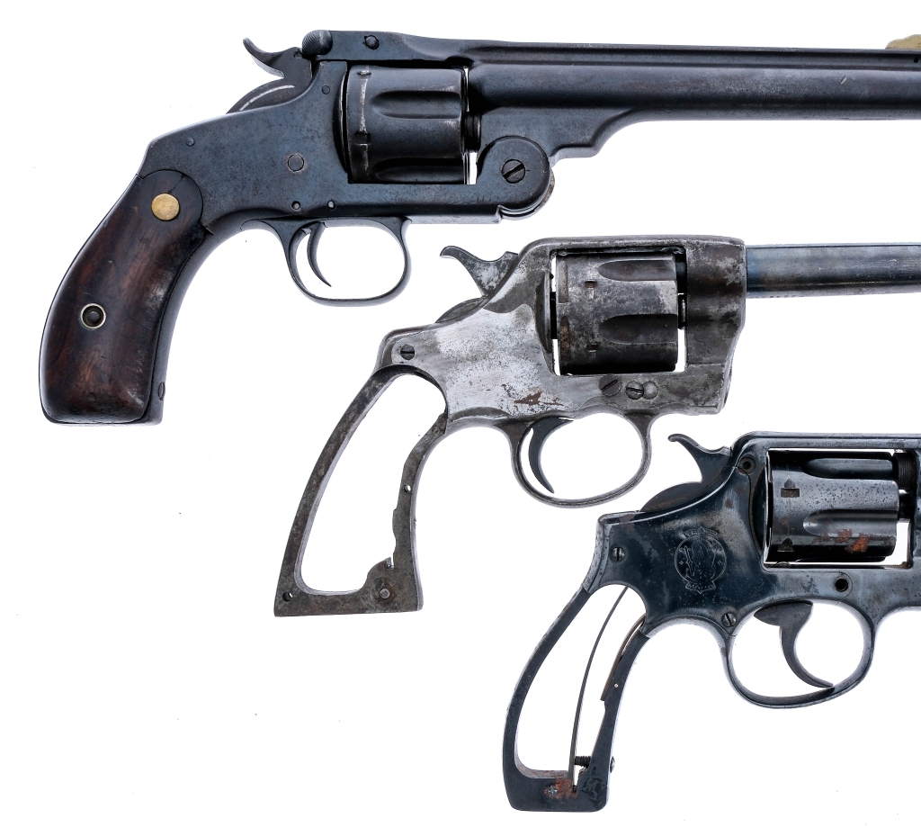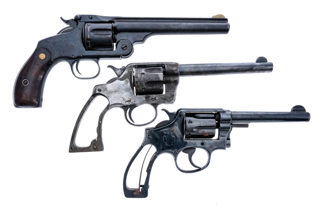 Description This lot is for three revolvers. Smith & Wesson No. 3 in .44 S&W American with a six round capacity and a 6.5″ barrel. Smooth wood grip plates. Finish worn frame, cylinder and barrel. Rear notch and front fixed blade sight. Colt Double Action in .38 Long Colt with a six round capacity and a 6″ barrel. Missing grip plates. Finish worn blued frame, cylinder and barrel. Rear trench and front fixed blade sight. Smith & Wesson 38 Military & Police 1st Model in .38 S&W Special with a six round capacity and a 5″ barrel. Missing its grip plates. Refinished blued frame, cylinder and barrel. Rear trench and front fixed blade sight. The Colt and M&P 1st Model must ship to a C&R or FFL holder and the S&W No. 3 is Antique No FFL required and ships to Most buyers home. Condition: Poor with scratches, finish wear/loss, rust and broken/missing parts. The The two without grips do not function. All three have spots of rust and pitting to the rifled bores. SOLD AS-IS. Barrel Length: 5″ 6.5″ 6″ Serial: 245670 1633 14159 Manufacturer: Colt Smith & Wesson Caliber: .38 LC .38 S&W .44 S&W American Model: No 3 DA 38 38 M&P 1st Model Book# 05673 06026